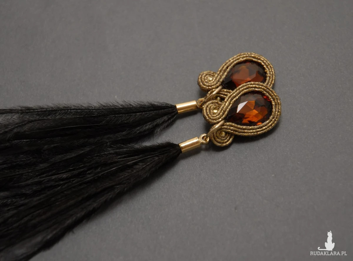 oferuję kolczyki lub klipsy zrobione techniką sutasz, ozdobione fasetowanymi, szklanymi kaboszonami i delikatnymi piórami. Sznurek jest opalizujący.