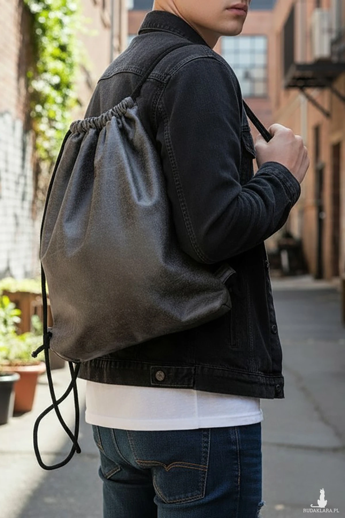 Plecak worek wykonany z grafitowej miękkiej ekoskóry.