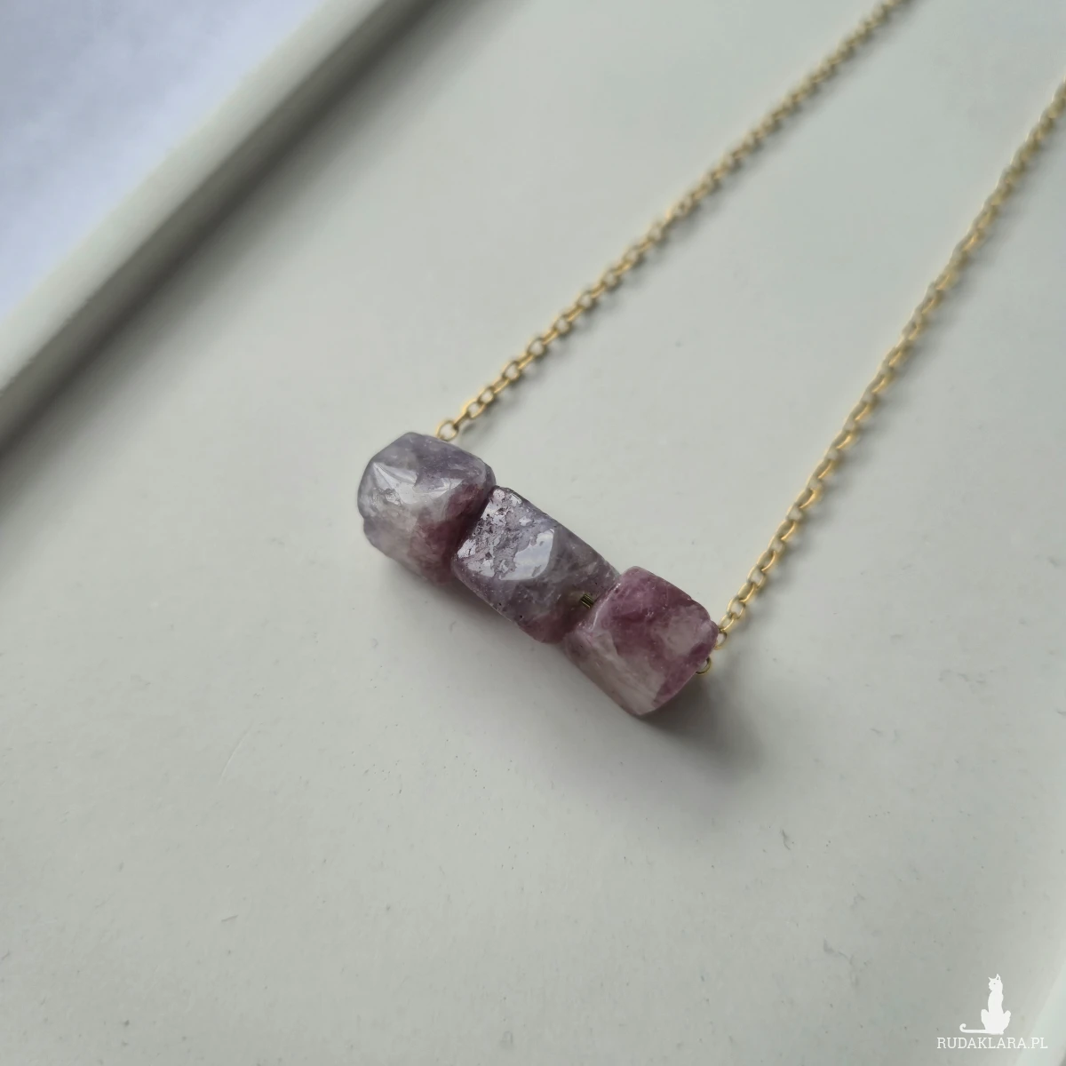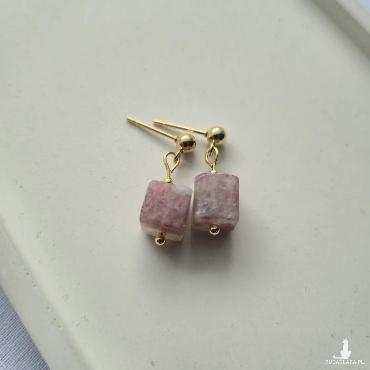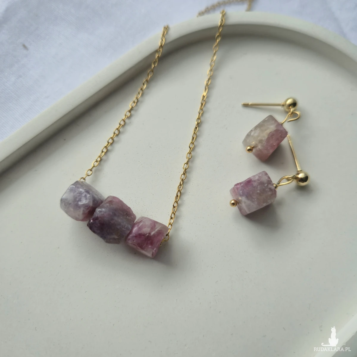 Delikatny, subtelny zestaw biżuterii z przepięknym, różowo fioletowym turmalinem w kształcie nieregularnych, surowych kostek.