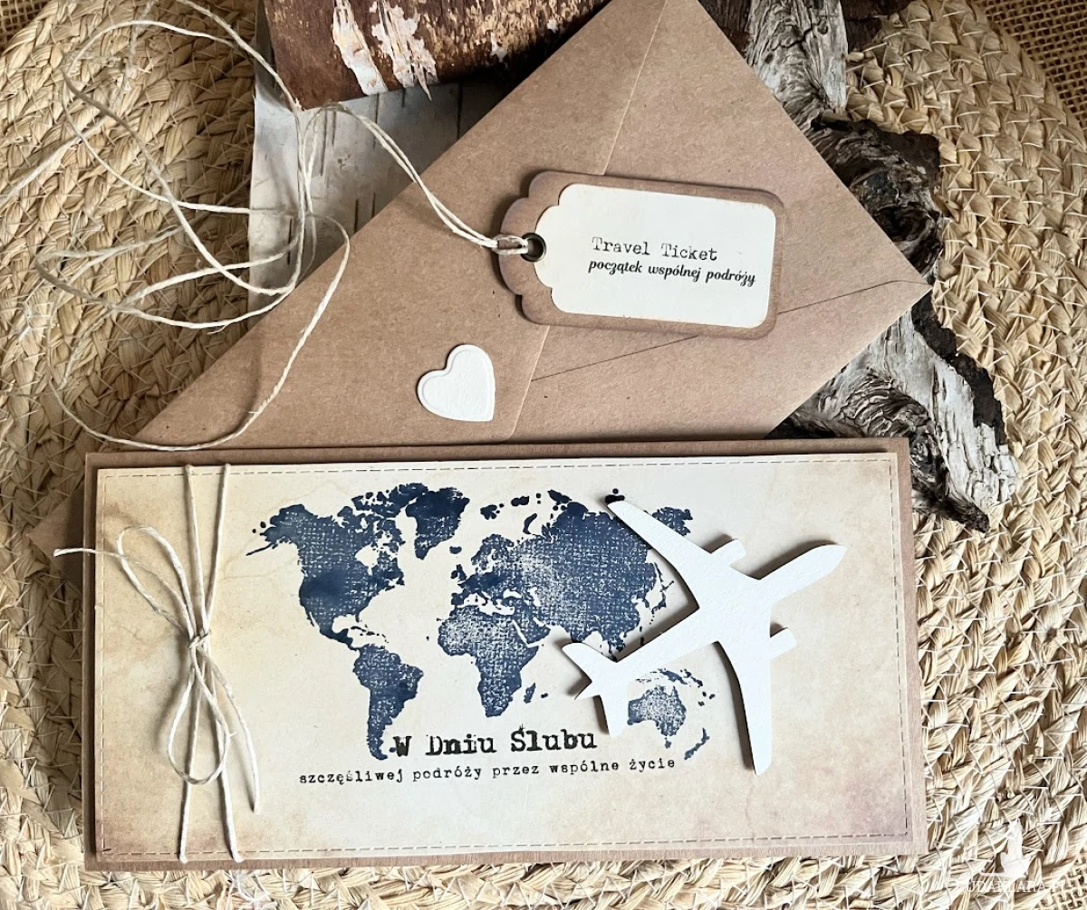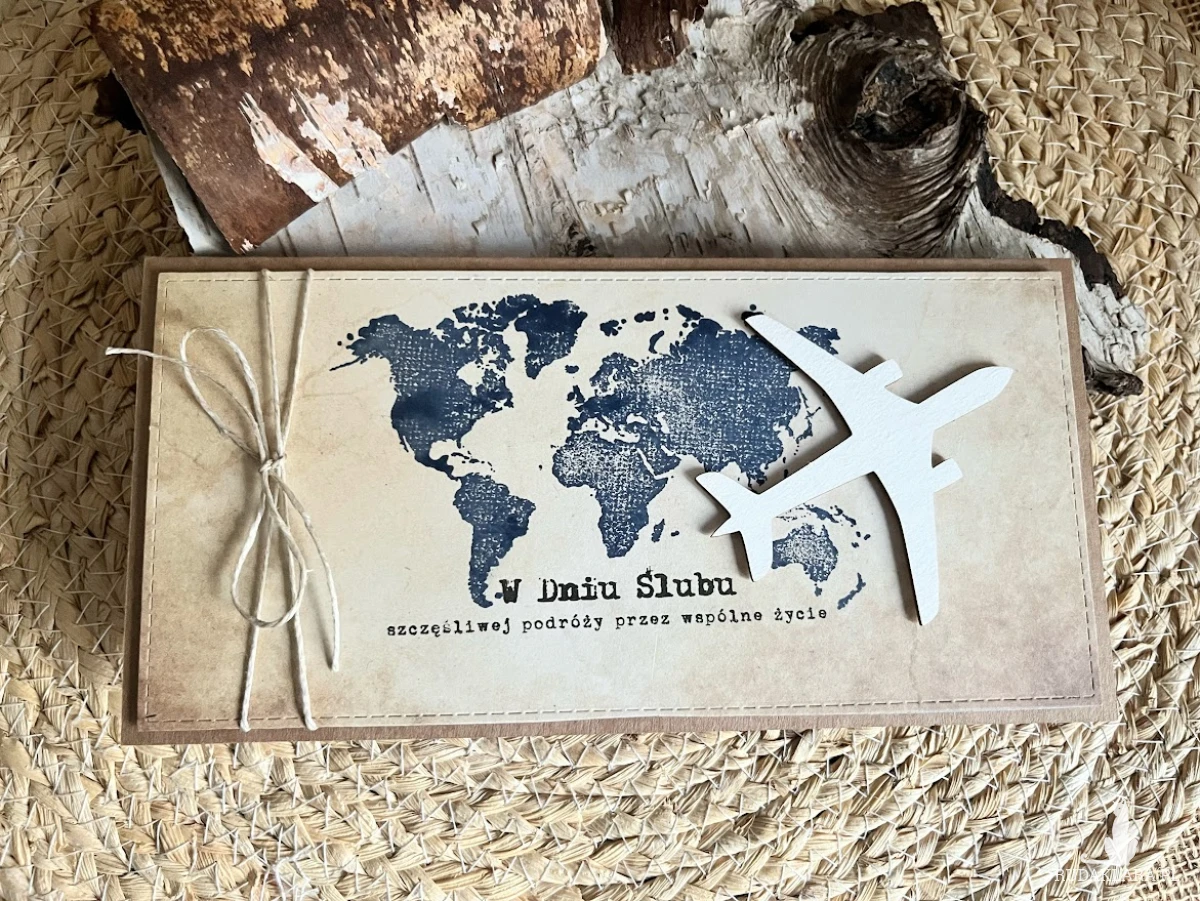 Kartka z okazji Ślubu do koperty dla Młodej Pary , która kocha podróże i wybiera się w szczęśliwą podróż przez wspólne życie z urokliwym samolotem. Komplet stworzony na bazie papieru kraftowego nadając kompletowi klimat eco. Kartka ma wymiary 21 x 10 , koperta ma wymiary 22 x 11. Całość obwiązana sznurkiem z tagiem - biletem .W środku kartki znajdują się gotowe życzenia do własnoręcznego podpisu oraz umieszczono kieszonkę na małe co nieco lub kupon lotto W tej postaci produkt dostępny od ręki .Pozdrawiam