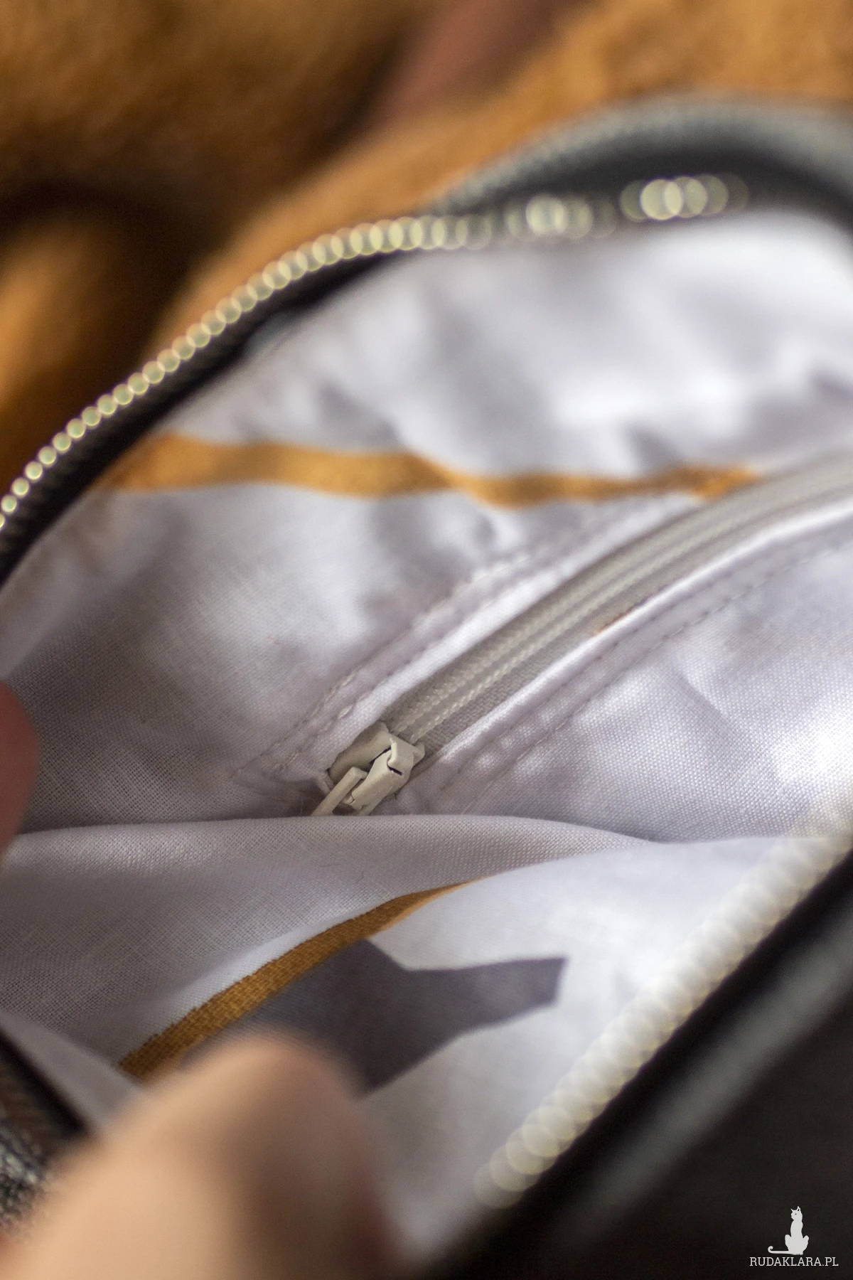 Małe zaszewki na dnie. Z tyłu oraz w środku torebki kieszonki zapinane na suwak. Środek wykończony bawełnianą podszewką.