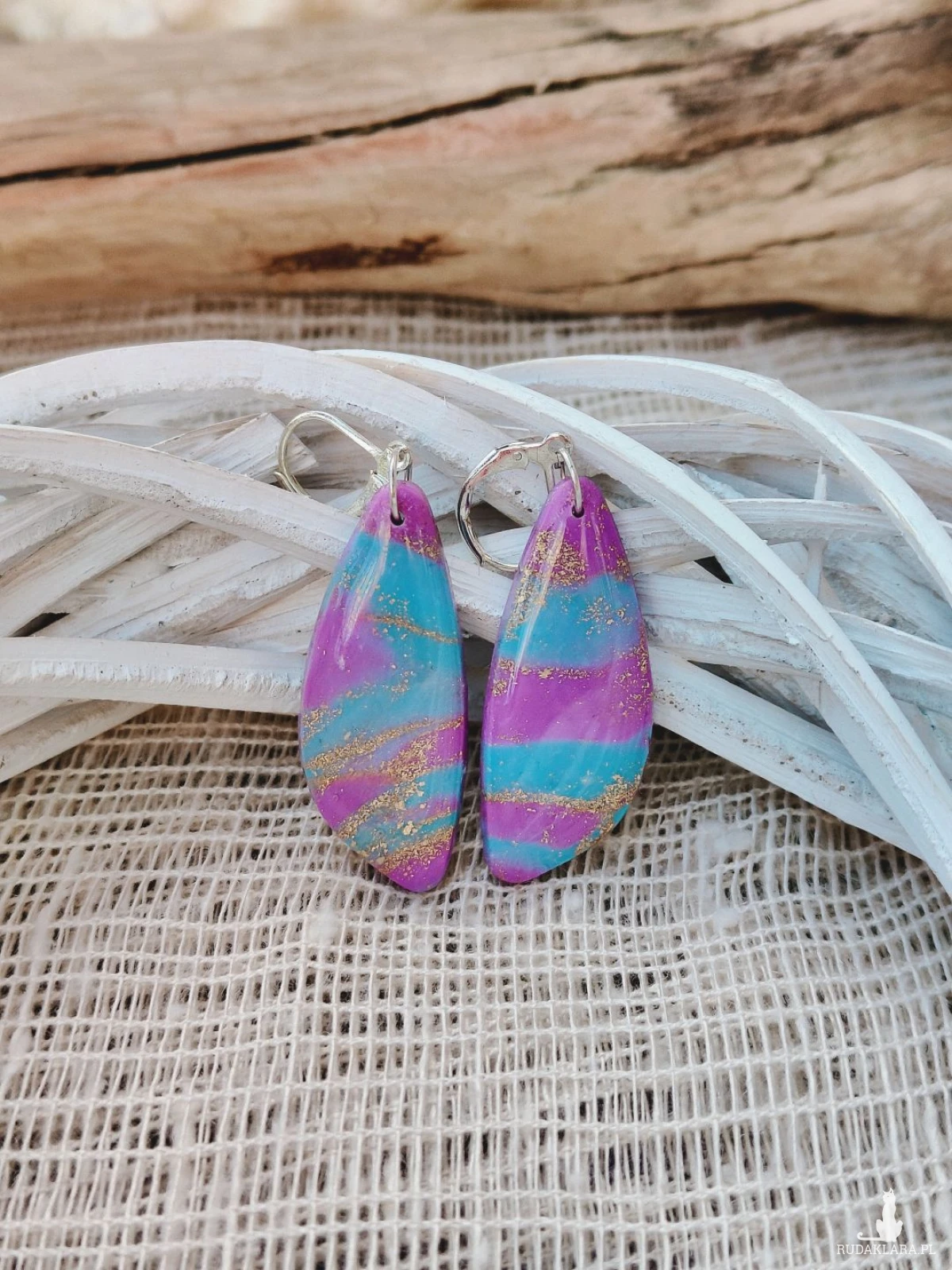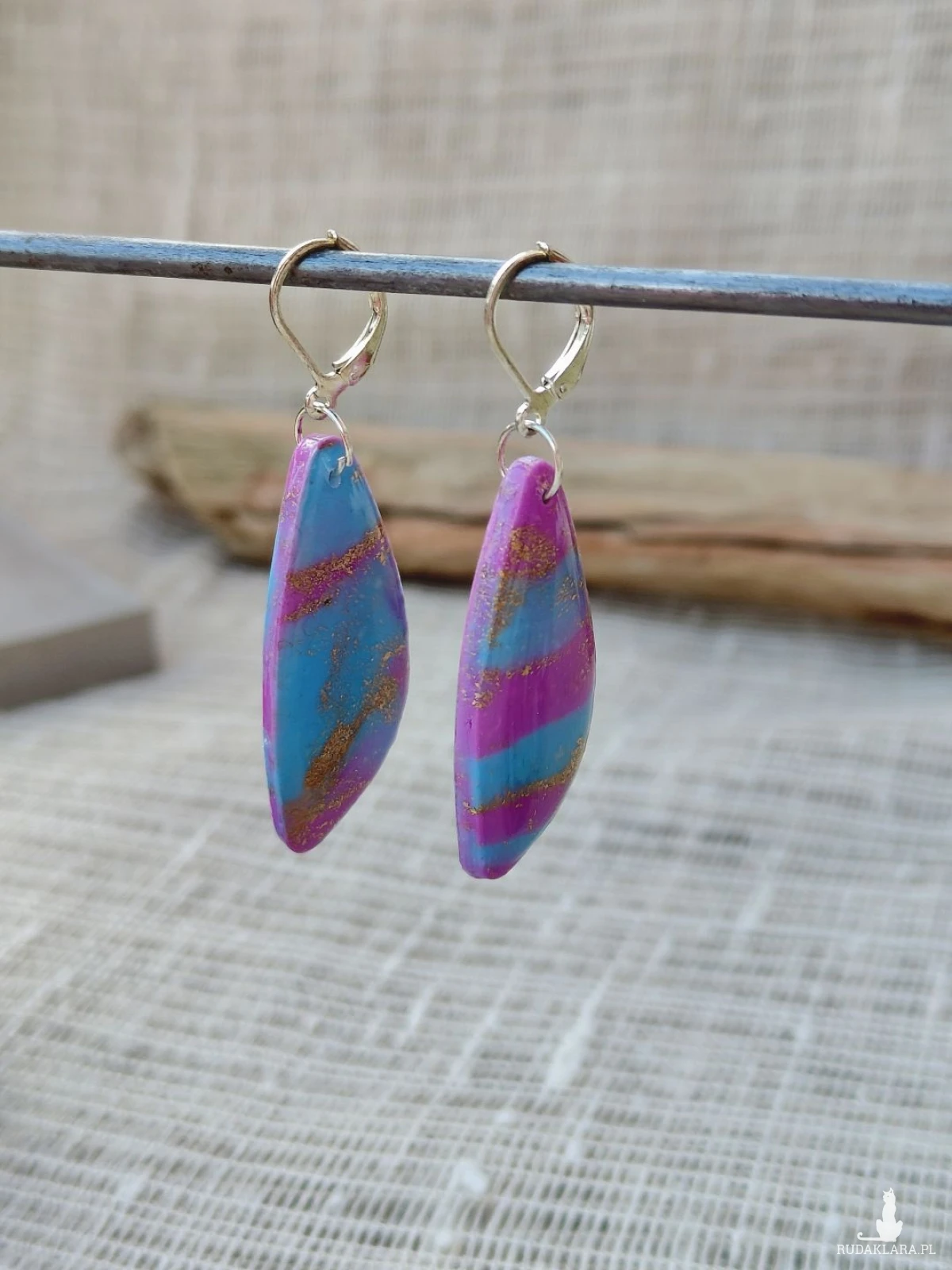Unikalne, ręcznie wykonane kolczyki, które przyciągają spojrzenia dzięki hipnotyzującemu połączeniu intensywnego fioletu i turkusu, przełamanych subtelnymi złotymi akcentami. Każda para jest tworzona z dbałością o najmniejszy detal, a warstwa żywicy nadaje im efekt szklistości i wyjątkowej głębi koloru. Idealne dla osób, które lubią wyróżniać się oryginalną biżuterią i cenią rękodzieło z charakterem. Doskonale sprawdzą się zarówno na co dzień, jak i jako wyrazisty dodatek na specjalne okazje.