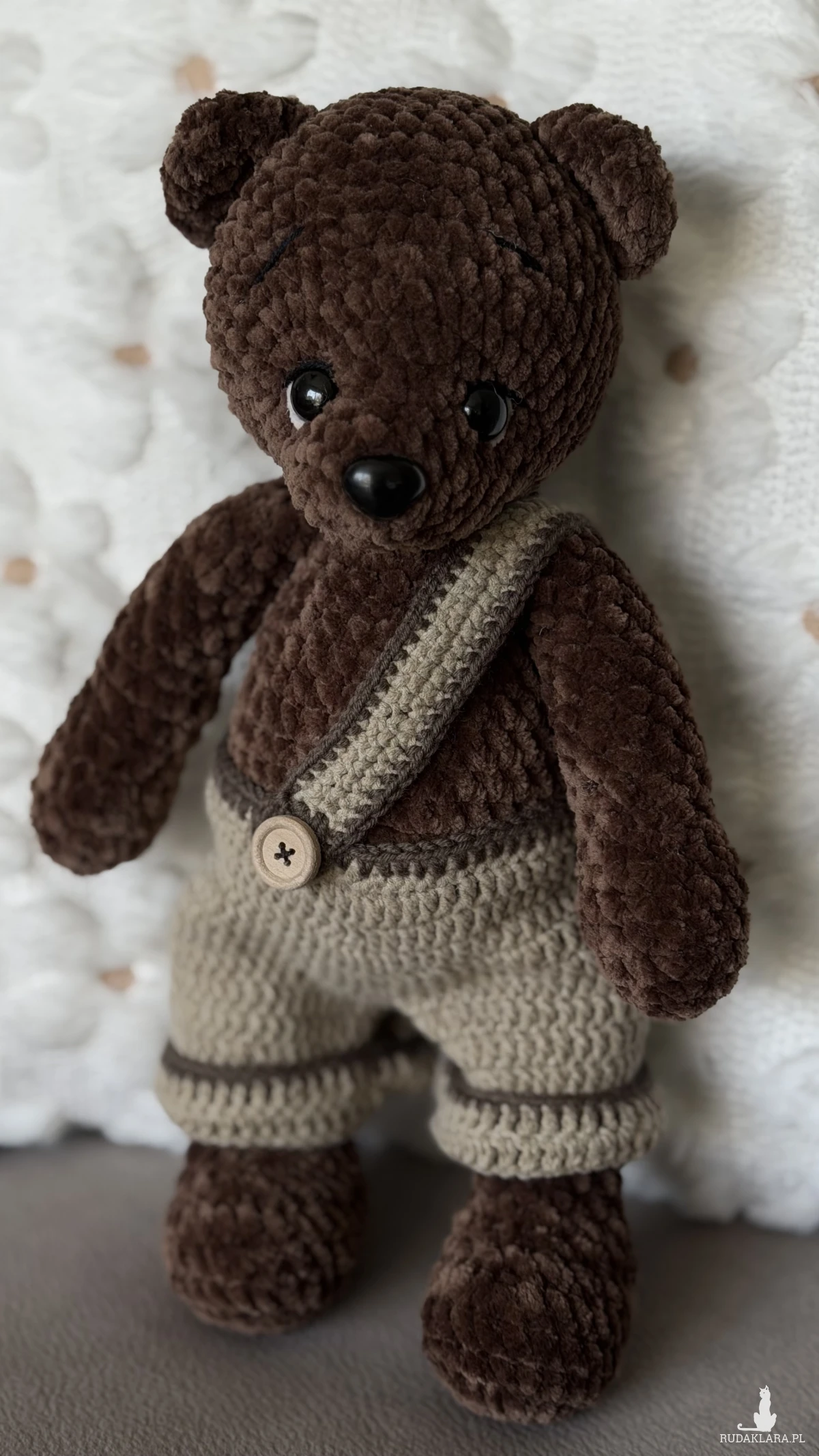 Miś Hugo to miękki, ręcznie szydełkowany pluszak wykonany z pluszowej włóczki Dolphin Baby. Jego ciepły, brązowy kolor i urocze ubranko w stylu retro sprawiają, że idealnie nadaje się do przytulania, dekoracji pokoju lub jako wyjątkowy prezent.