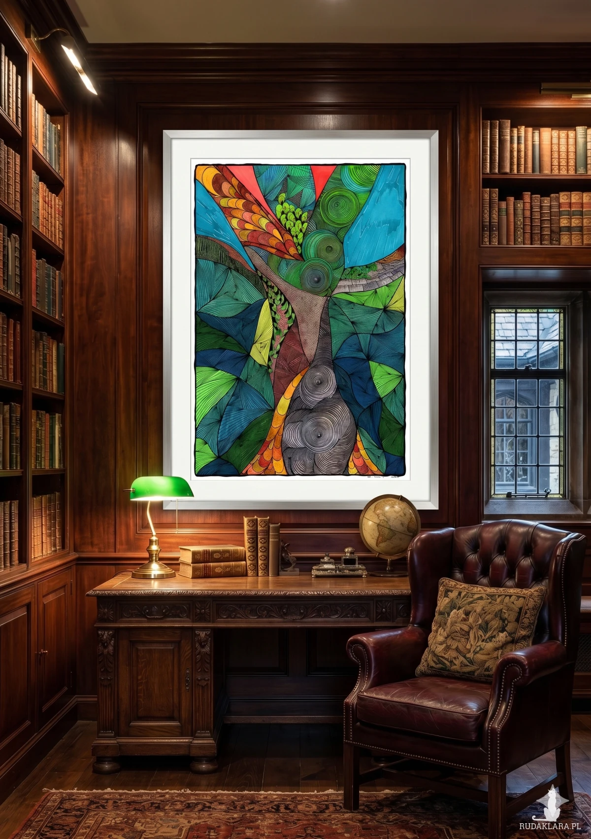 W centrum dominuje forma drzewa, które otacza dynamiczny układ kształtów w zieleni, błękitach, żółciach i czerwieniach.