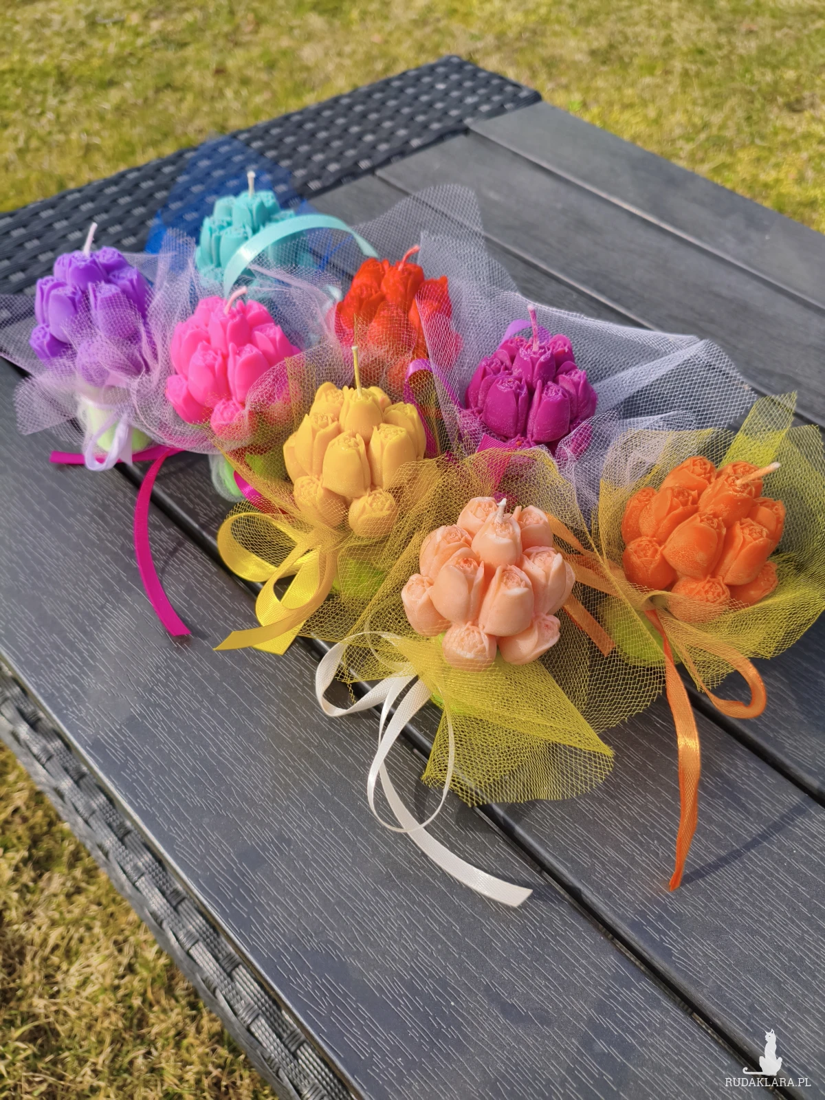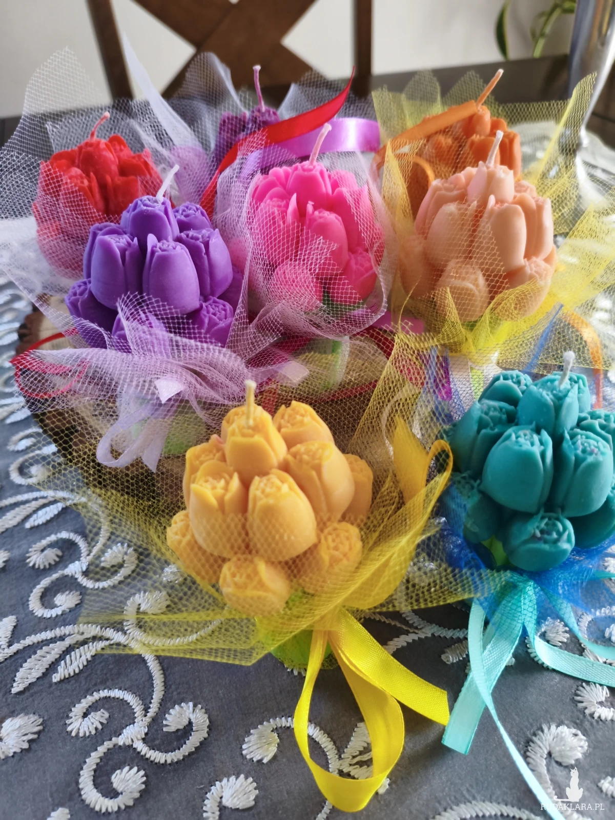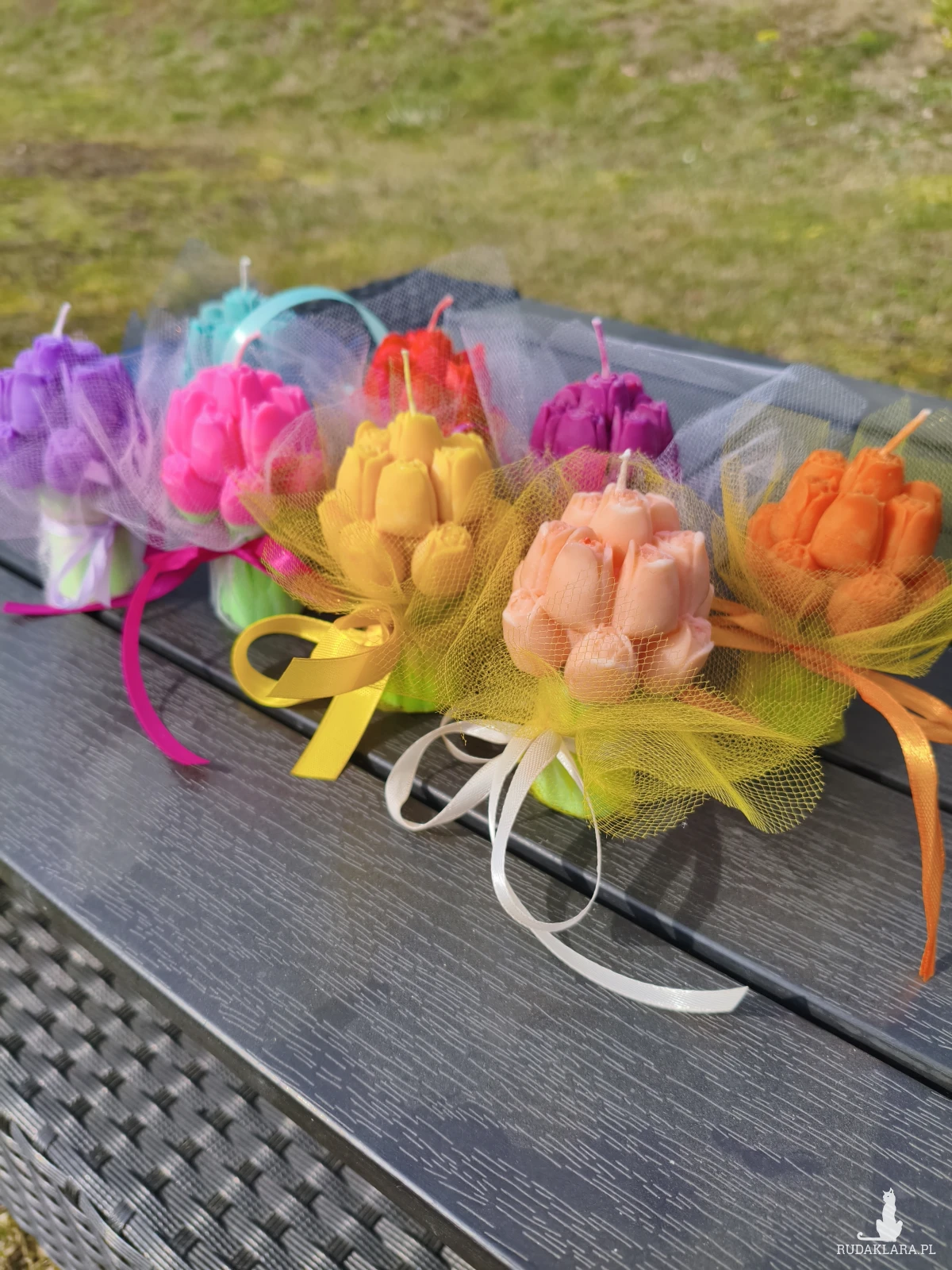 Sprzedam ręcznie wykonaną świecę w kształcie bukietu tulipanów z wosku sojowego w dostępnych kolorach z aromatem róży z nutką maliny. Waga świecy wynosi ok 90 g wysokość 10 cm i średnica 7 cm. Czas palenia świecy wynosi ok 5 h.