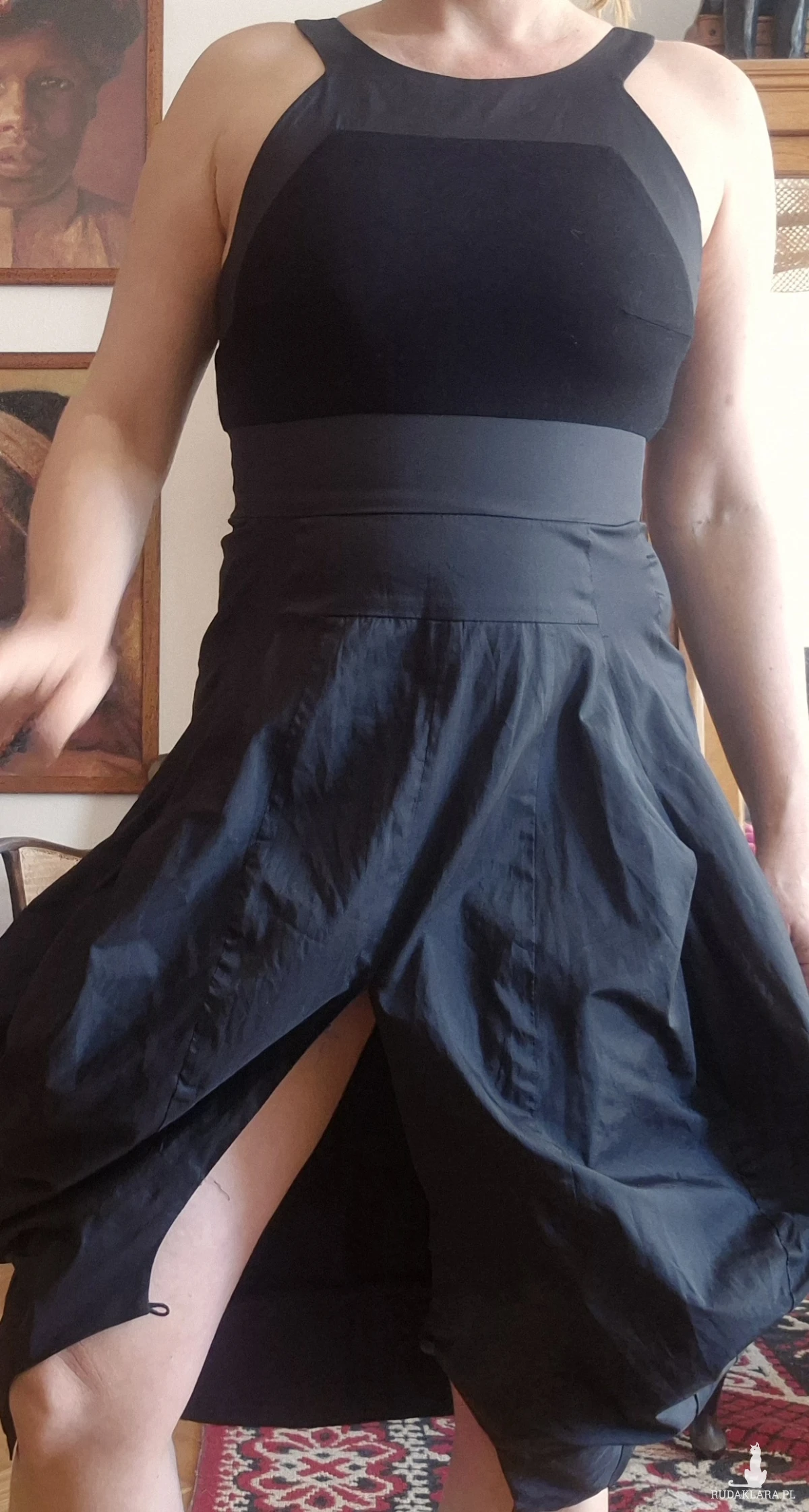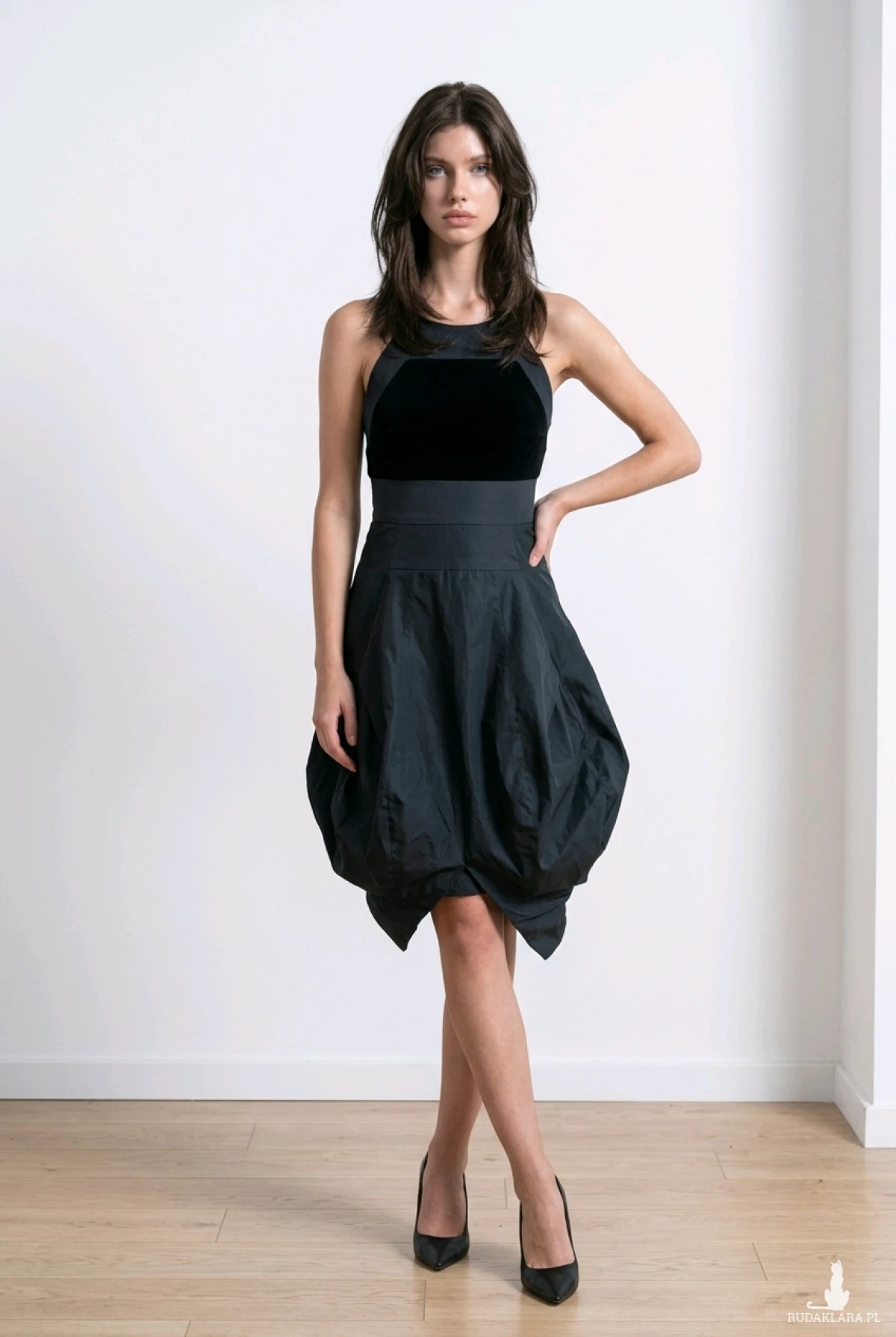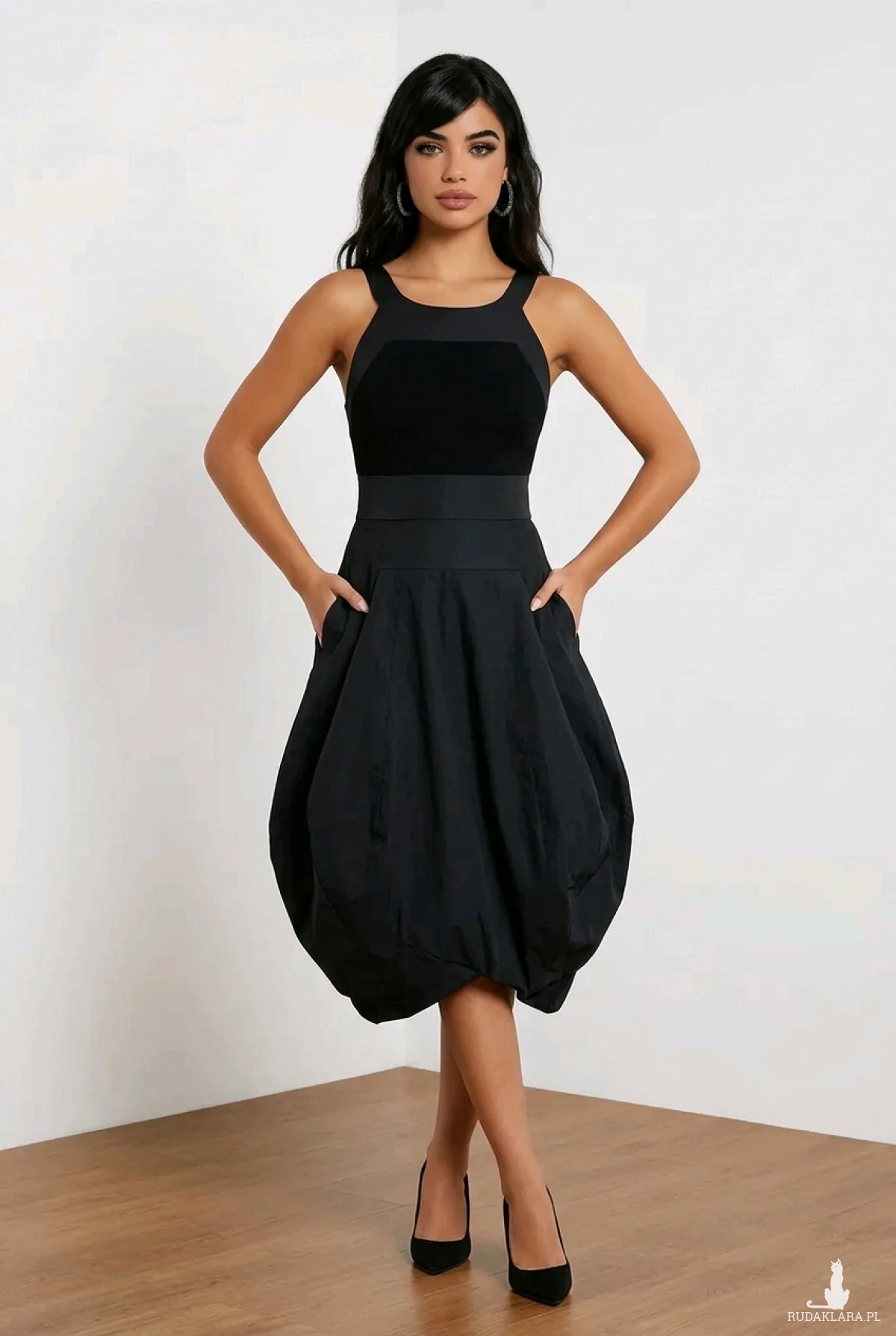 Czarna sukienka rozmiar 36 długość całości od ramiączek 110 cm pas mielony na płasko 36 cm firma kontrast sukienka zapinana na guziczek z przodu z tyłu na zamek bardzo zgrabna można ją nosić rozpiętą do spodni materiał poliester wiskoza i elastan