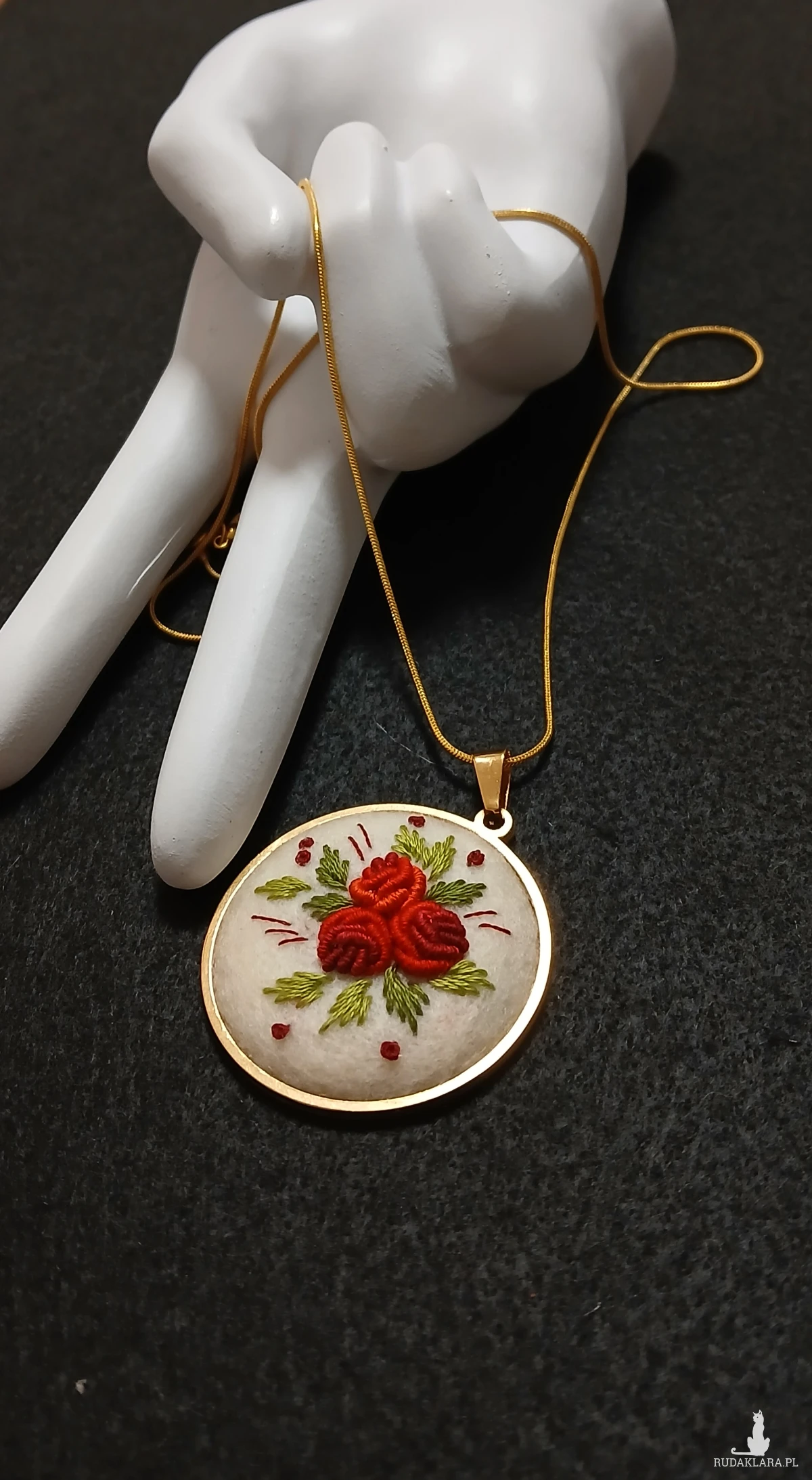 Perfekcyjnie dopracowany haft na filcu wykonałam polską bawełnianą muliną za pomocą igły. Jest on zabezpieczony impregnatem do tkanin, ale po dłuższym użytkowaniu można go odświeżyć przy pomocy delikatnego mydła i letniej wody.