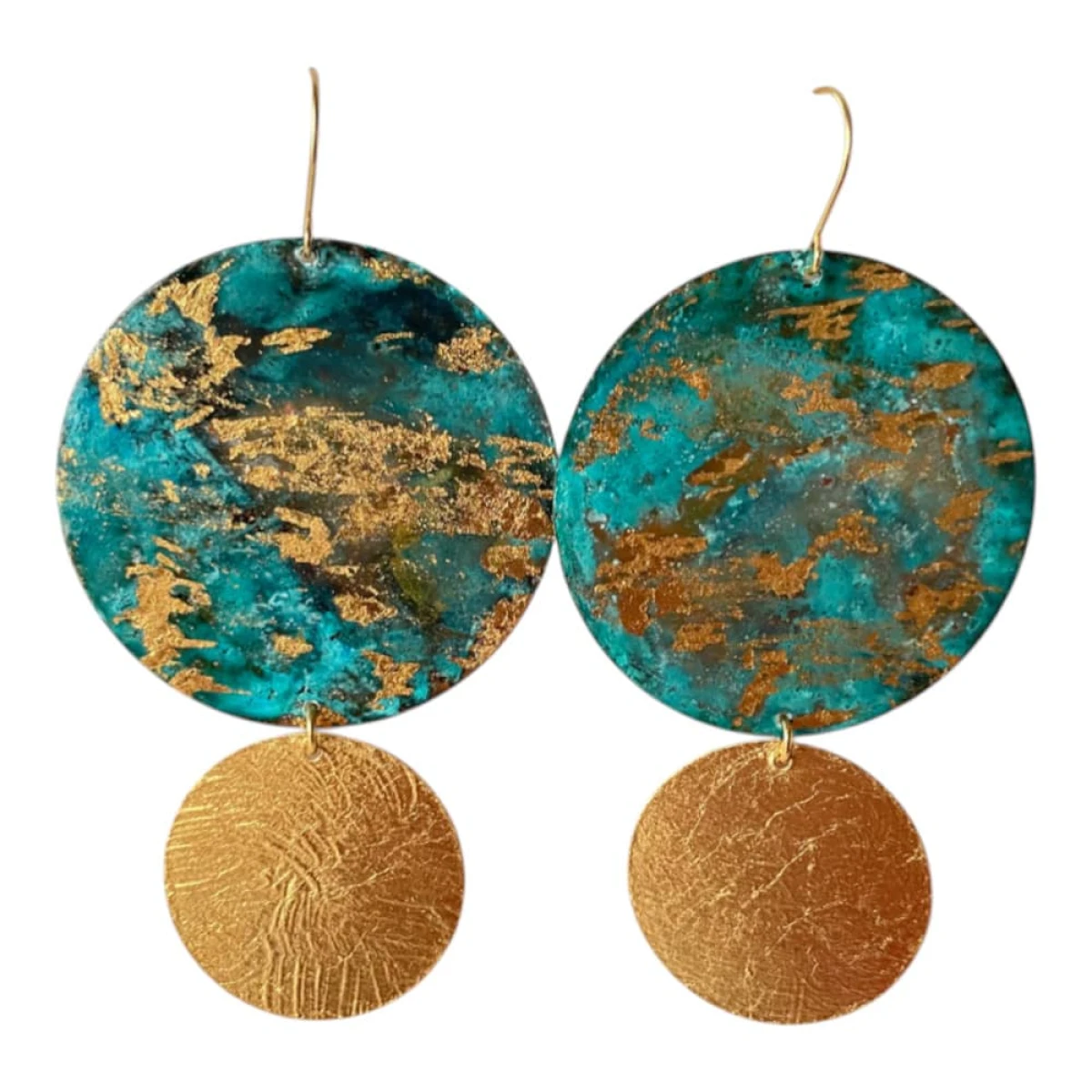 To model, w którym chłodne i ciepłe tony spotykają się w jednej formie. Górna część z patynowanej miedzi ma bogatą, wielobarwną powierzchnię z turkusami, zieleniami i złoceniami, a dolne koło z mosiądzu pozłacanego dodaje całości blasku.