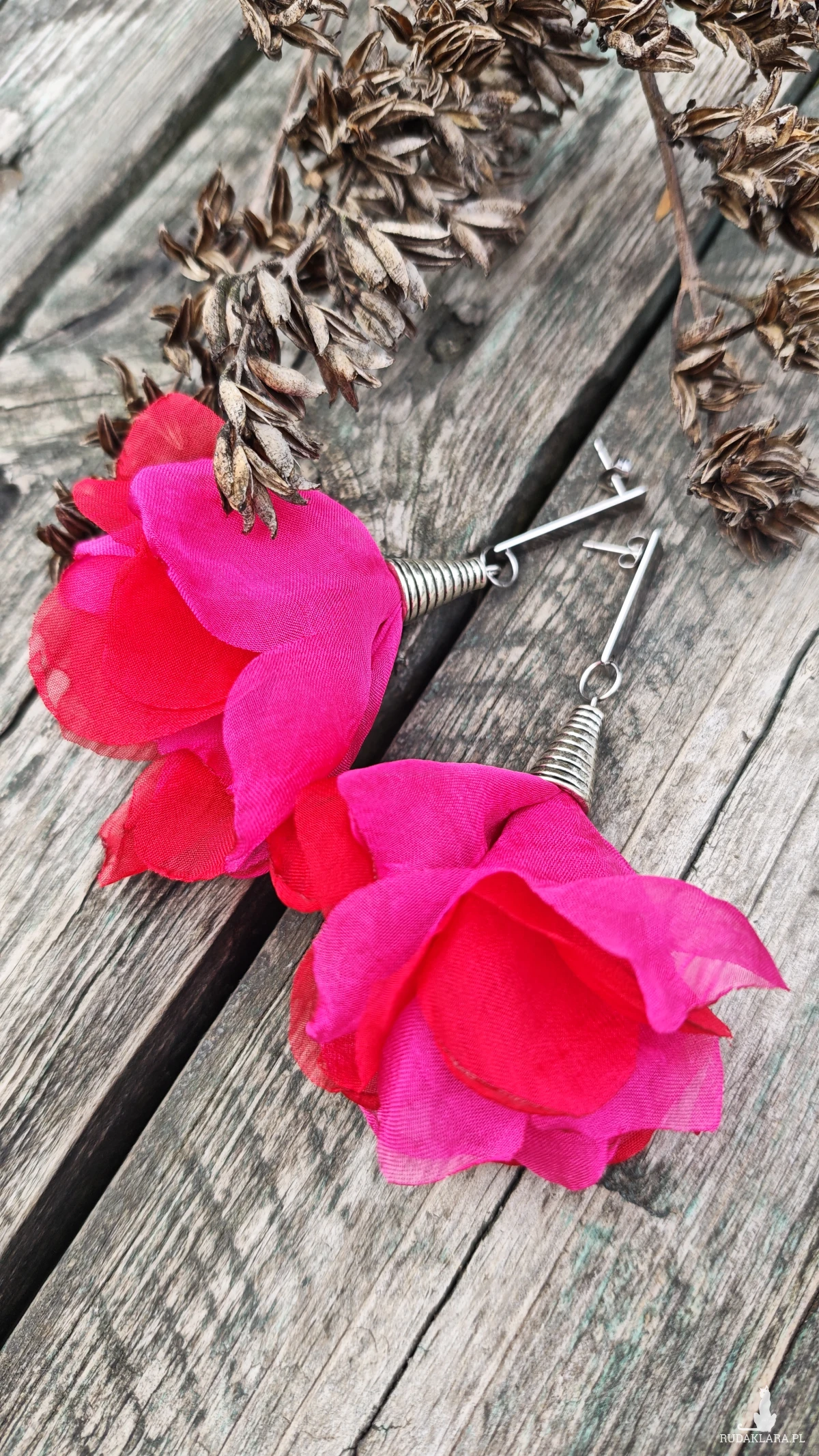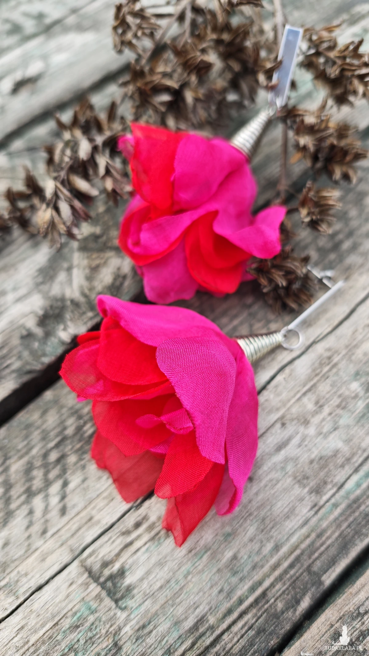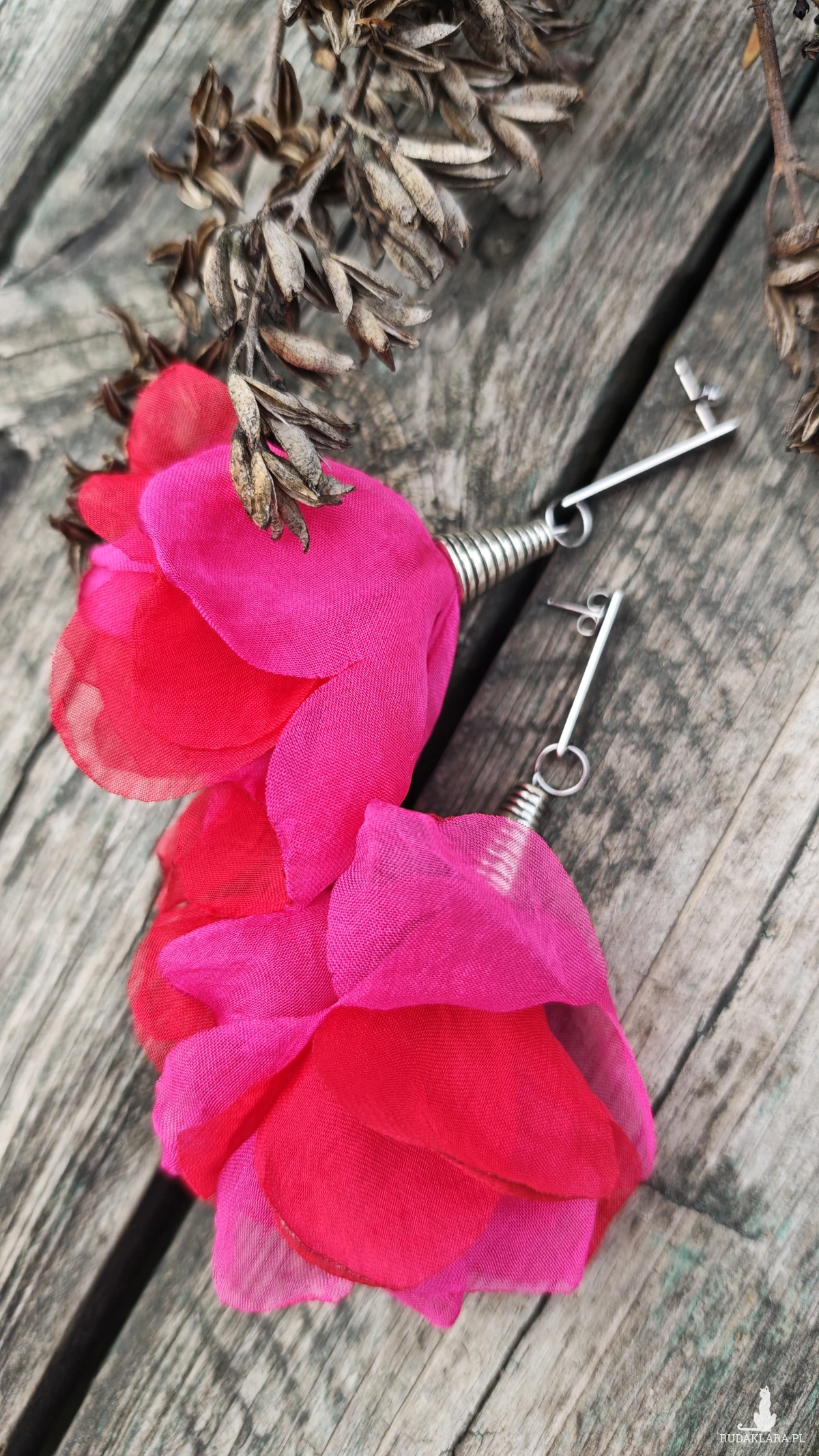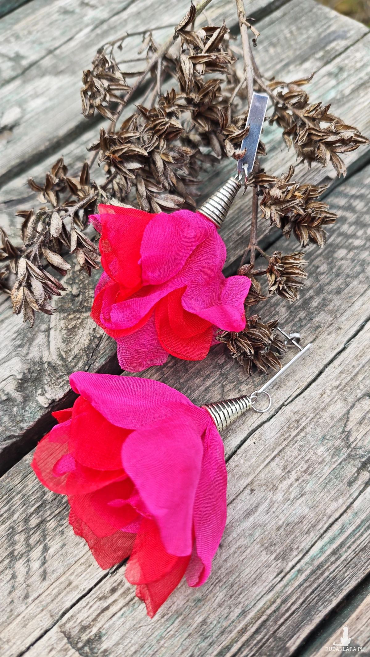 ,, baletnica w różu i czerwieni,, to zwiewne dwukolorowe kolczyki wykonane z dwukolorowego kwiatka z tiulu w kolorze czerwonym i różowym, a także z metalowych elementów w kolorze srebrnym. Kolczyki zawieszone są na ozdobnych biglach typu sztyft wykonanych ze stali szlachetnej.