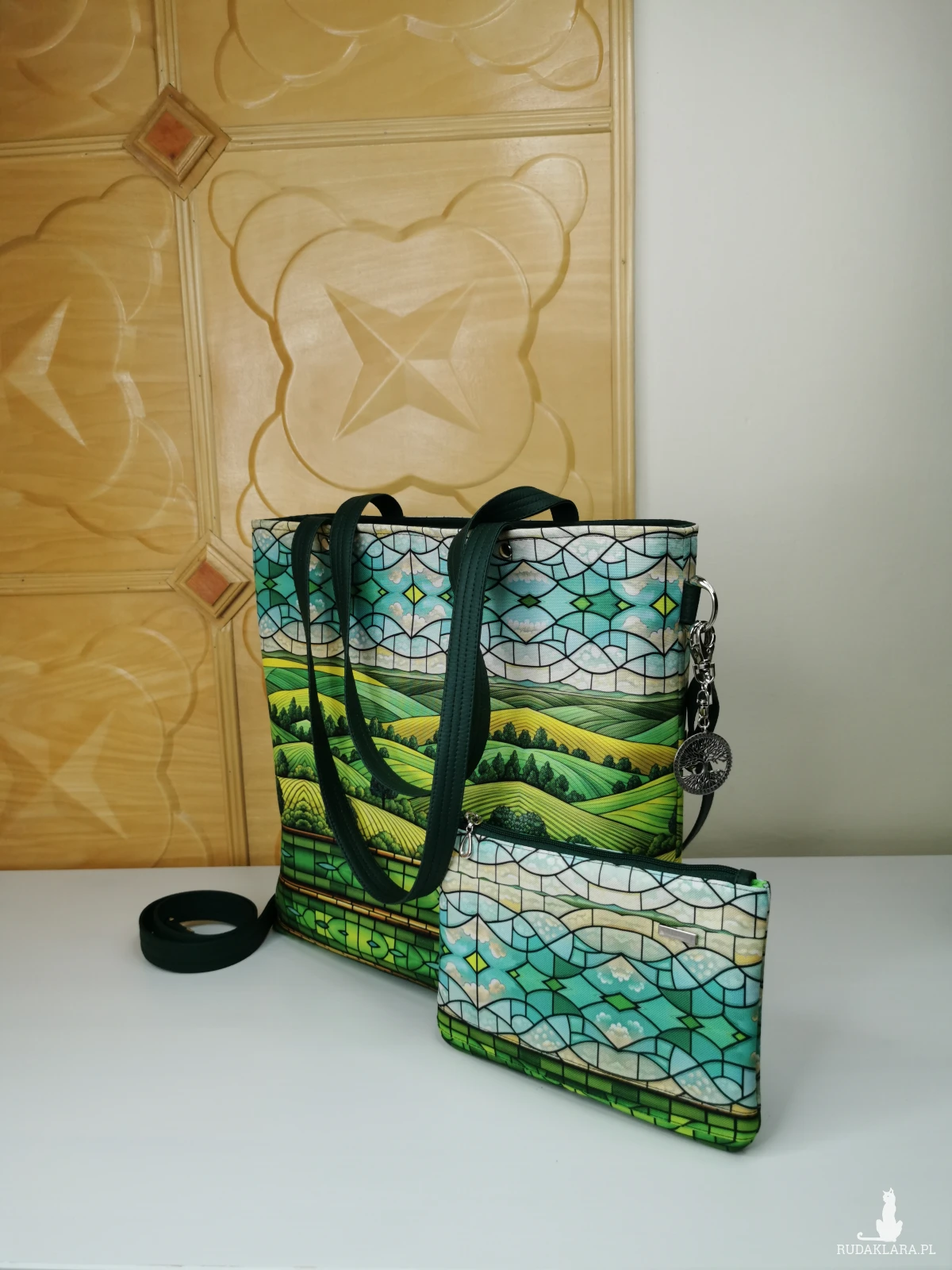 W zestawie praktyczna kosmetyczka, wykonana z tkaniny o właściwościach wodoodpornych, oraz brelok - drzewo życia.