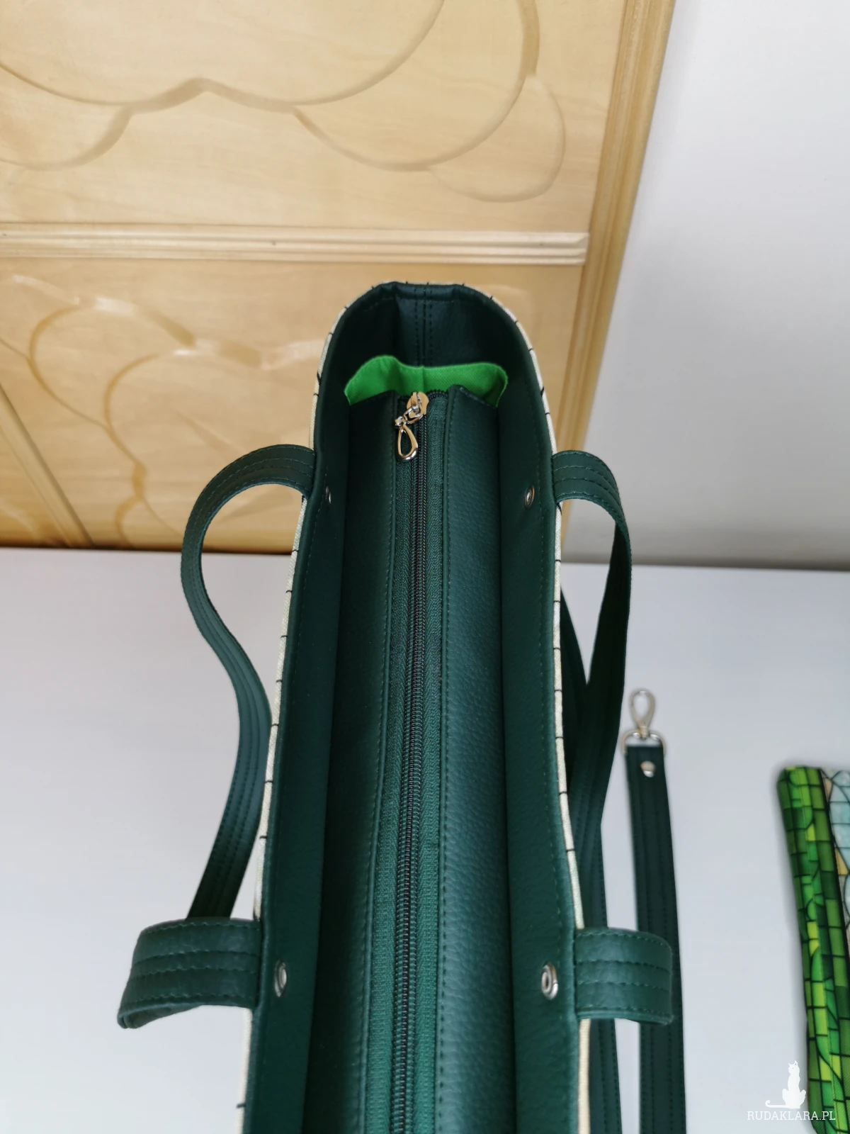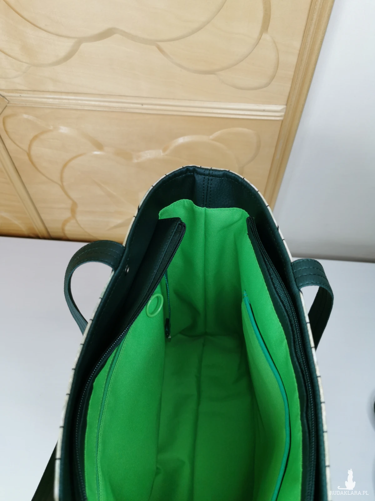 Wewnątrz gładka podszewka wodoodporna w kolorze zielonym, dwie pojemne kieszenie, na zamek i wsuwana.