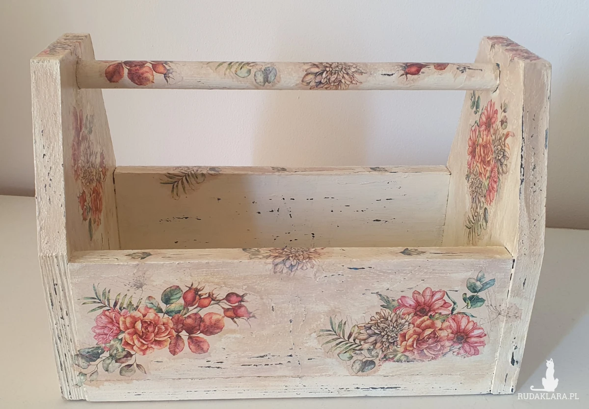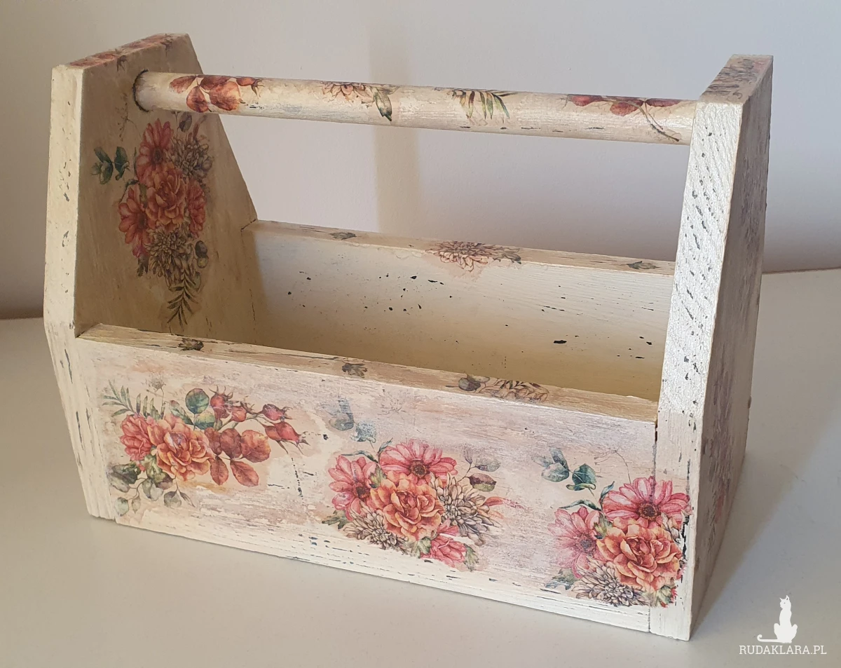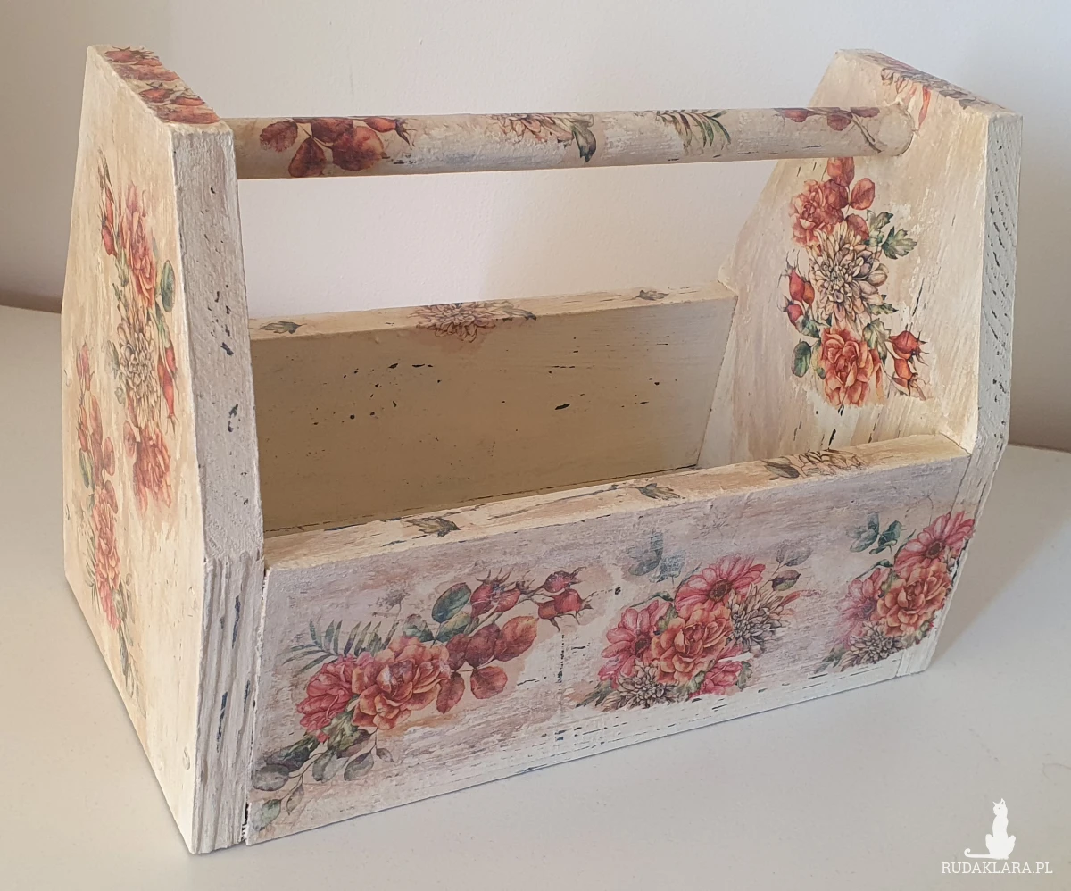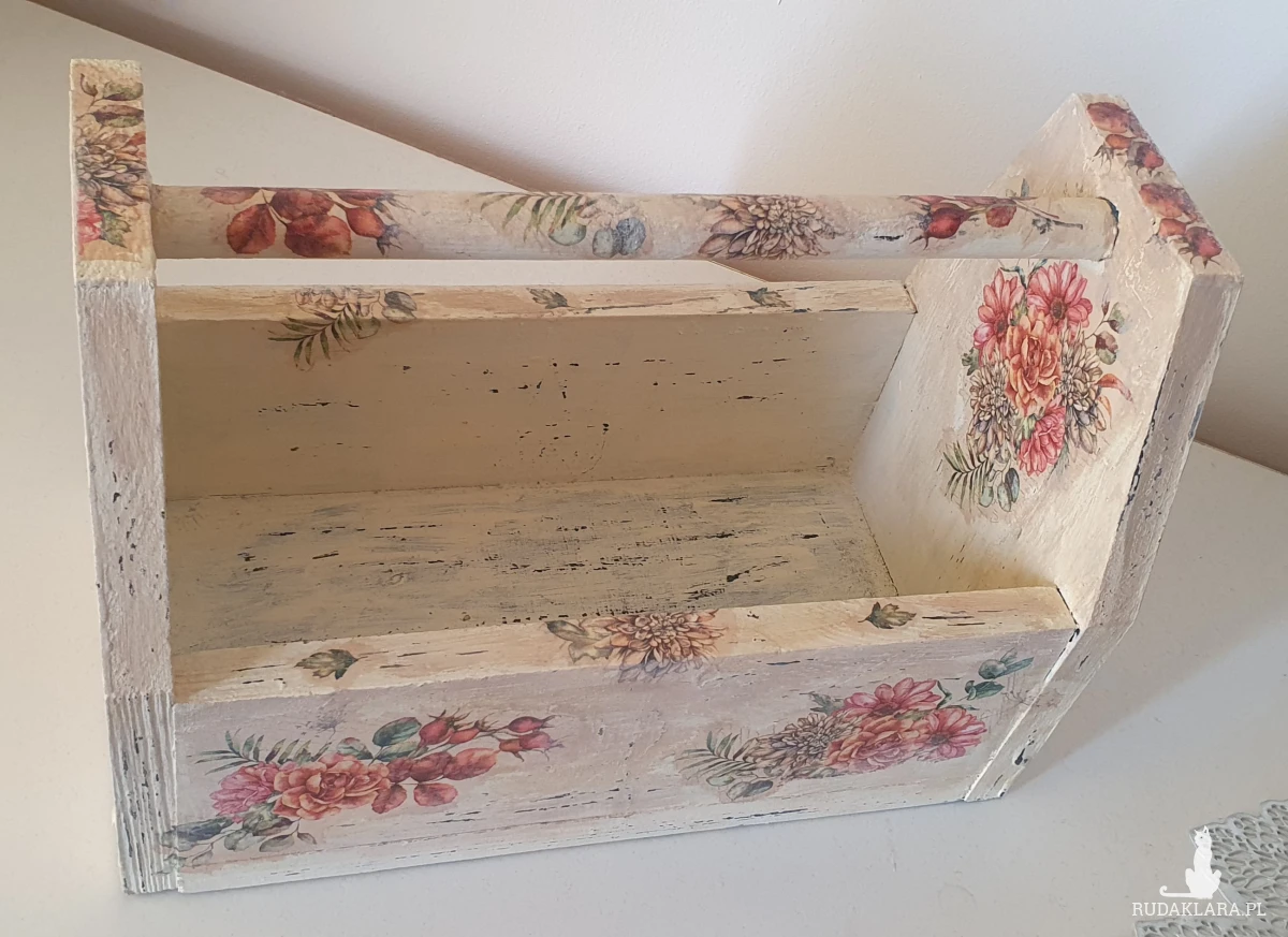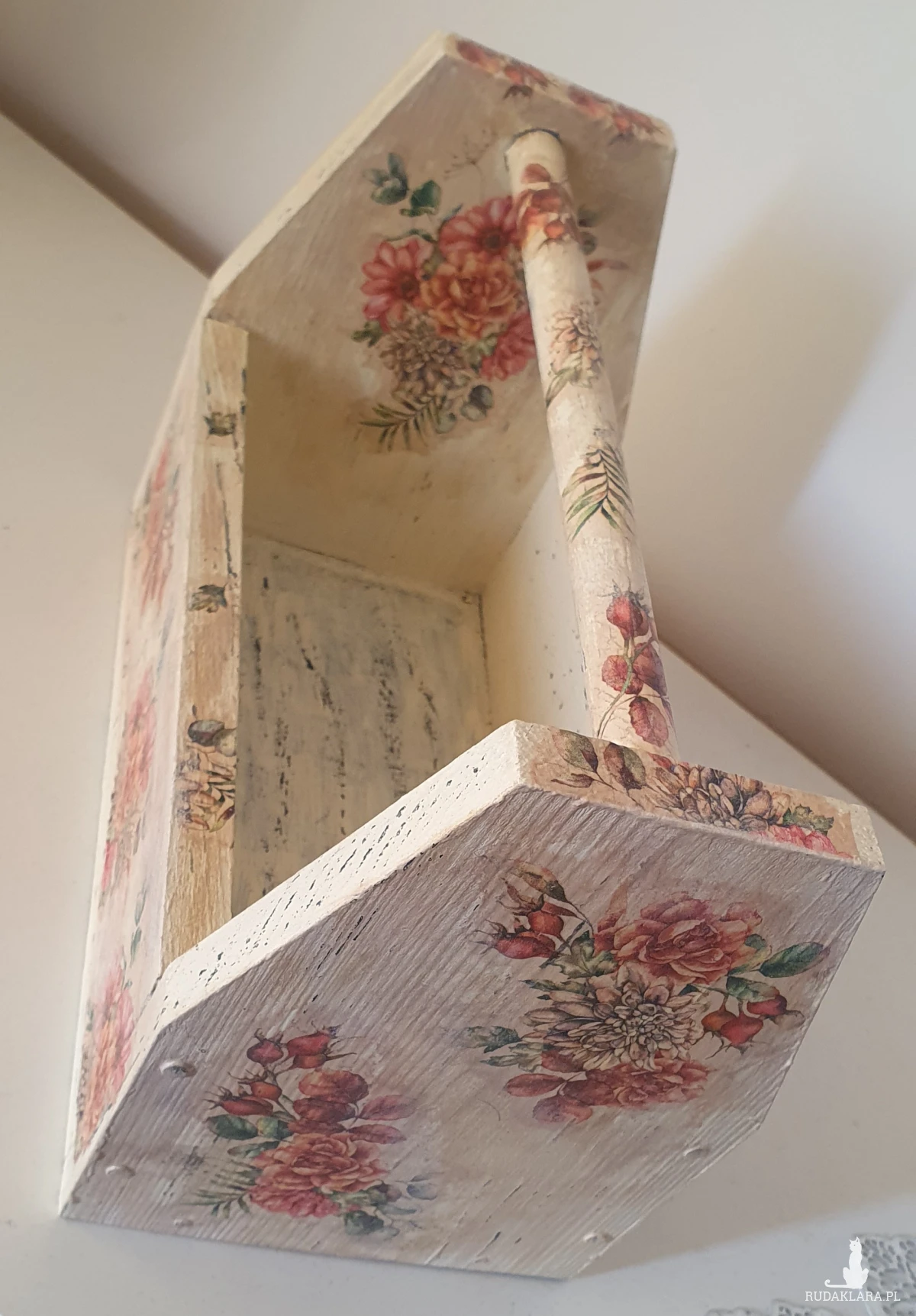 Wykonany metodą decoupage z wielką dbałością o szczegóły. Wygląda na stary, ale to sztuczka