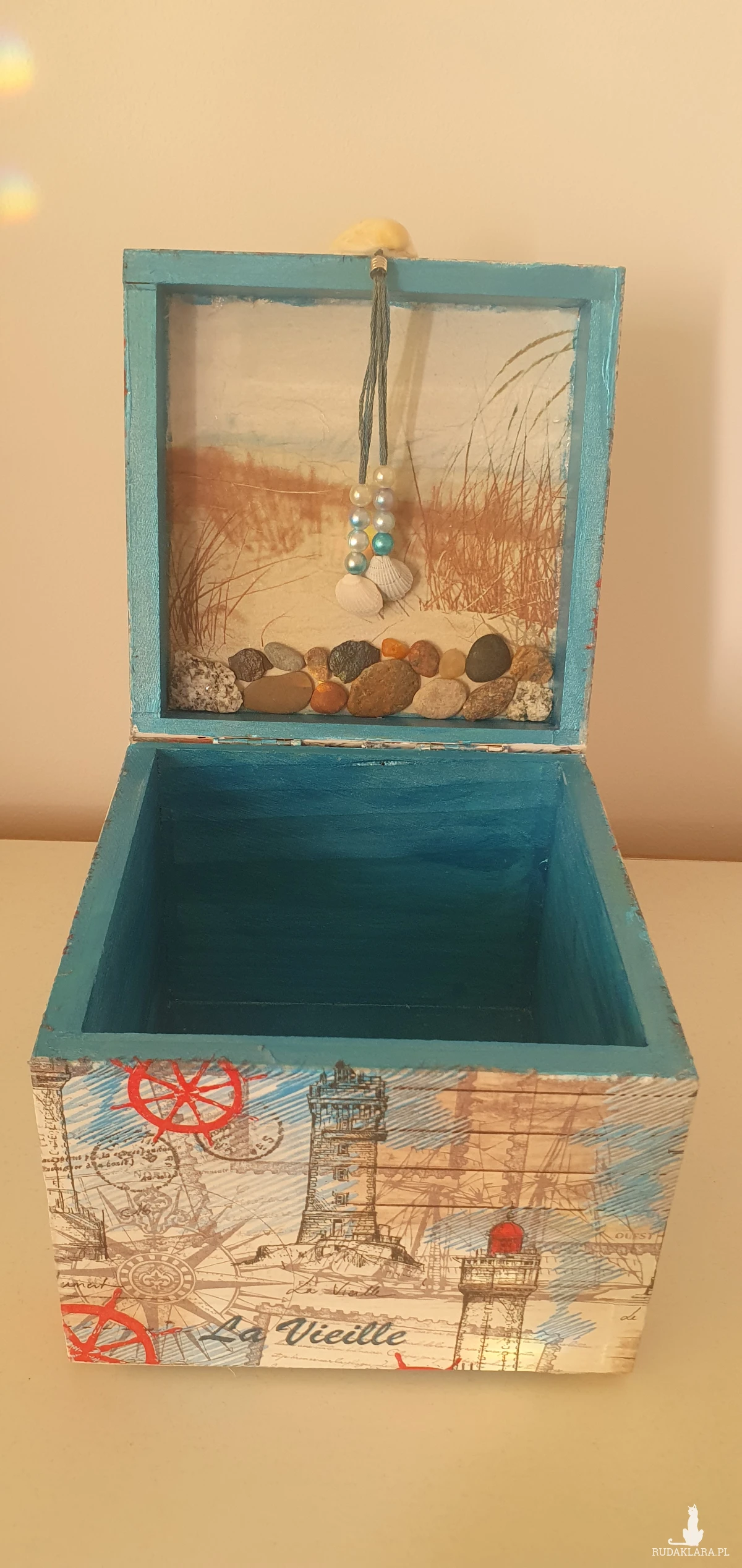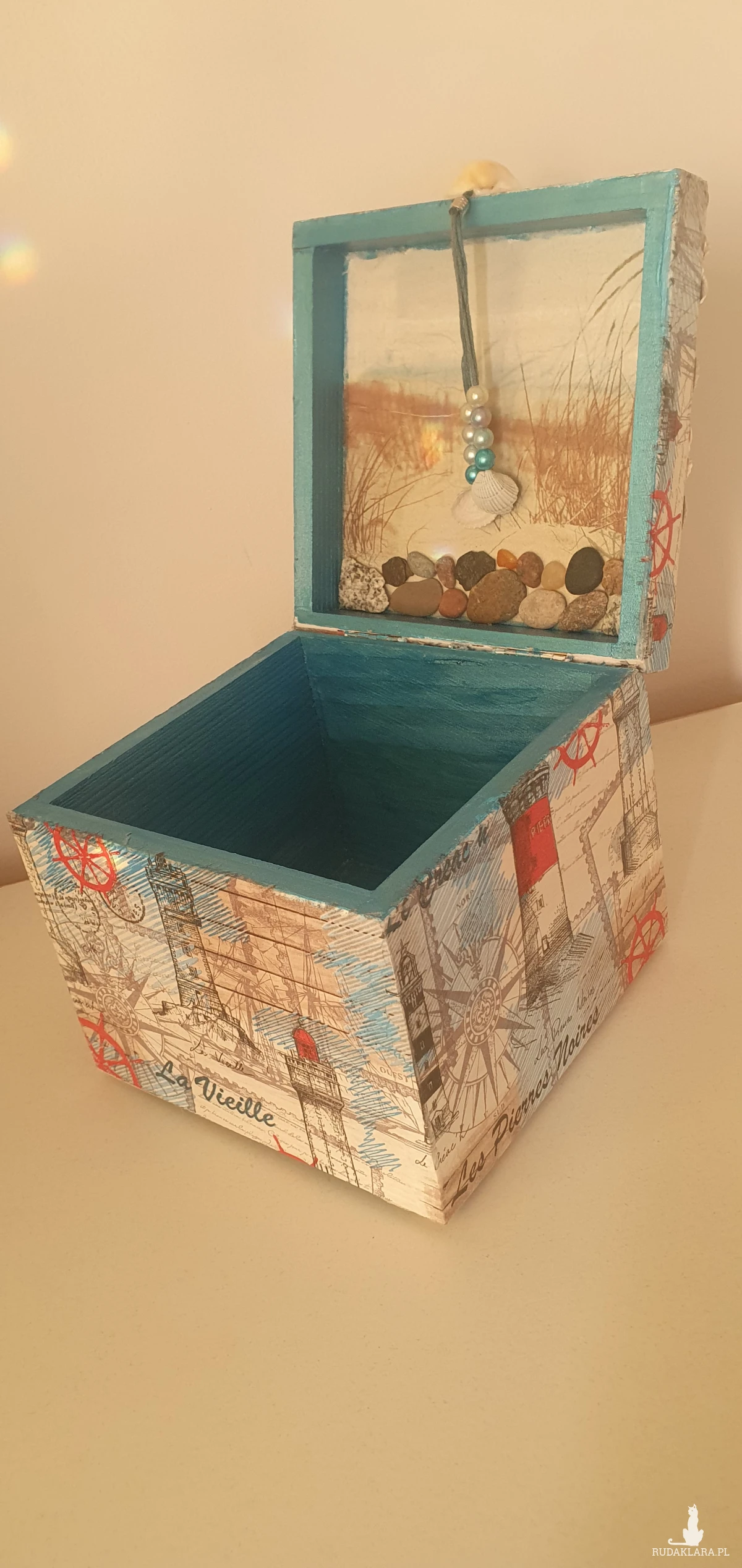 Sprzedam przepiękne drewniane pudełko zarówno dla dziecka jak i dorosłych. Dominuje tematyka morska. W tej skrzynce można przechowywać swoje skarby, biżuterię, drobiazgi, pamiątki takie jak bilety do kina czy tajemne liściki...