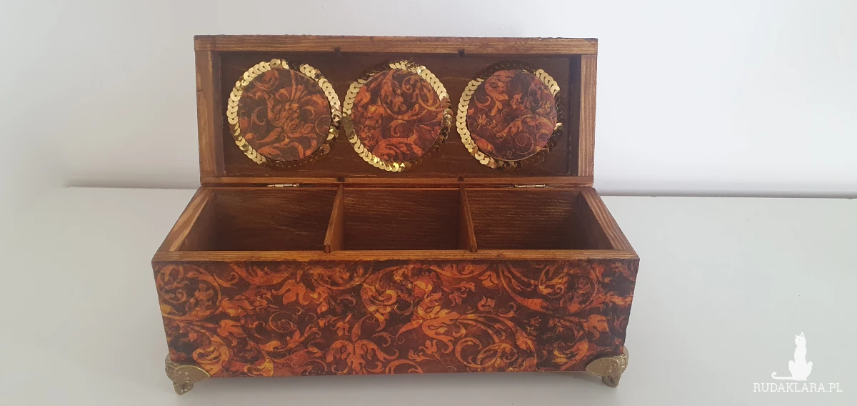 Sprzedam przepiękne drewniane pudełko z przegródkami. Może służyć jako herbaciarka, szkatułka na biżuterię, drobiazgi czy inne skarby