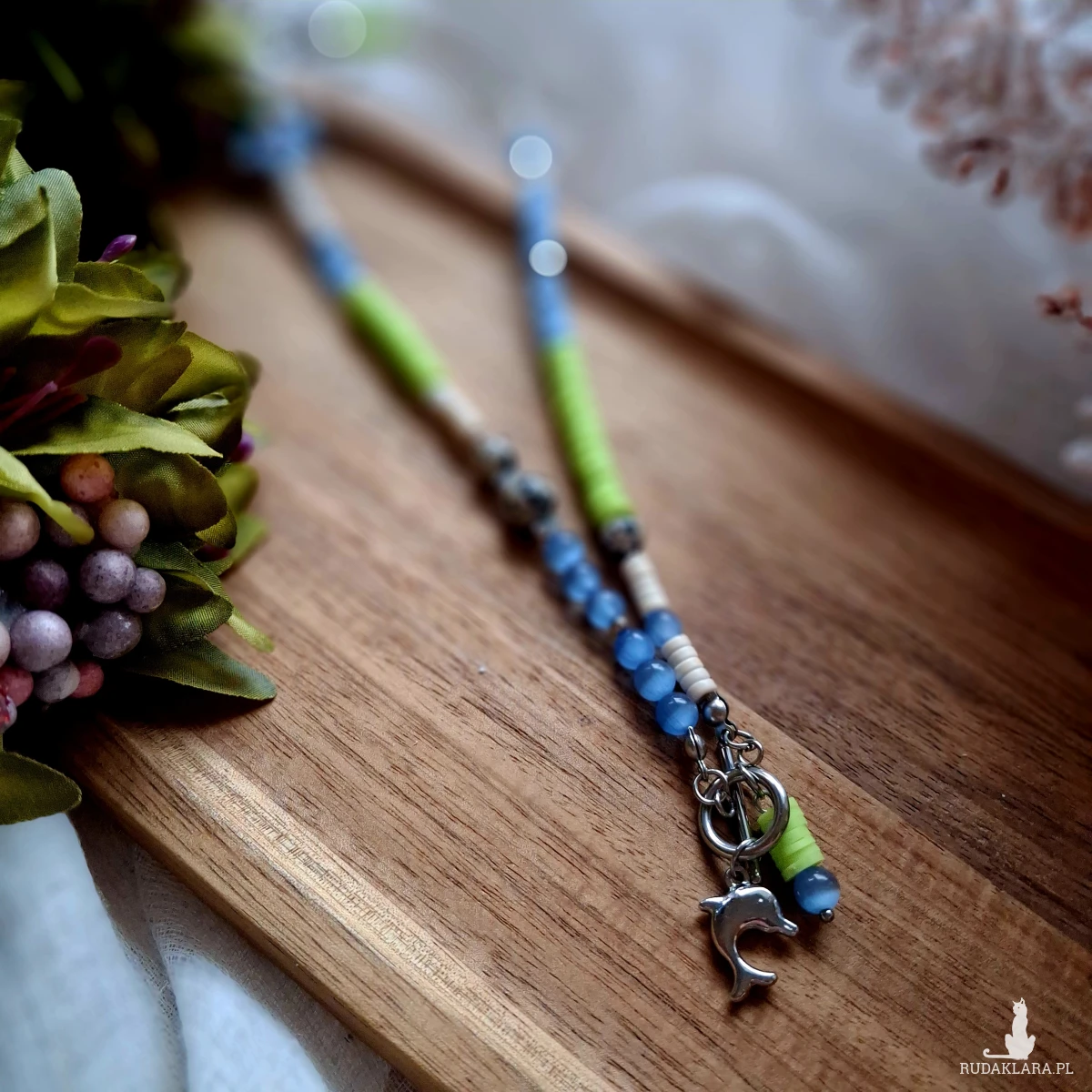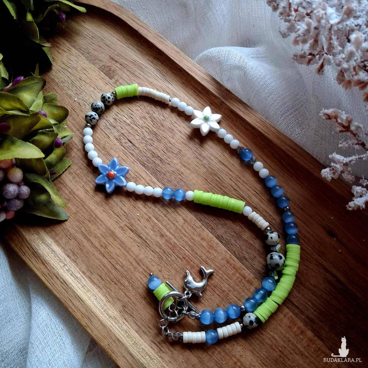 Naszyjnik tworzony ręcznie z kamieni, szklanych i akrylowych koralików, koralików Heishi, stali nierdzewnej jubilerskiej, gliniane kwiatki. Użyte kamienie: Jaspis dalmatyński, Kocie oko.