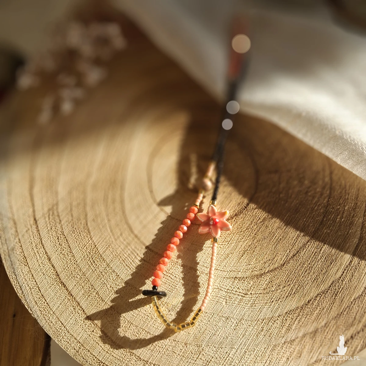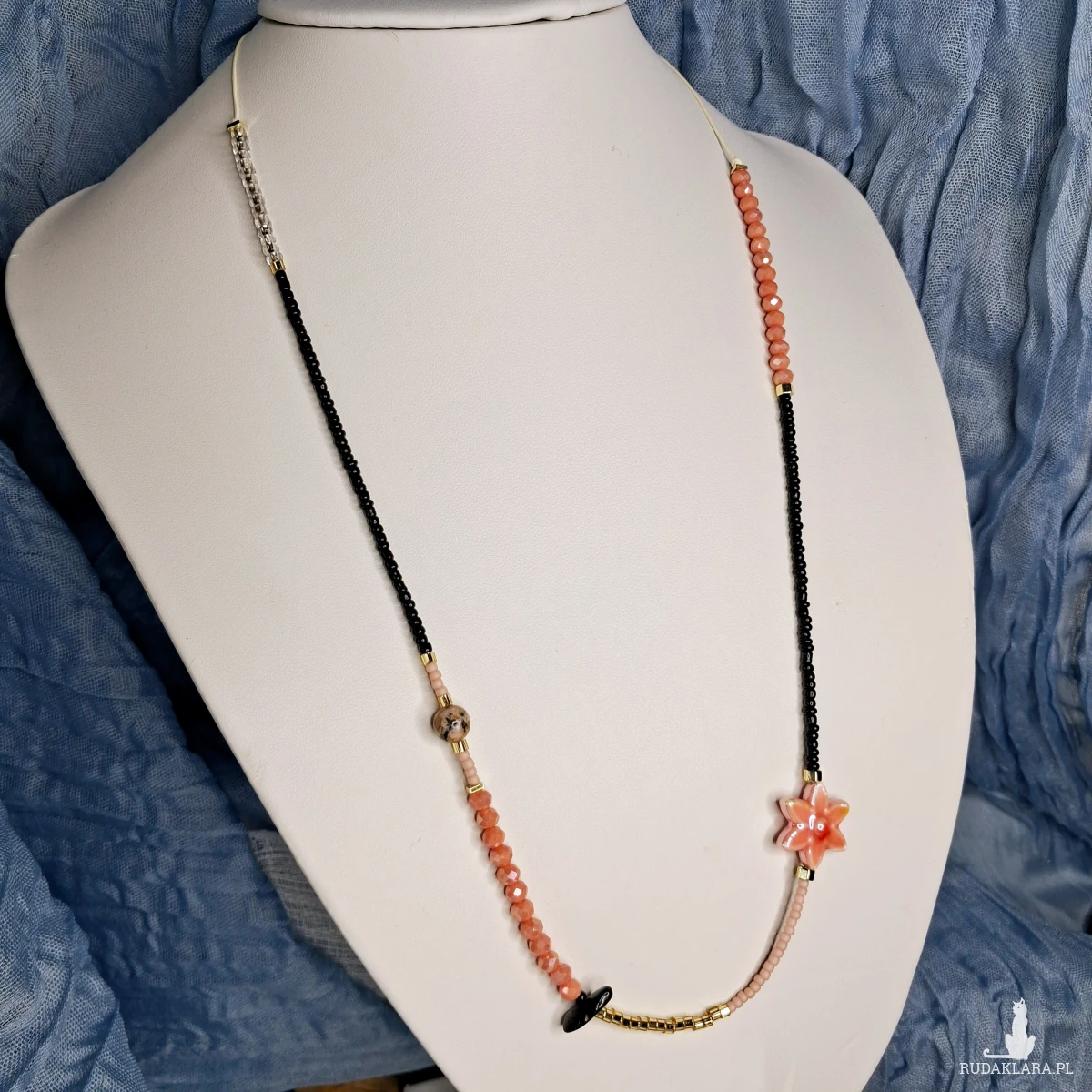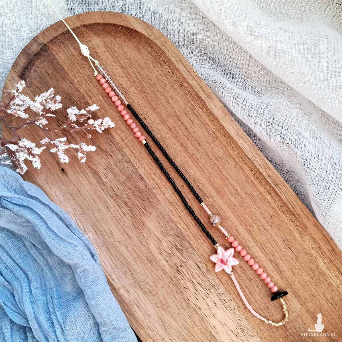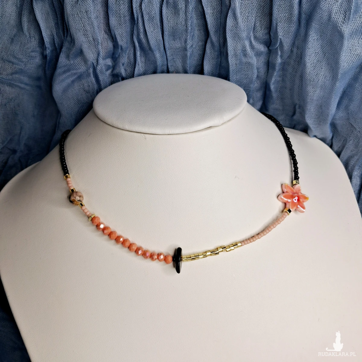 Naszyjnik do noszenia na dwa sposoby - jako choker i jako dłuższy naszyjnik. Wykonany jest ręcznie na sznurku który można ściągać i rozluźniać. Wiązanie makramowe. Użyte zostały szklane i akrylowe koraliki, gliniany kwiatek, Turmalin i Rodonit. Minimalna długość 36 cm, maksymalna 76 cm.
