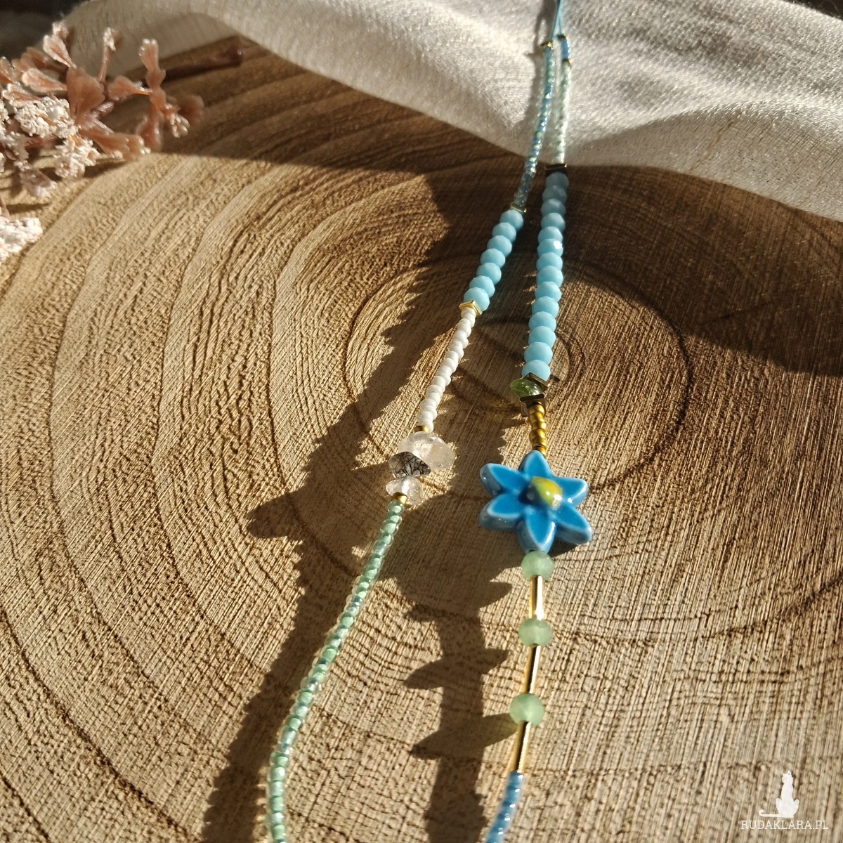 Naszyjnik do noszenia na 2 sposoby - jako choker i jako dłuższy naszyjnik. Wykonany jest ręcznie na sznurku, który można ściągać i rozluźniać. Użyte zostały szklane i akrylowe koraliki, kamień księżycowy, hematyt, prehnit, awenturyn, gliniany kwiatek. Minimalna długość 36 cm maksymalna 72 cm.