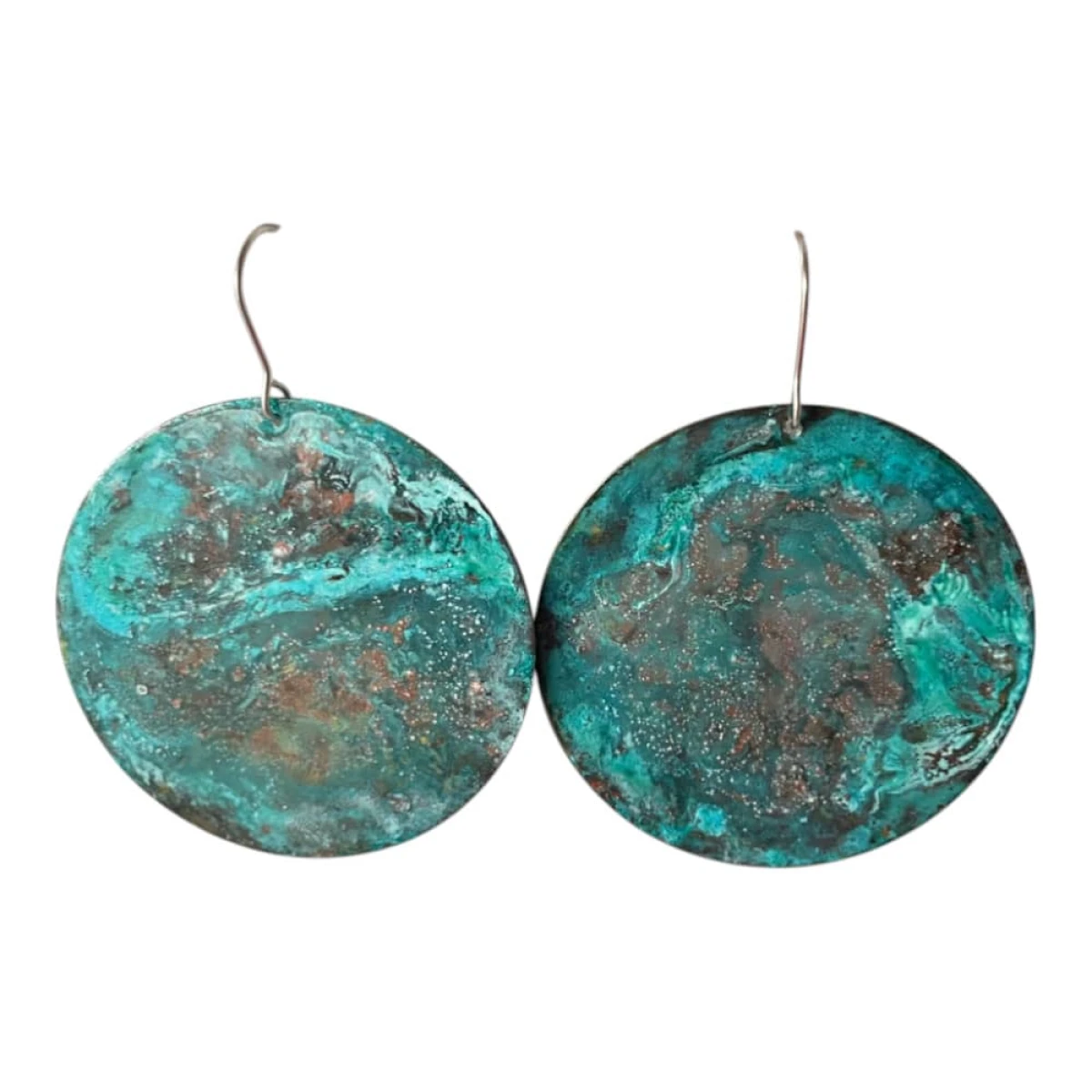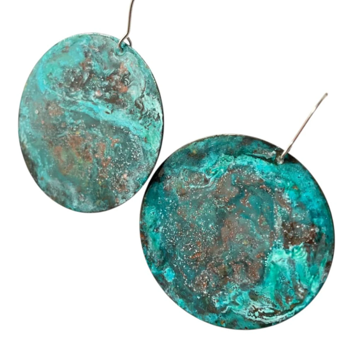 Kolczyki turkusowe z patynowanej miedzi to unikatowa biżuteria handmade inspirowana naturą i Ziemią widzianą z kosmosu. Okrągłe kolczyki z miedzi wyróżniają się niepowtarzalną kolorystyką w odcieniach turkusu, zieleni i brązu. Każda para powstaje ręcznie i ma unikalny wzór powierzchni. To oryginalna biżuteria artystyczna dla osób, które cenią rękodzieło i wyjątkowe dodatki.