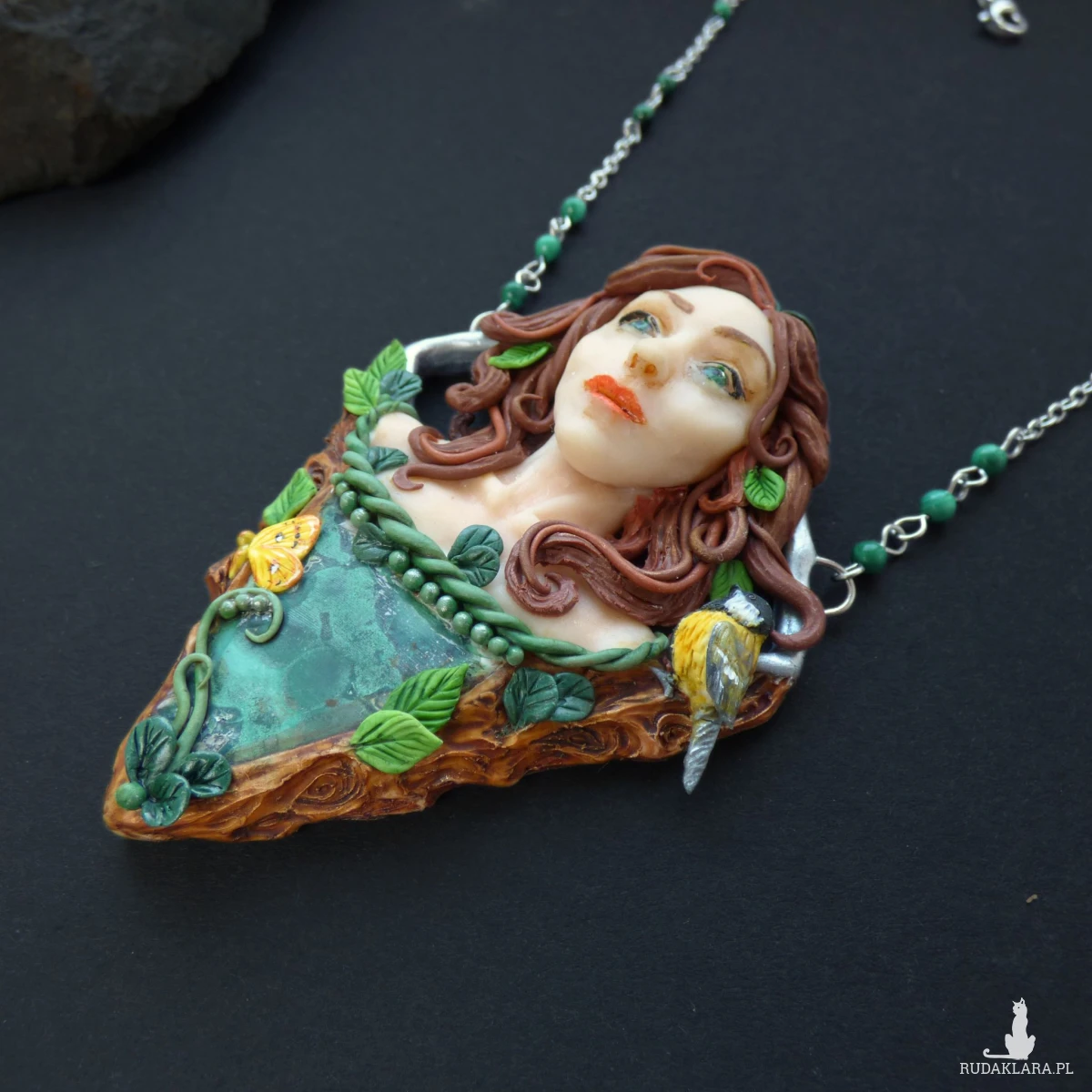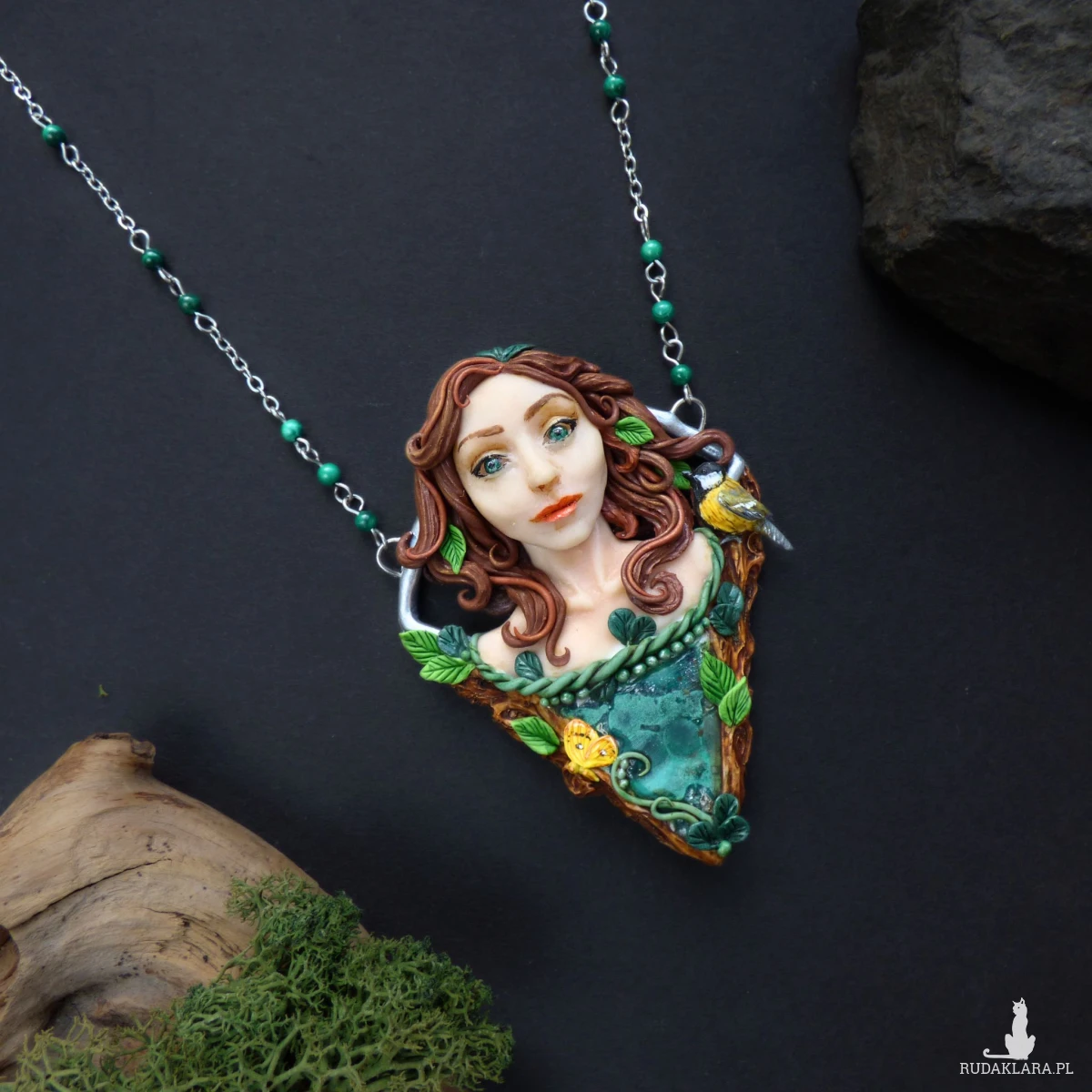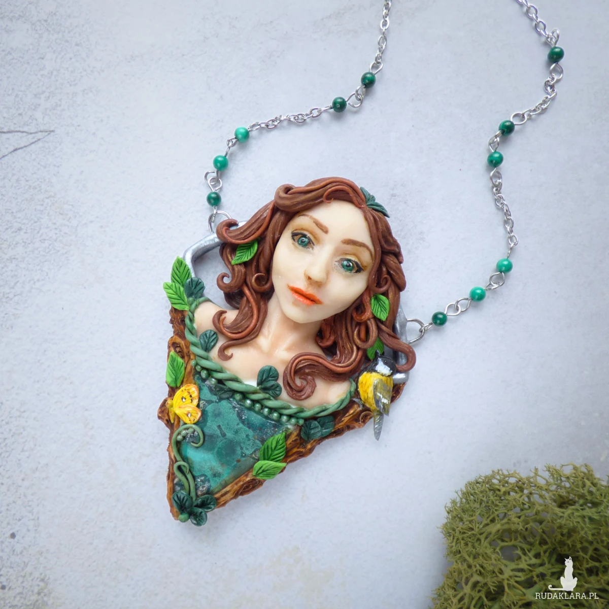 Baśniowy naszyjnik z malachitem, wykonany ręcznie z glinki polimerowej. Centralnym elementem kompozycji jest kobieca twarz otoczona motywami leśnymi. Towarzyszy jej również mała sikorka bogatka oraz motyl latolistek cytrynek. Całość dopełnia plaster surowego malachitu o pięknej, głębokiej zieleni i naturalnym rysunku. Dodatkowo w łańcuszek, na którym zawieszony jest naszyjnik, wplecione zostały kulki malachitu.