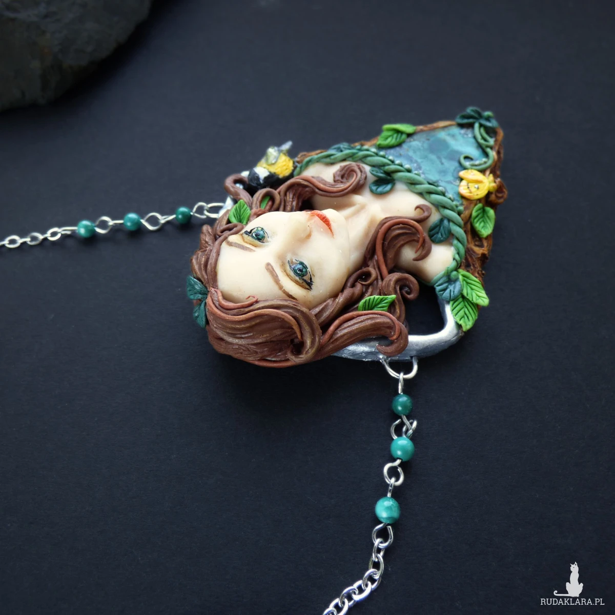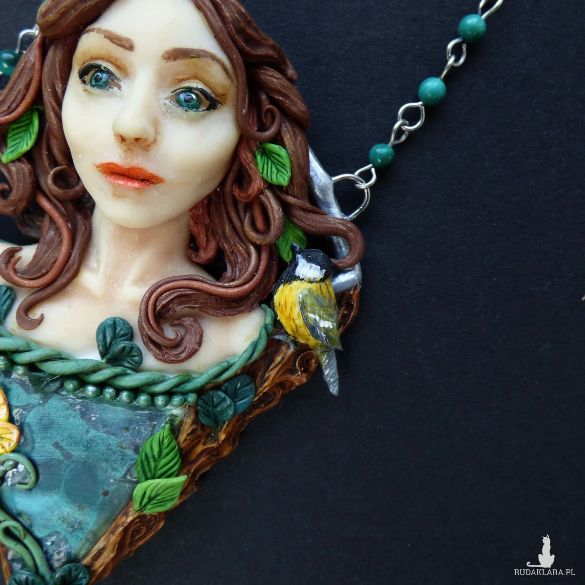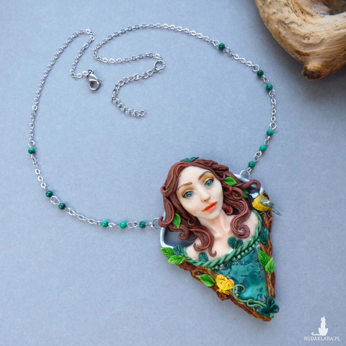 Baśniowy naszyjnik z malachitem, wykonany ręcznie z glinki polimerowej. Centralnym elementem kompozycji jest kobieca twarz otoczona motywami leśnymi. Towarzyszy jej również mała sikorka bogatka oraz motyl latolistek cytrynek. Całość dopełnia plaster surowego malachitu o pięknej, głębokiej zieleni i naturalnym rysunku. Dodatkowo w łańcuszek, na którym zawieszony jest naszyjnik, wplecione zostały kulki malachitu.