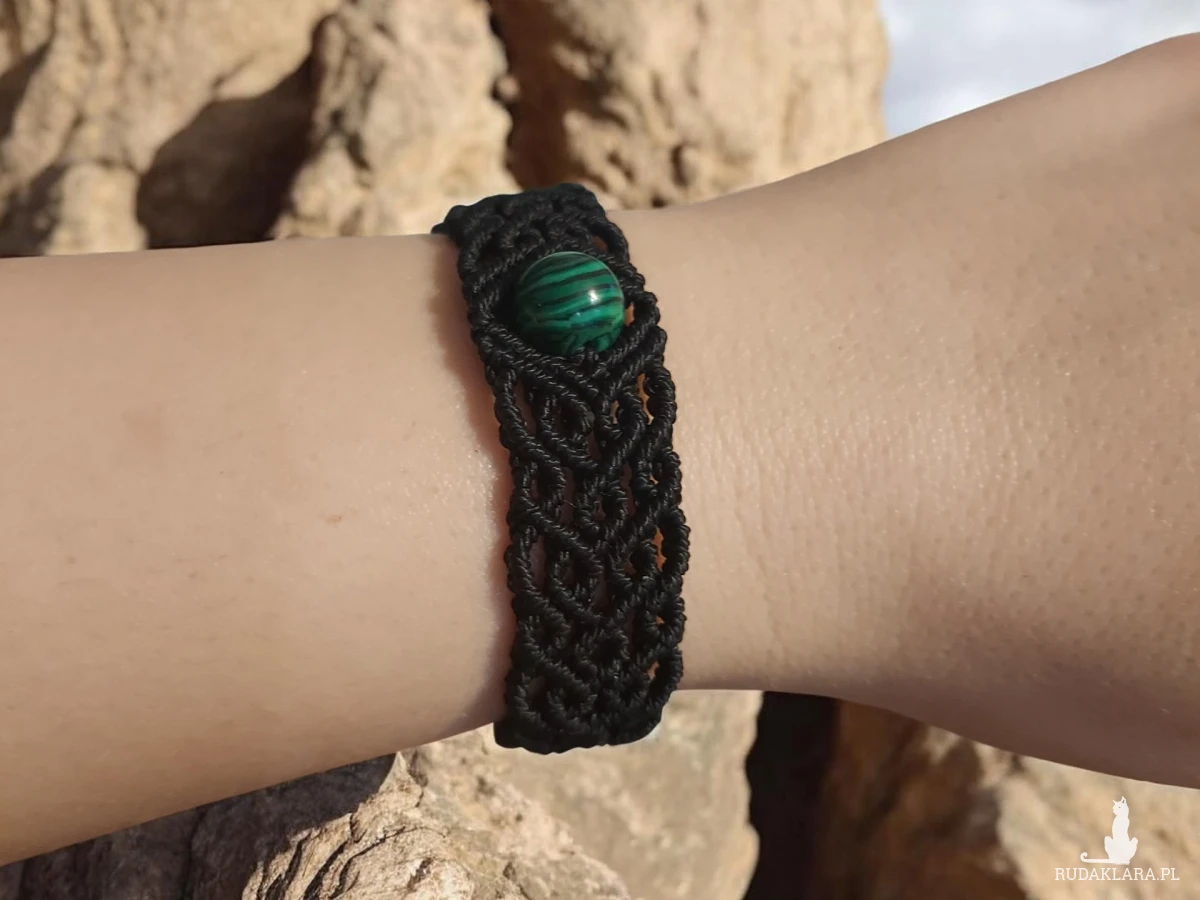 Szeroka bransoletka wykonana techniką mikro makramy z czarnego woskowanego skręcanego sznurka z 10 mm gładkim Malachitem na zapięcie regulowane.