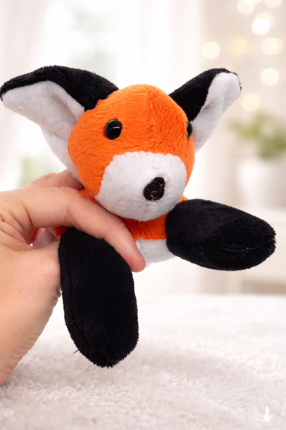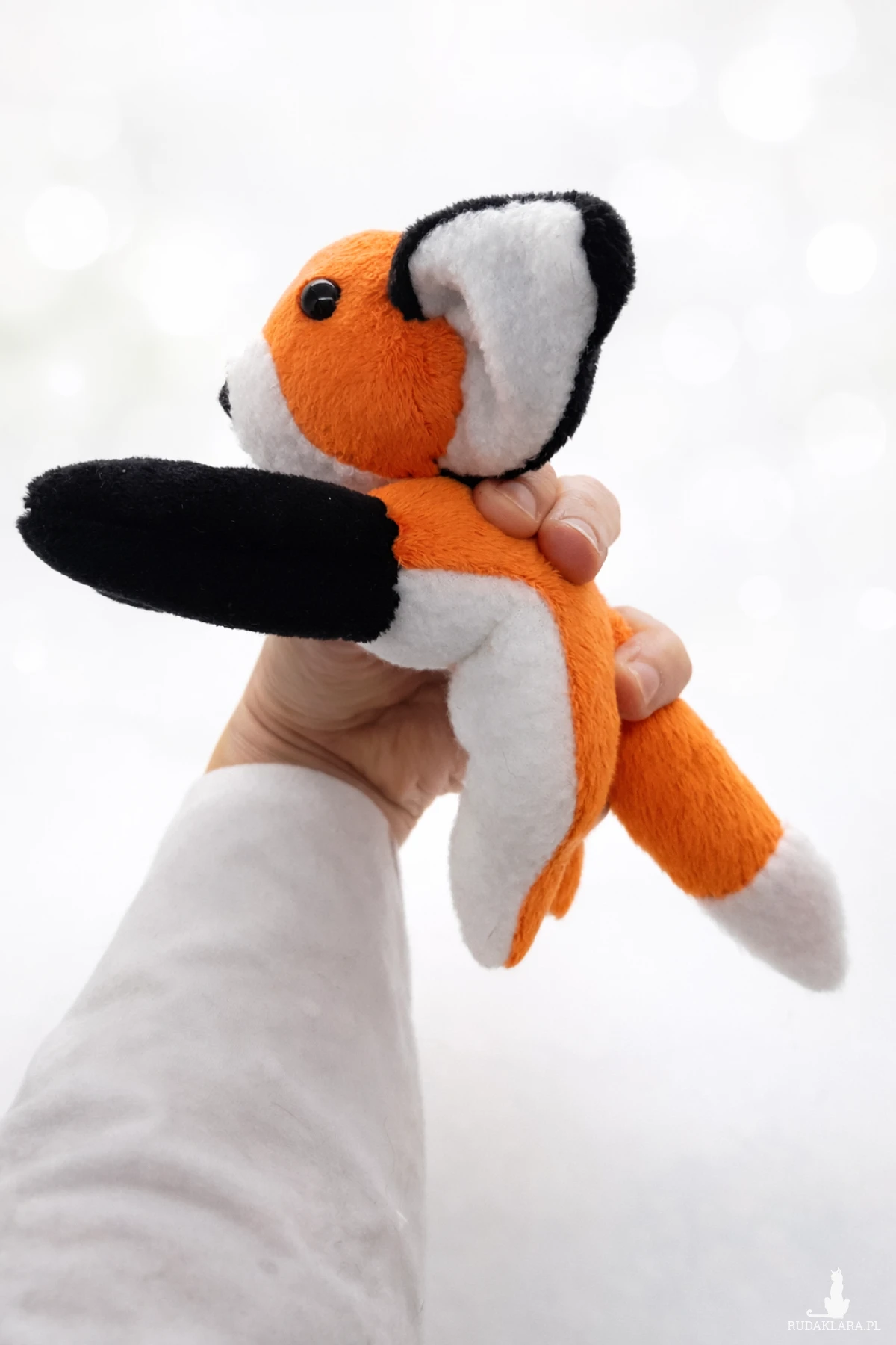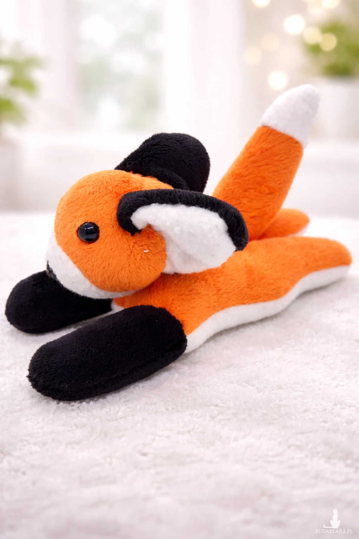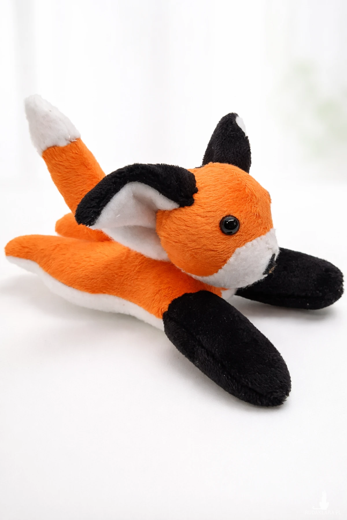 Wykonany przeze mnie mały leżący lisek. Długość z ogonkiem około 20 cm, wysokość ok. 10 cm.