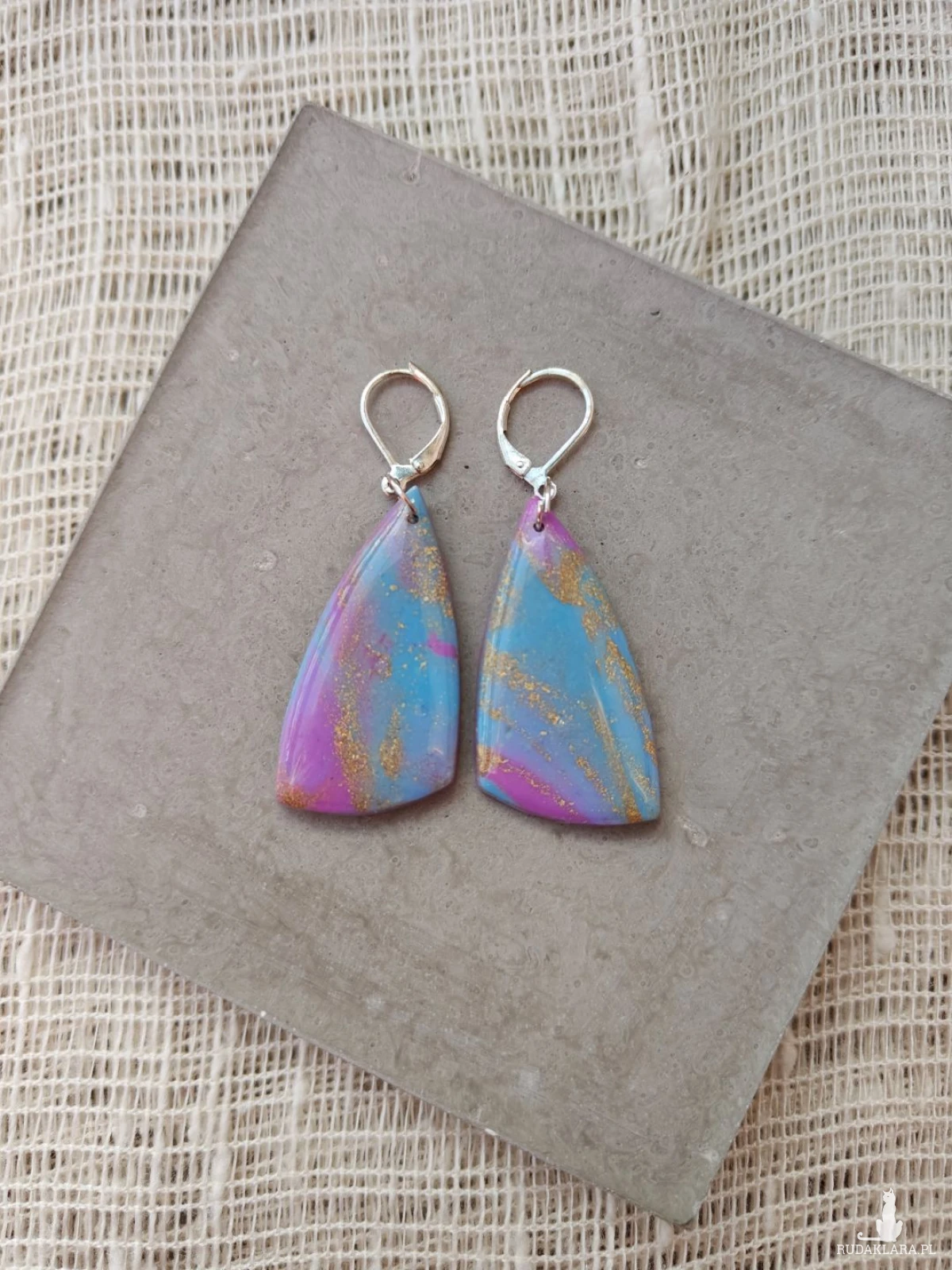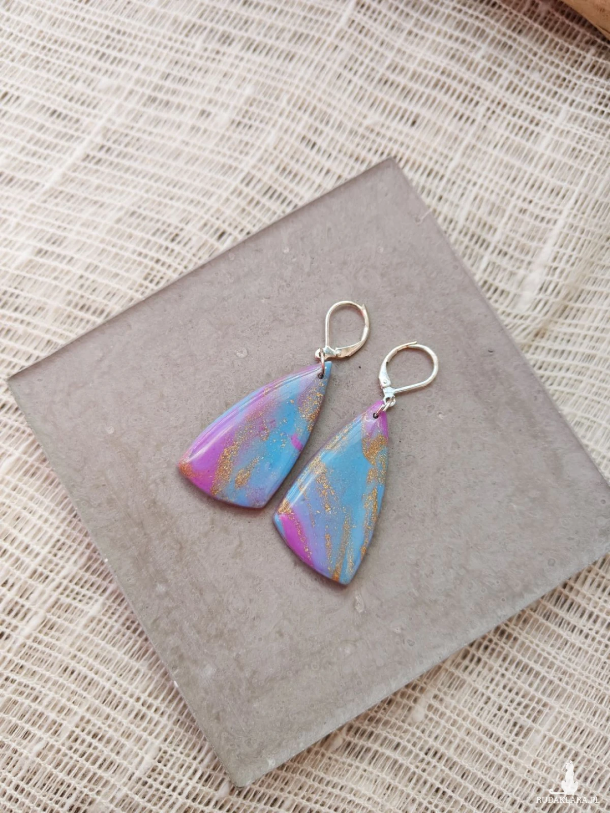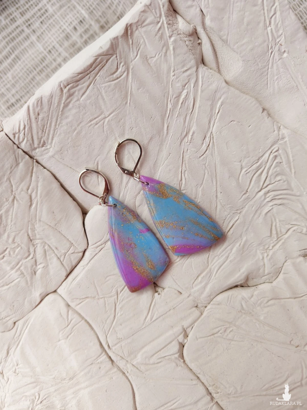 Zachwycające, ręcznie wykonane kolczyki z glinki polimerowej, które przyciągają spojrzenia swoją subtelną grą kolorów. Połączenie delikatnego błękitu z odcieniami różu i fioletu, przełamane złotymi akcentami, tworzy efekt inspirowany zorzą polarną. Całość została pokryta warstwą żywicy, nadającą im wyjątkowy połysk i głębię. Lekkie i wygodne, idealnie dopełnią zarówno codzienne stylizacje, jak i bardziej eleganckie zestawy.