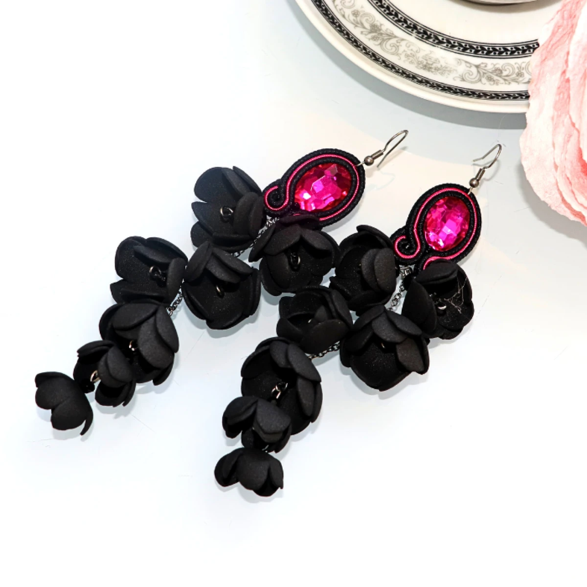 Te długie kolczyki kwiatowe to mistrzowskie zestawienie eleganckiego haftu sutasz oraz lekkich jak piórko kwiatów z pianki (foamiranu). Dominująca czerń stanowi idealne tło dla dużych kryształów w kolorze soczystej fuksji, które wieńczą górę kolczyków i nadają im niesamowitego blasku.