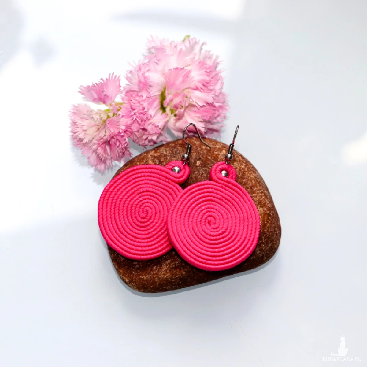 Te wyraziste kolczyki w kształcie kół zostały wykonane ręcznie pracochłonną techniką haftu sutasz. Sznurek w kolorze intensywnego różu (fuksji) został zwinięty w precyzyjną, hipnotyzującą spiralę o skręconej strukturze "twisted". Dzięki temu kolczyki zyskują piękną teksturę, która wspaniale współgra ze światłem.