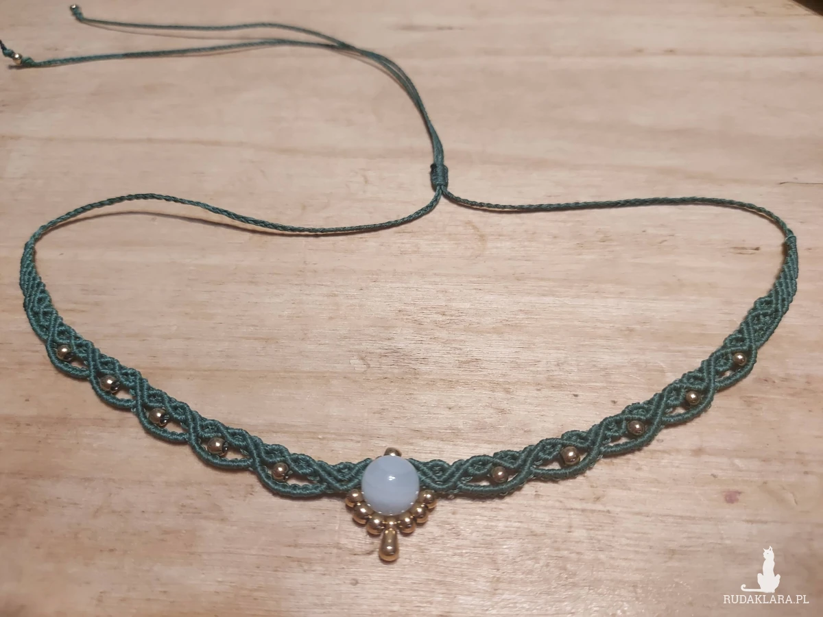 Pleciony choker z zielonego sznurka z Jadeitem, wykończony stalą nierdzewną z zapięciem makramowym. Rękodzieło