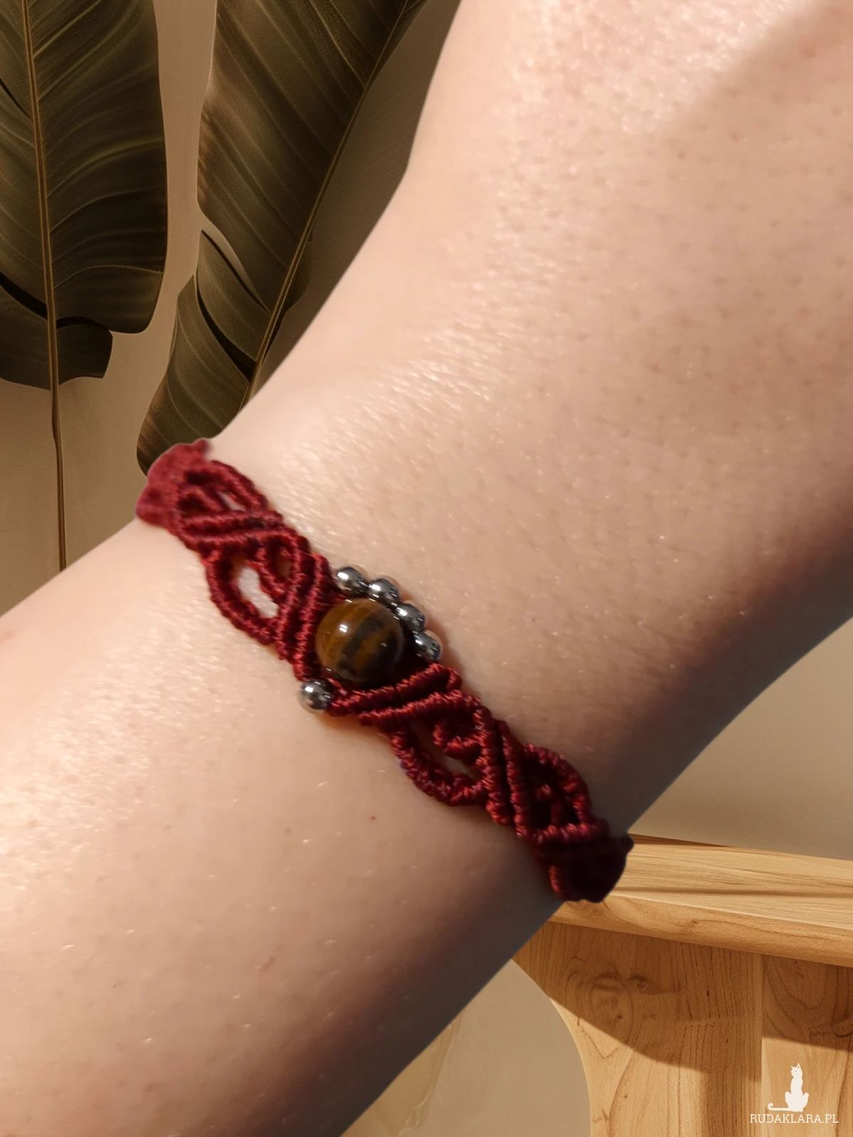 Bransoletka w kolorze burgundowym, wykonana techniką makramy z woskowanego poliestrowego sznurka z wplecionym kamieniem Tiger's Eye 8 mm średnicy, wykończona stalą nierdzewną z zapięciem regulowanym.
