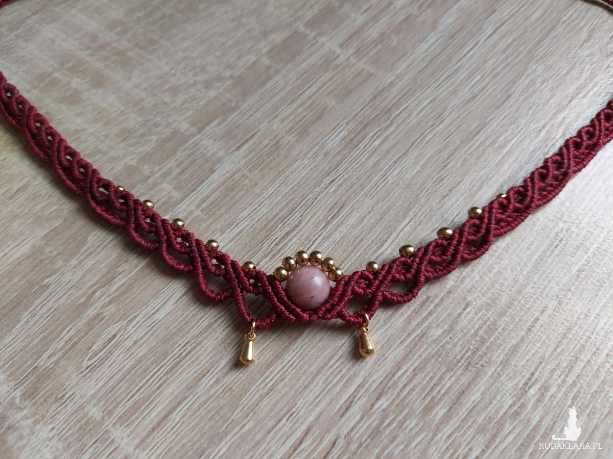 Choker w kolorze burgundowym wykonany techniką mikro makramy z kamieniem naturalnym Rodonitem 8 mm, wykończony stalą nierdzewną, zapiecie makramowe.