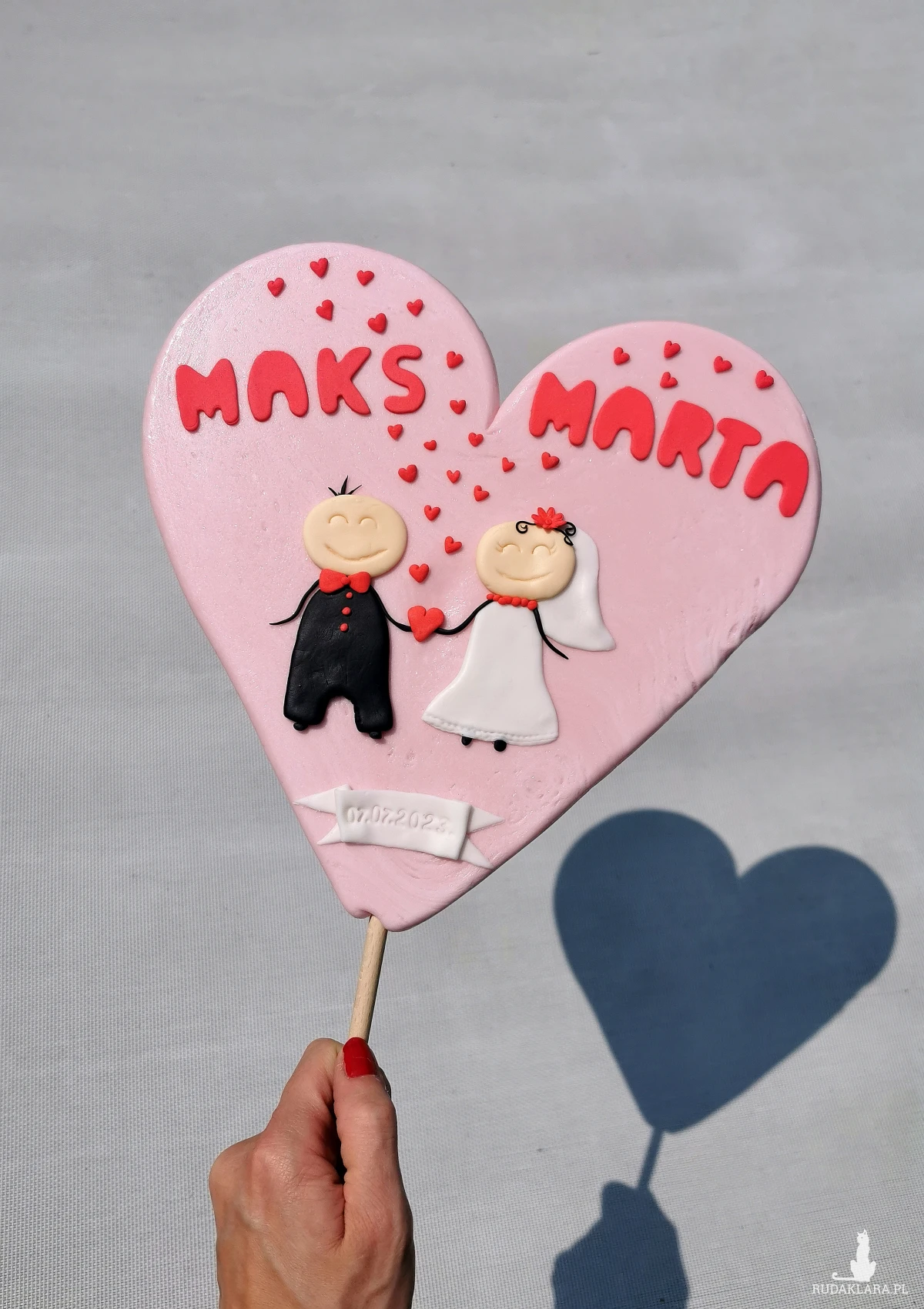Na sercu znajduje się dekoracja przedstawiająca parę młodą – symbol miłości i wspólnej drogi, który nadaje lizakowi wyjątkowego, sentymentalnego charakteru. To nie tylko słodycz, ale również pamiątka pełna emocji.