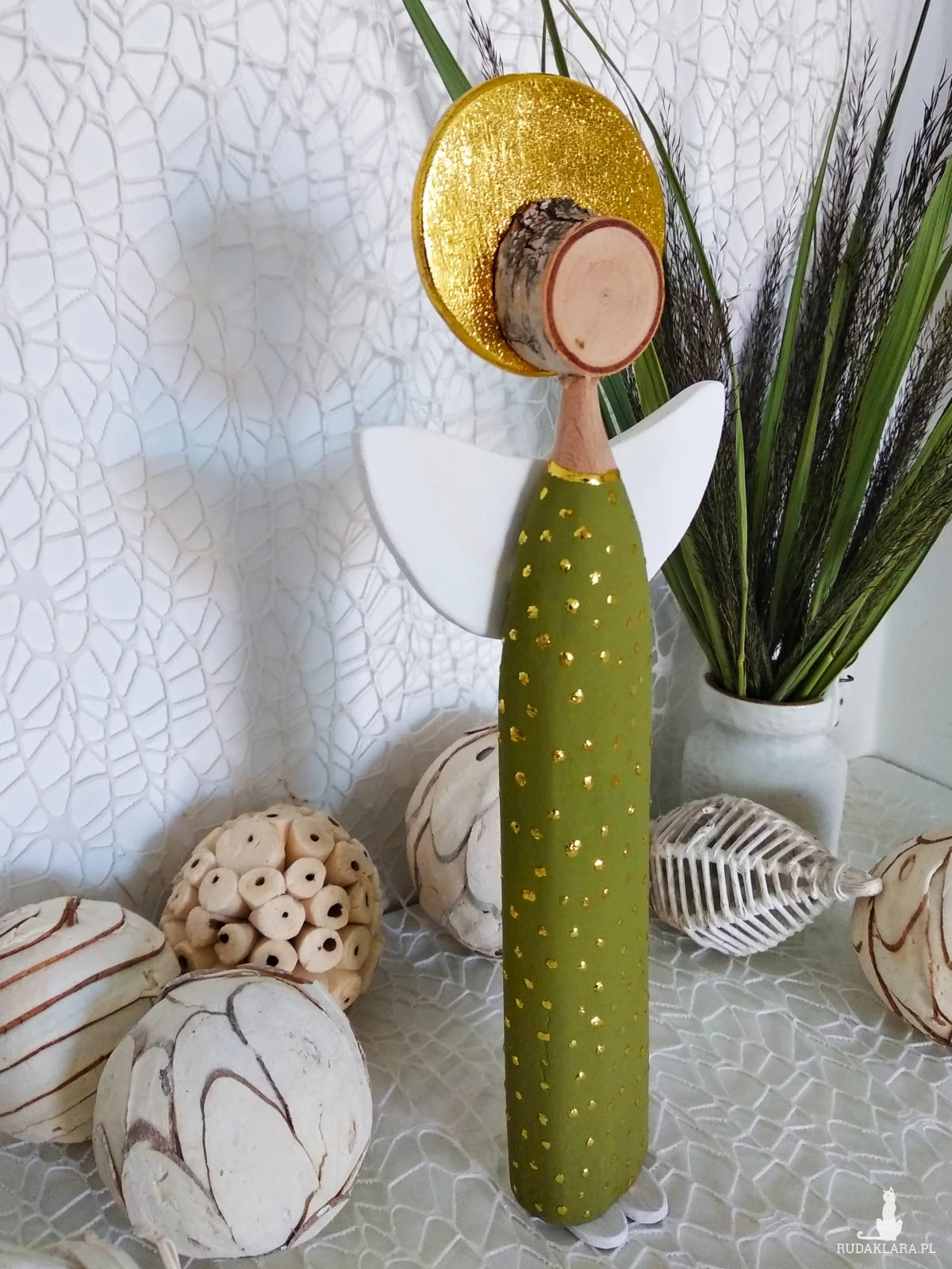 Ręcznie wykonany anioł z drewna bukowego, z sukienką malowaną akrylową farbą w odcieniu zieleni. Złota aureola oraz delikatne, nieregularne kropeczki nadają całości elegancki, lekko rozświetlony charakter.