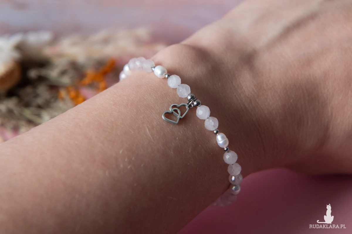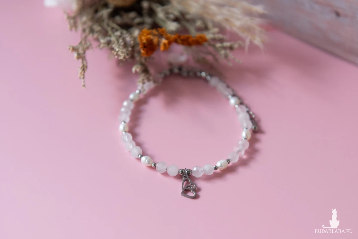 Bransoletka HEARTS z kamieni - kwarc różowy (4 mm), perły słodkowodnej (3-4 mm) oraz z elementów ze stali nierdzewnej.