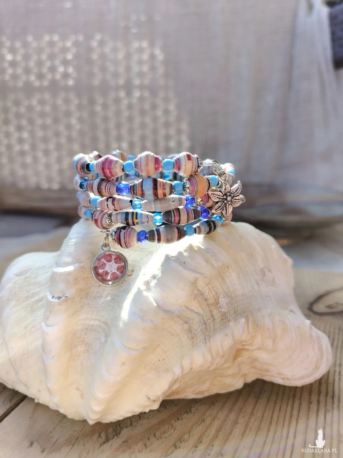 Ręcznie wykonana bransoletka w stylu boho, stworzona z unikalnych koralików z papieru, zachwyca lekkością i artystycznym charakterem. Każdy koralik ma niepowtarzalny wzór, co sprawia, że każda sztuka jest jedyna w swoim rodzaju. Subtelne odcienie turkusu, beżu i różu przywołują skojarzenia z morską bryzą i letnim relaksem. Elastyczna forma sprawia, że bransoletka pięknie układa się na nadgarstku, a delikatna zawieszka dodaje jej wyjątkowego uroku.