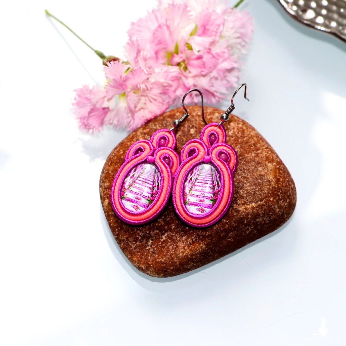 Te urocze kolczyki sutasz wyróżniają się unikatowym oczkiem z motywem lawendowego pola. Oprawa wykonana z neonowych sznurków w odcieniach neonowego różu i fioletu dodaje im nowoczesnego blasku i sprawia, że pięknie rozświetlają twarz. Są doskonałym dowodem na to, że mała biżuteria może mieć wielki charakter.