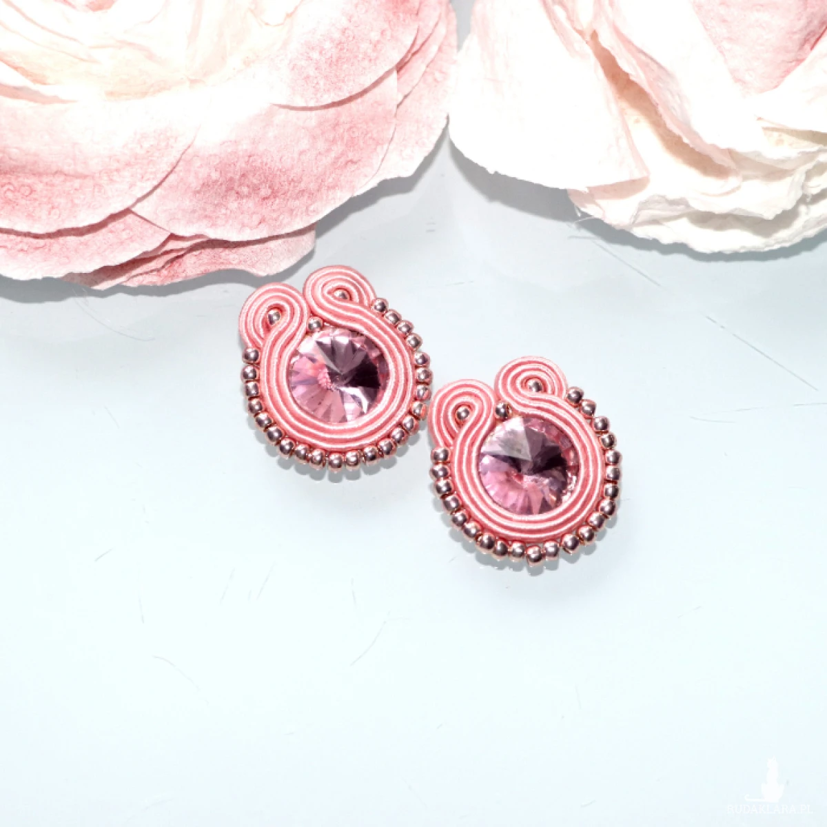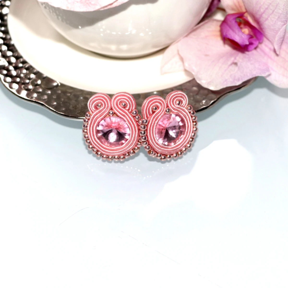 Te drobne kolczyki typu sztyfty zostały stworzone dla kobiet, które cenią subtelność, ale nie chcą rezygnować z wyrazistego blasku. Wykonane ręcznie w odcieniu jasnego, pudrowego różu, oprawiają fasetowany kryształ, który przepięknie rozprasza światło przy każdym ruchu głowy.