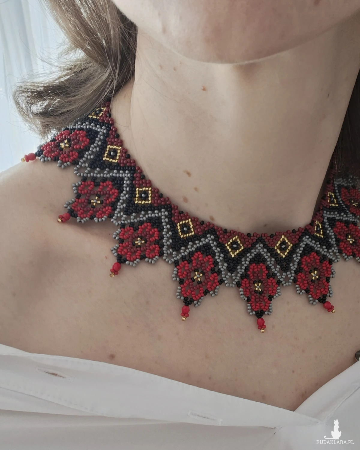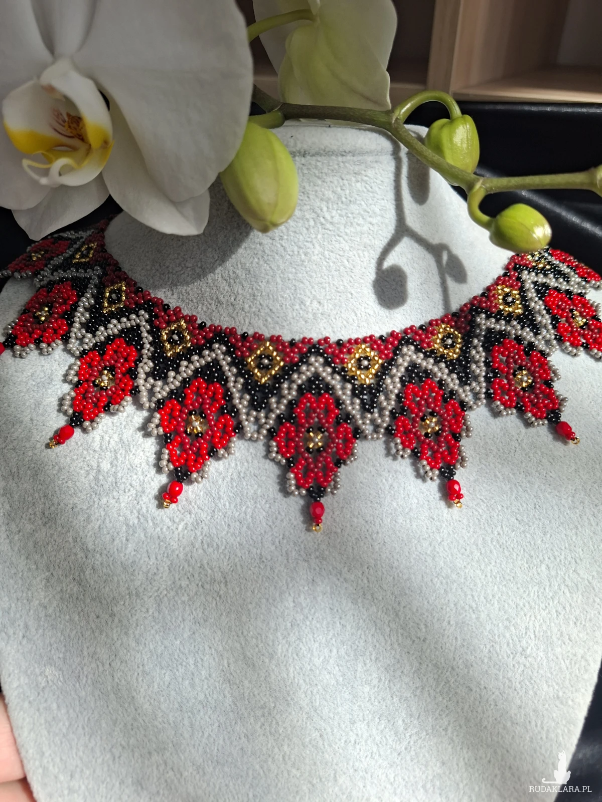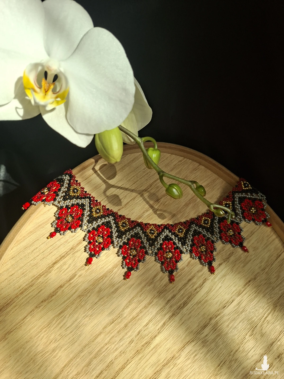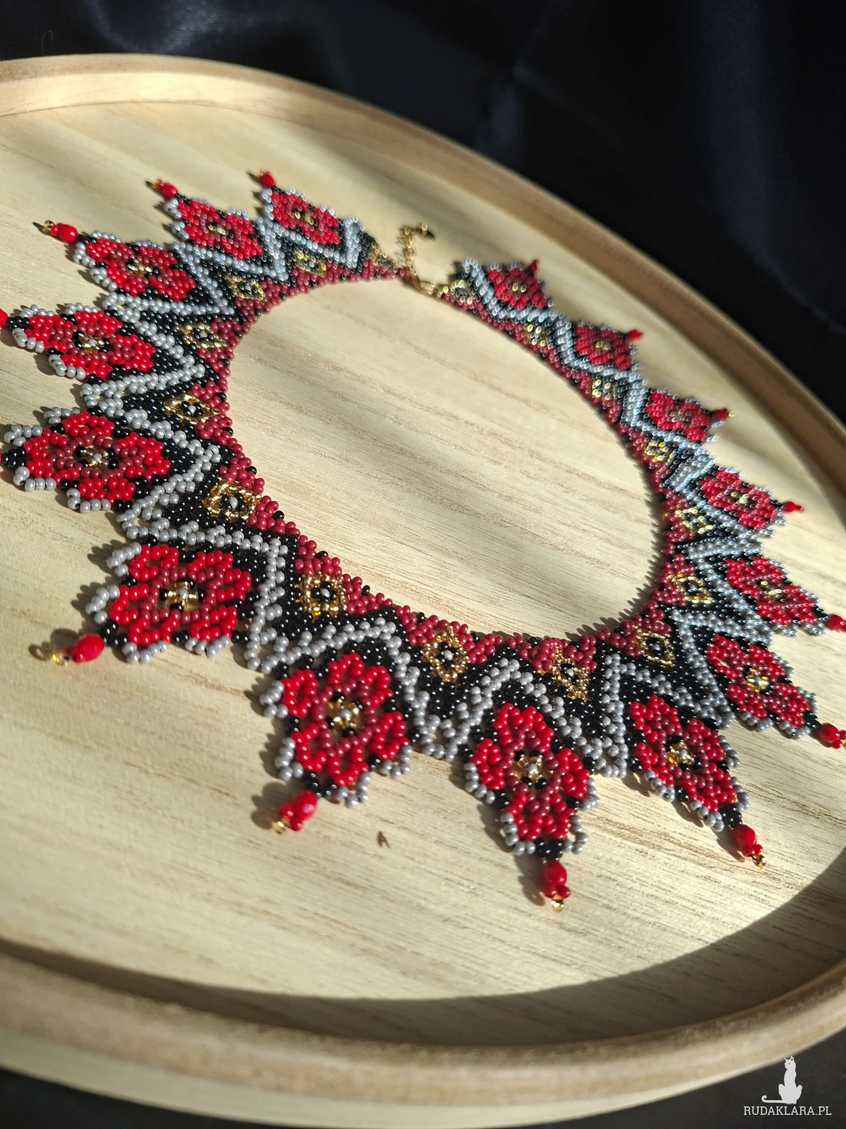 Odkryj tajemnicę tradycji zaklętą w koralikach. Ta wyjątkowa krywulka to połączenie pasji, precyzji i głębokiej czerwieni, która dodaje pewności siebie. Wyraziste połączenie czerwonych kwiatów z złotymi akcentami na tle głębokiej czerni tworzy biżuterię, która nie tylko zdobi, ale niesie ze sobą duszę i historię.