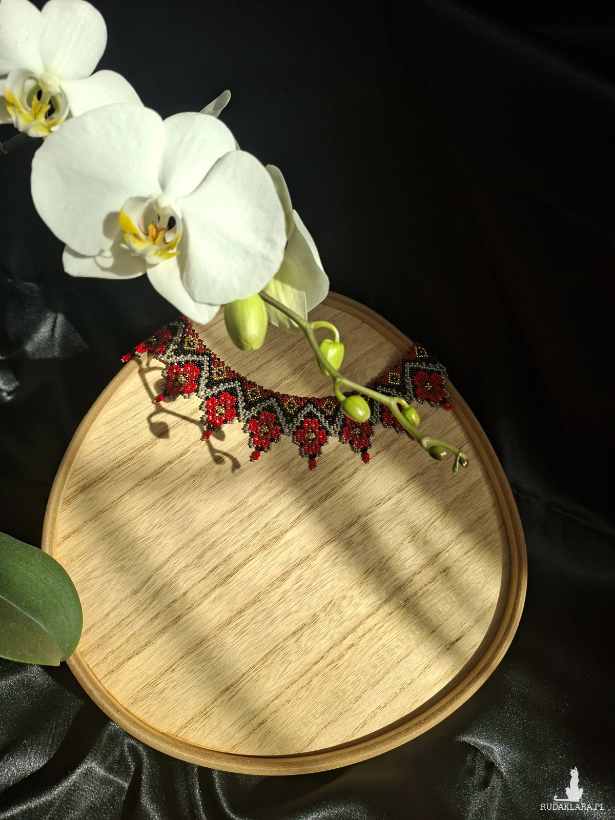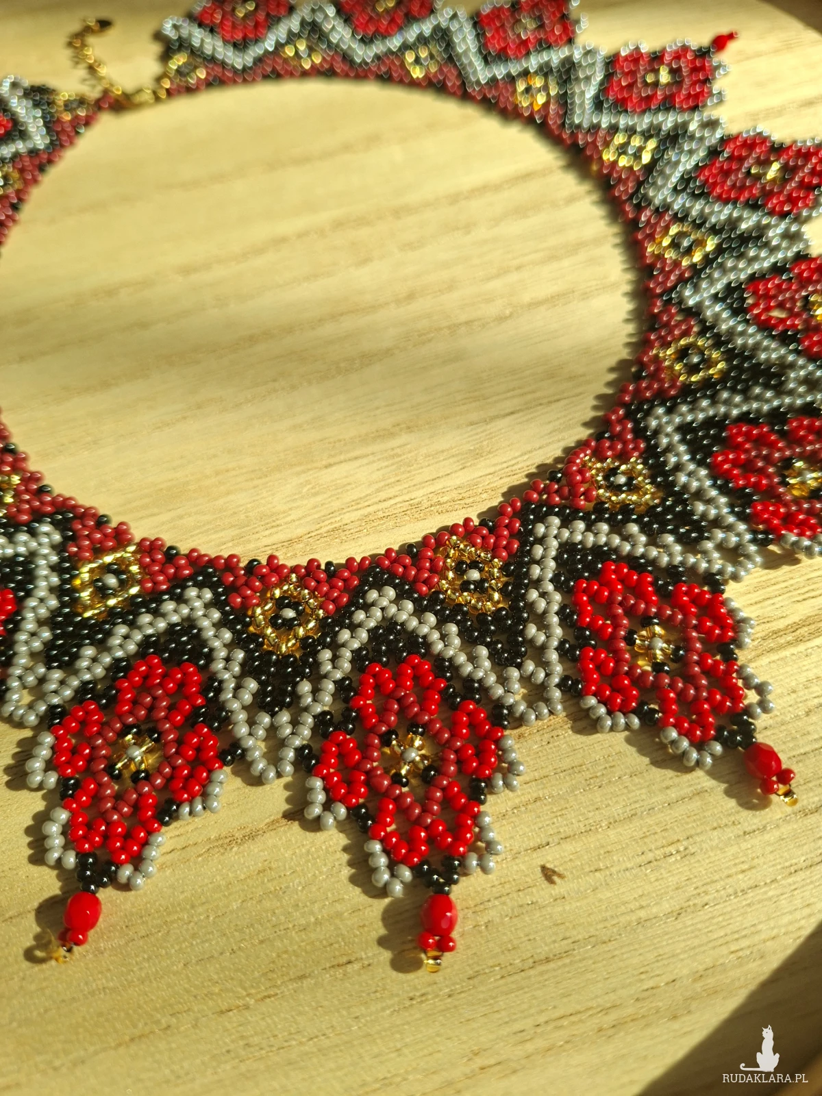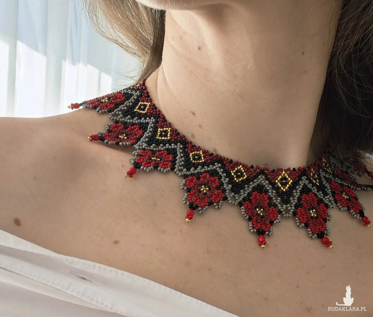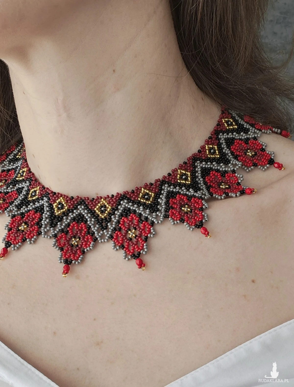 Odkryj tajemnicę tradycji zaklętą w koralikach. Ta wyjątkowa krywulka to połączenie pasji, precyzji i głębokiej czerwieni, która dodaje pewności siebie. Wyraziste połączenie czerwonych kwiatów z złotymi akcentami na tle głębokiej czerni tworzy biżuterię, która nie tylko zdobi, ale niesie ze sobą duszę i historię.