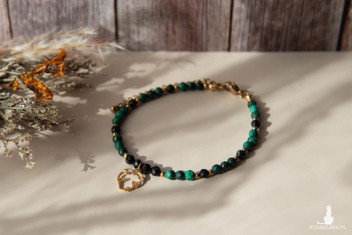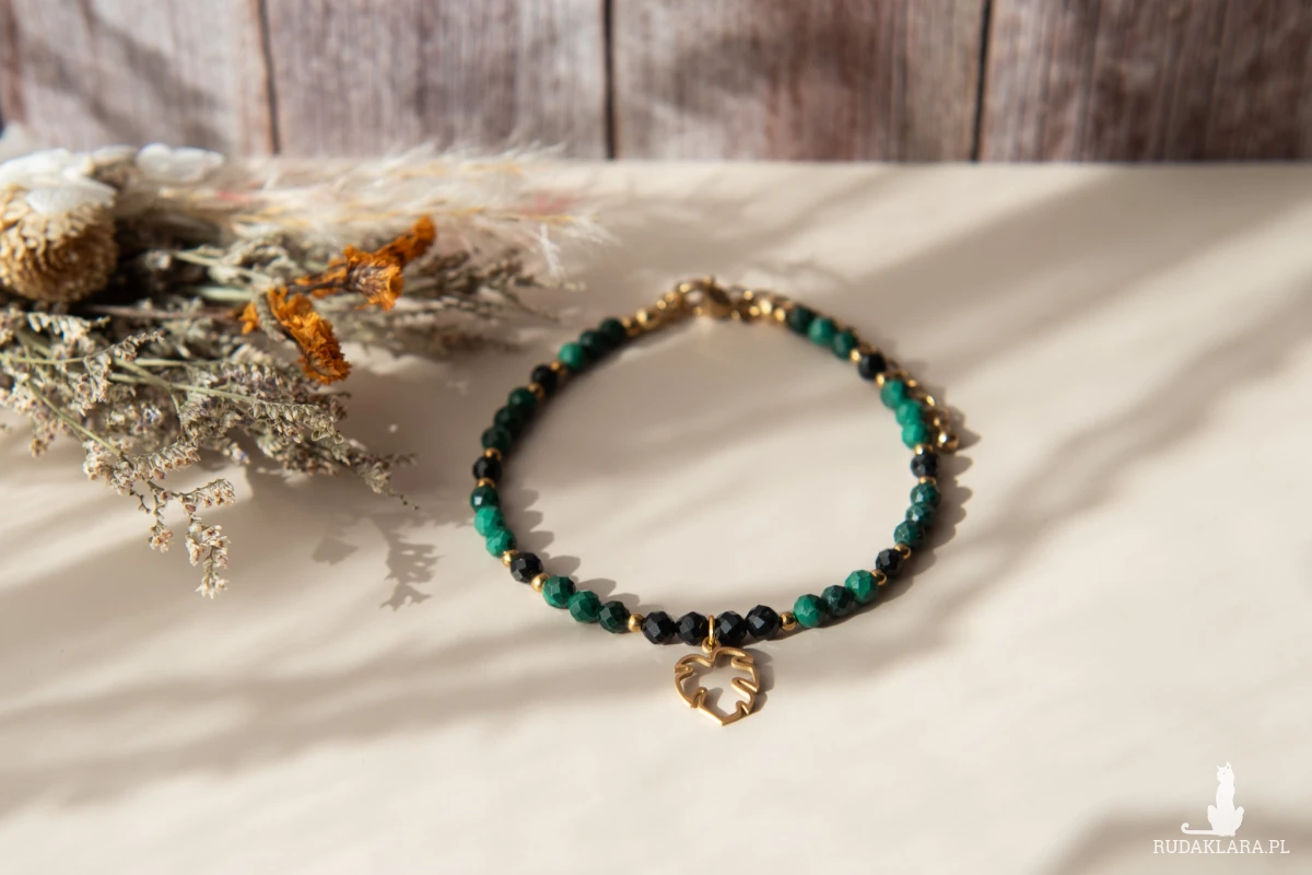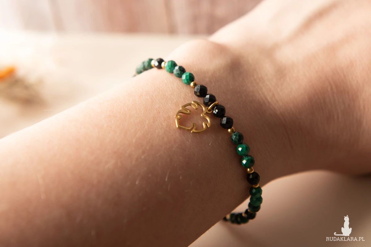 Bransoletka MONSTERA DARK z kamieni - malachit i turmalin czarny (4 mm) oraz z elementów ze stali nierdzewnej. Ten zestaw kamieni jest szczególnie polecany osobom spod znaku Byka, Koziorożca i Skorpiona.