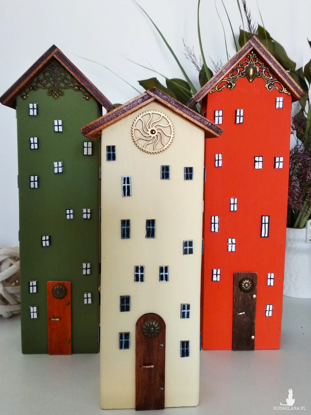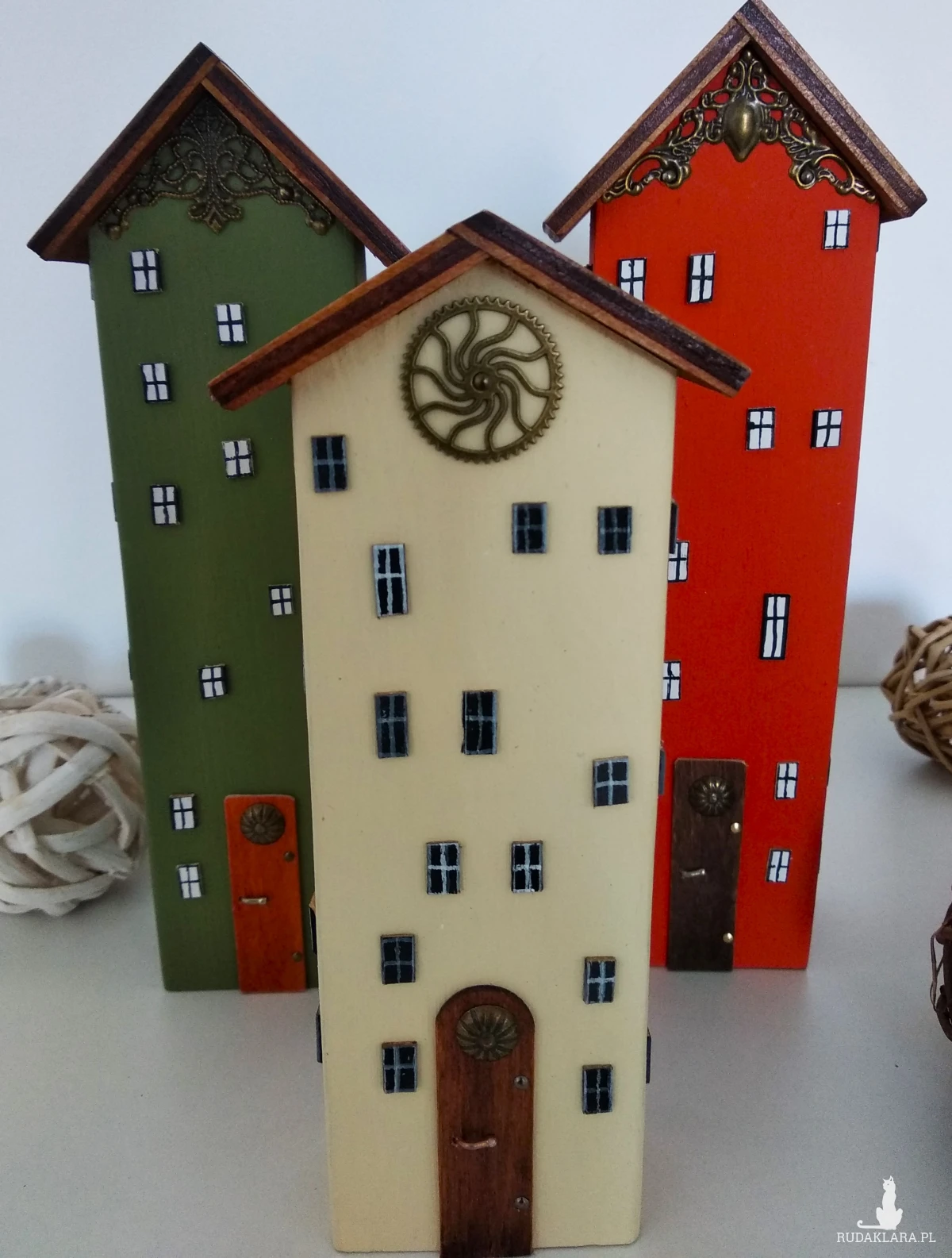 Zestaw ręcznie wykonanych domków z drewna sosnowego, malowanych farbą akrylową. Naturalna baza materiału w połączeniu z wyrazistymi kolorami nadaje im lekkości, a bejcowane i lakierowane daszki podkreślają strukturę drewna. Całość uzupełniają metalowe oraz dekoracyjne elementy, które dodają charakteru i subtelnej elegancji.