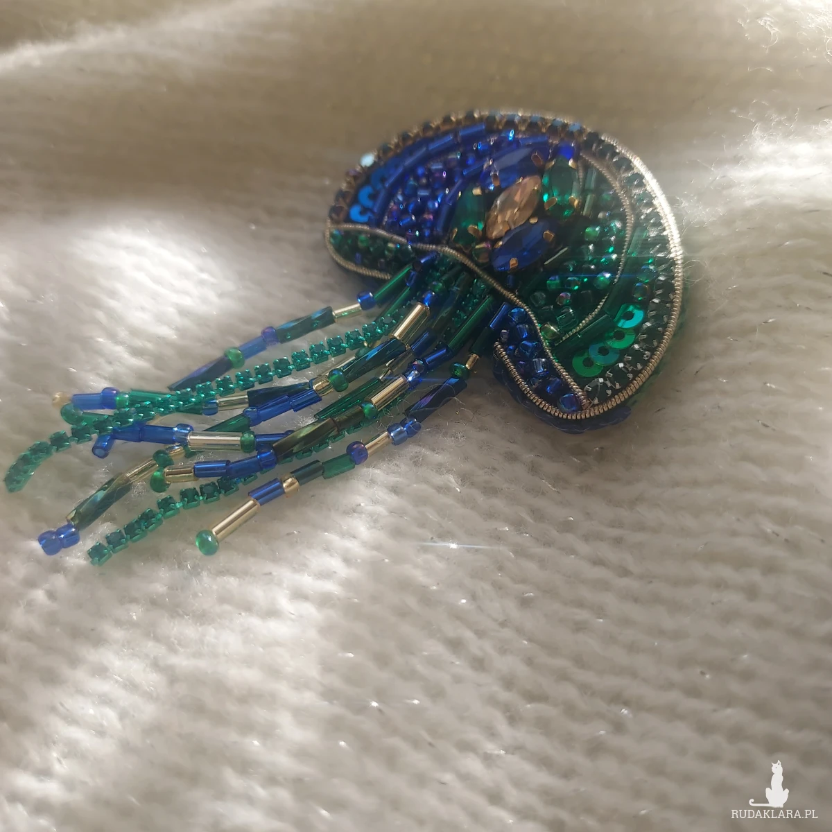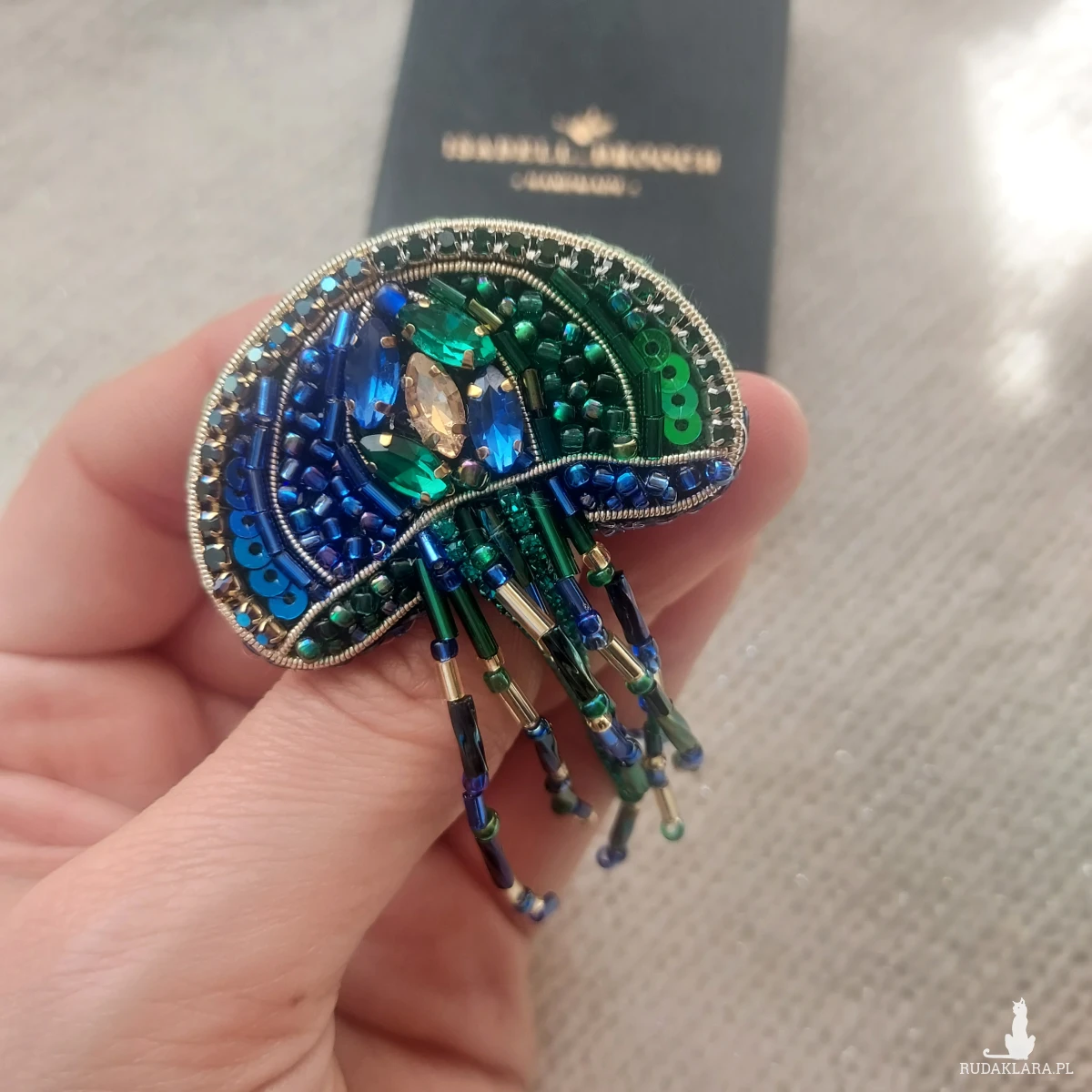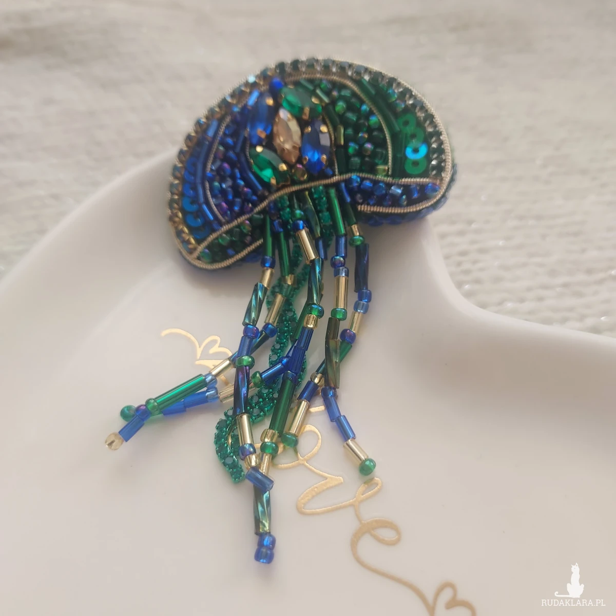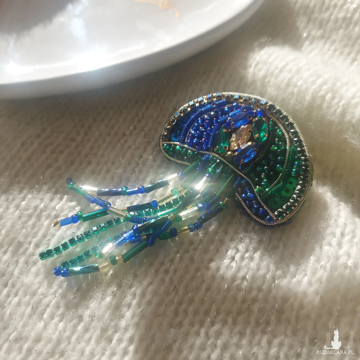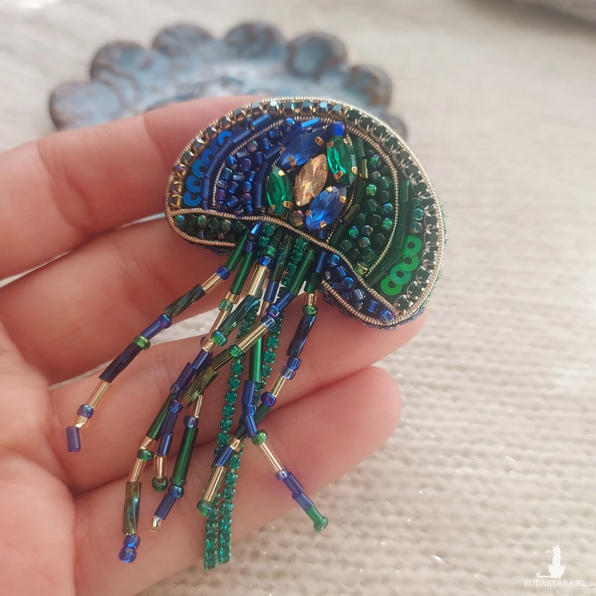Zanurz się w świat morskich głębin z wyjątkową, cudowną broszką MEDUZĄ w pięknym kolorze kobaltu oraz głębokiej zieleni w odcieniu szmaragdu.
