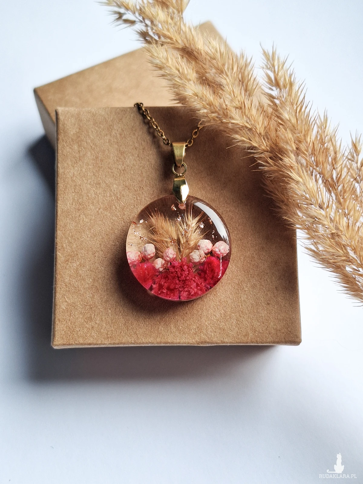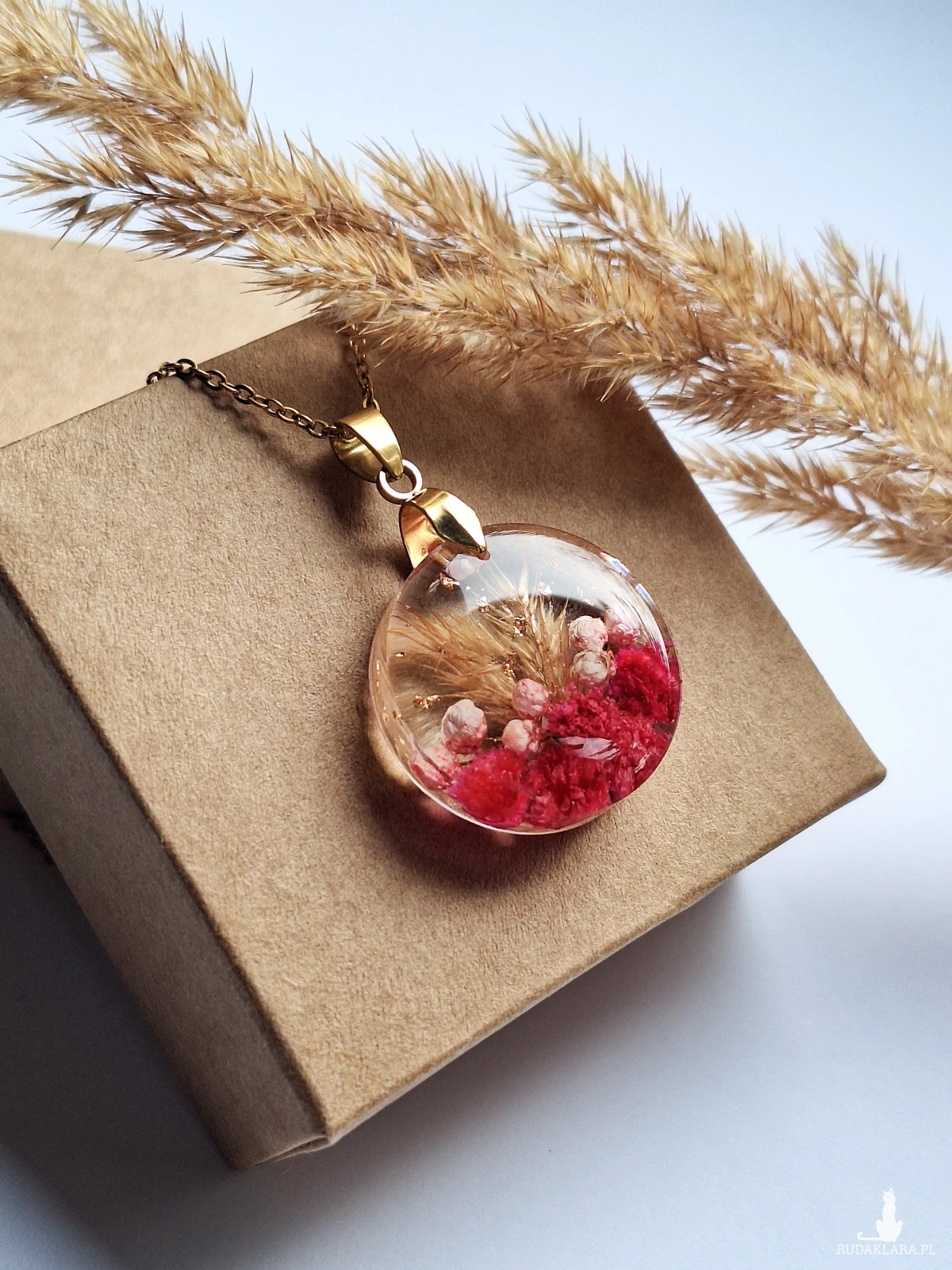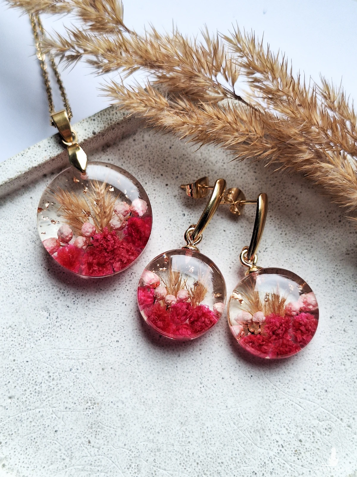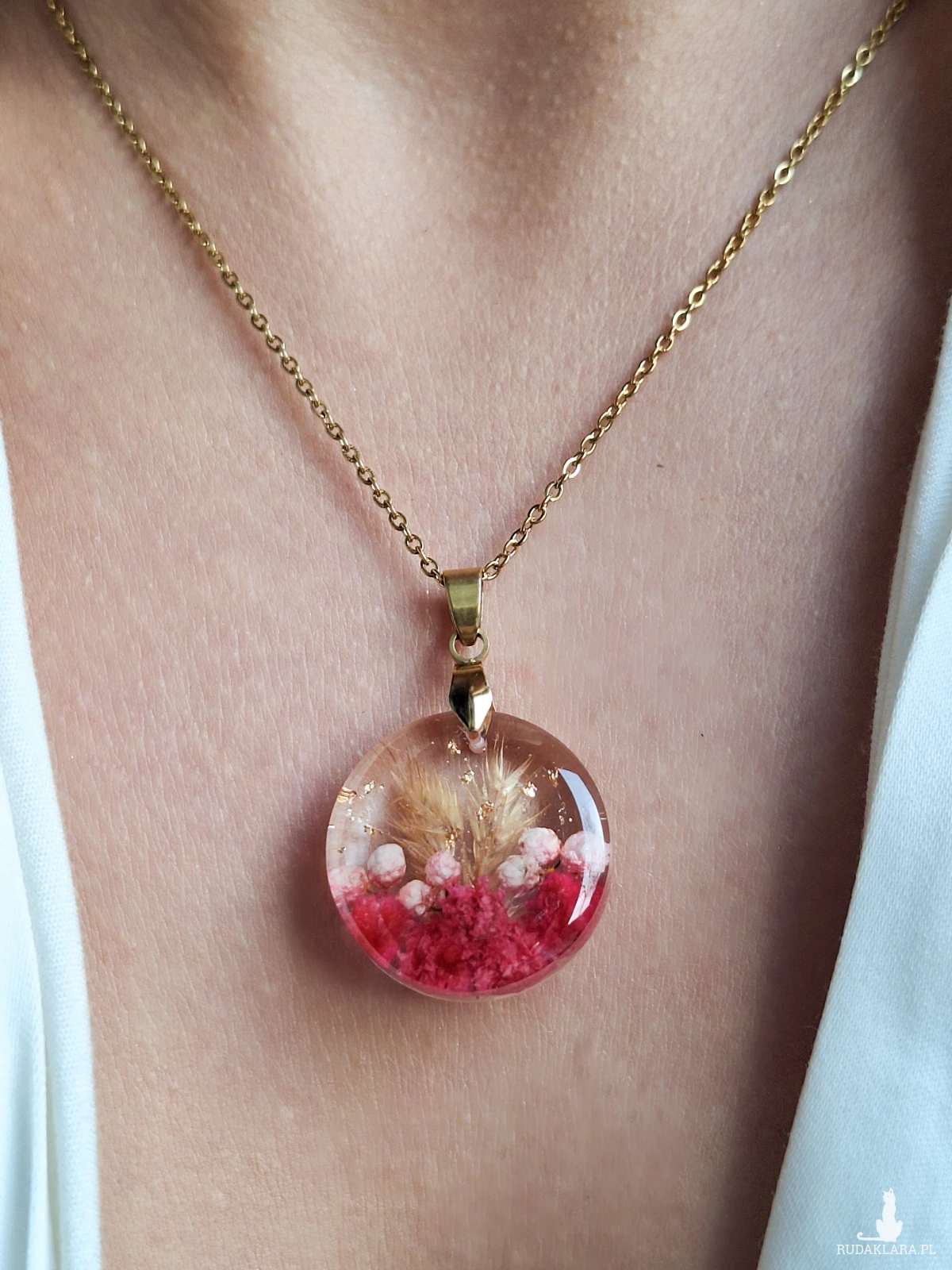 Uroczy wisiorek z zatopionymi kwiatami gipsówki w kolorze fuksji, różowym ozothumnusem, trawą i płatkami złota. Wykonany z wysokiej klasy żywicy, która nie zmienia koloru pod wpływem promieniowania uv oraz wysokiej jakości stali chirurgicznej.