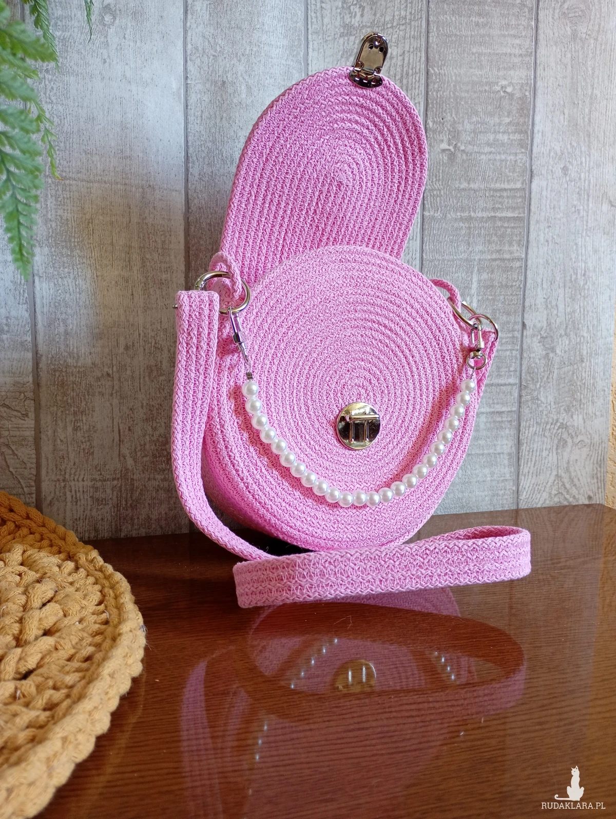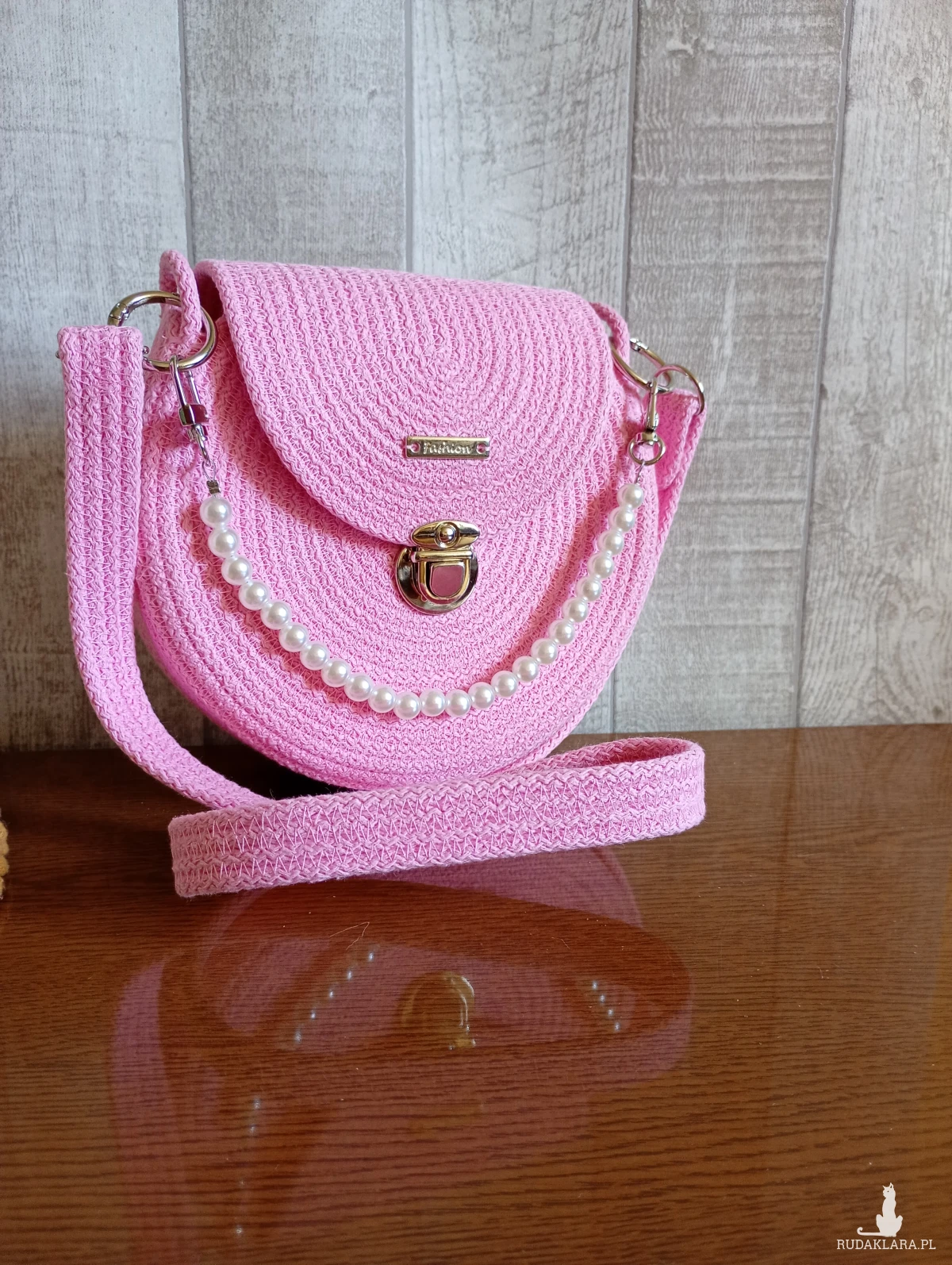 Torebeczka w kolorze różowym ze sznurka przeznaczonego do szycia. Torebeczka dla dziewczynki albo dla mamy 🙂. Bardzo sztywna, dobrze trzyma kształt. Kółka są odpinane, można dowolnie zmieniać uchwyty.