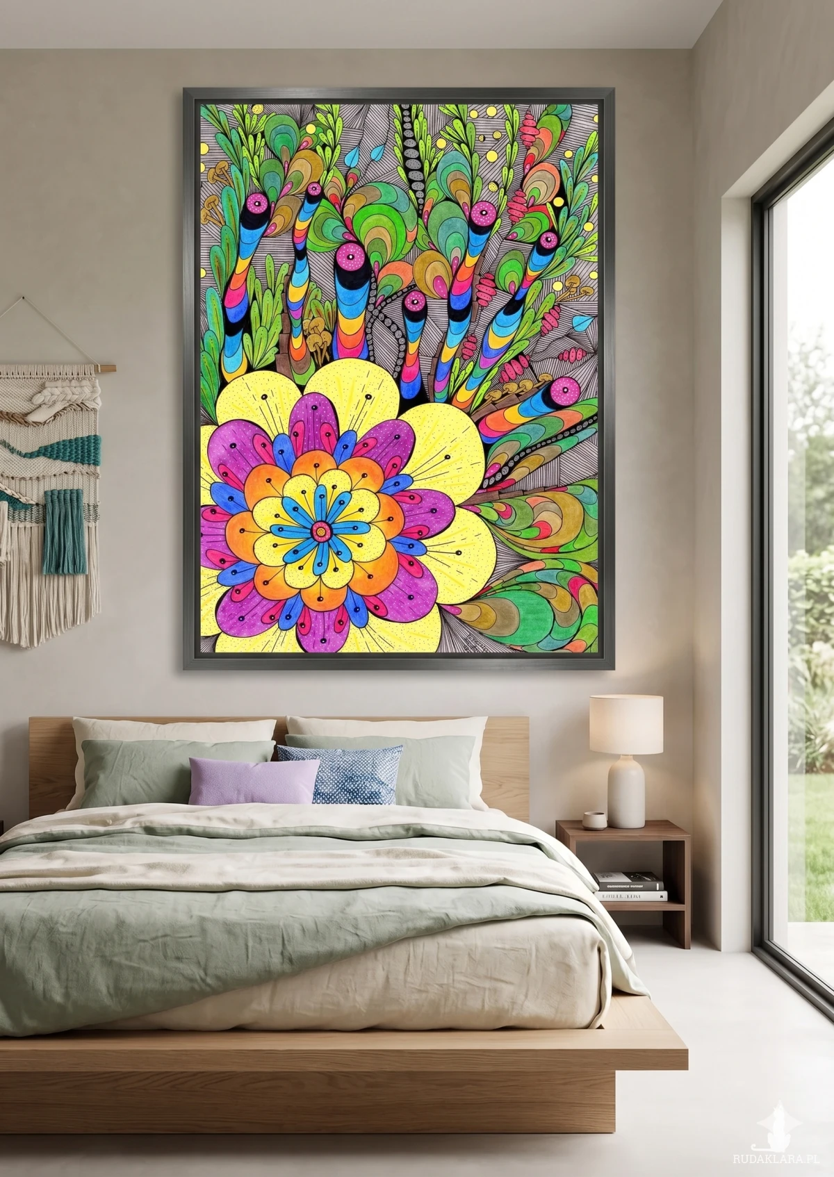 Intensywna, organiczna ilustracja przedstawiająca gęste, fantastyczne zarośla i florę. Na pierwszym planie dominuje ogromny, wielobarwny kwiat (żółć, fiolet, błękit, pomarańcz), który jest otoczony bujną, surrealistyczną roślinnością. W tle wznoszą się smukłe, faliste pędy przypominające egzotyczne pnącza, wypełnione jaskrawymi, kontrastującymi kolorami (zielony, niebieski, różowy). Całość charakteryzuje się liniowym wzornictwem, organicznym chaosem i wibrującą, psychodeliczną energią.