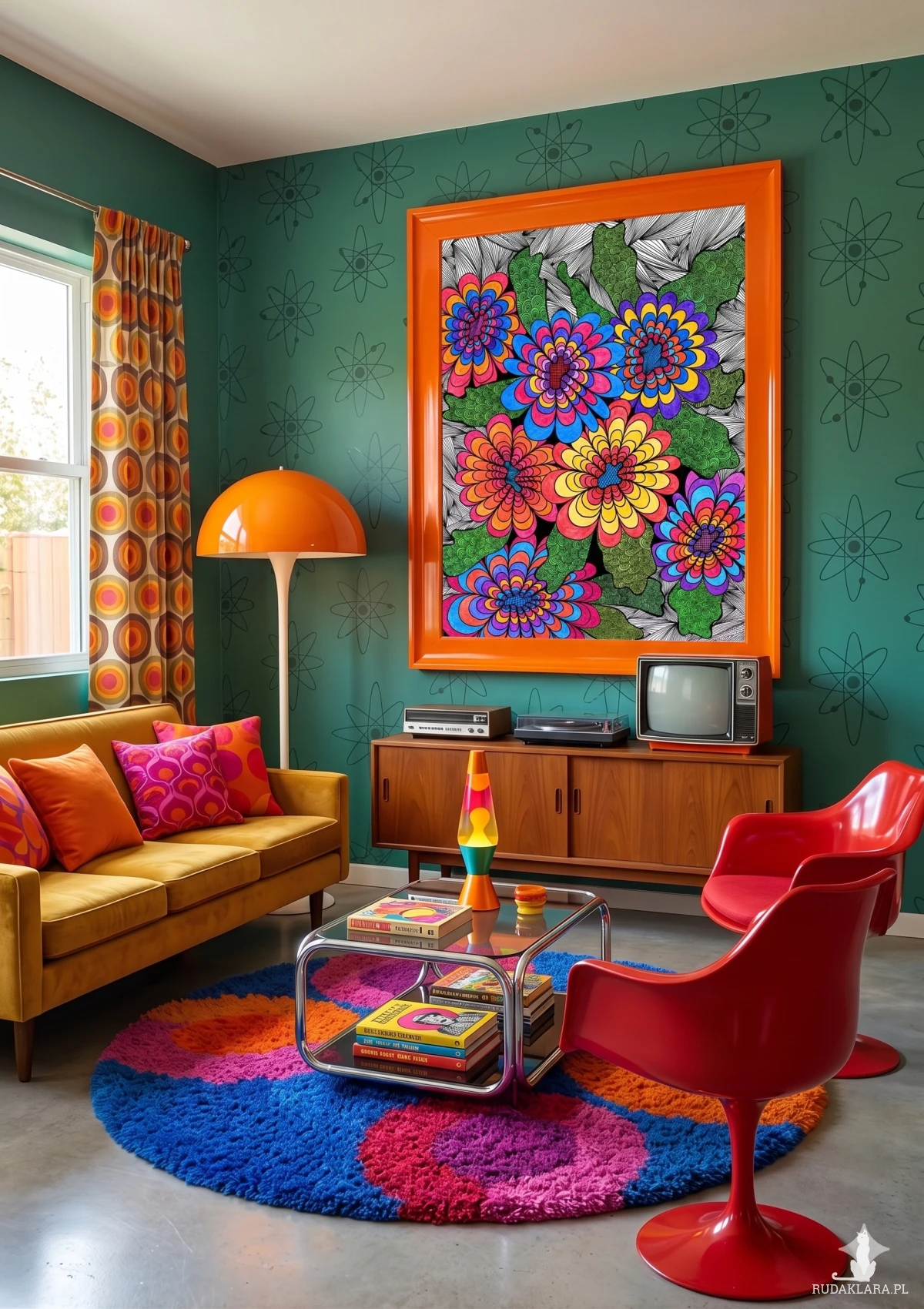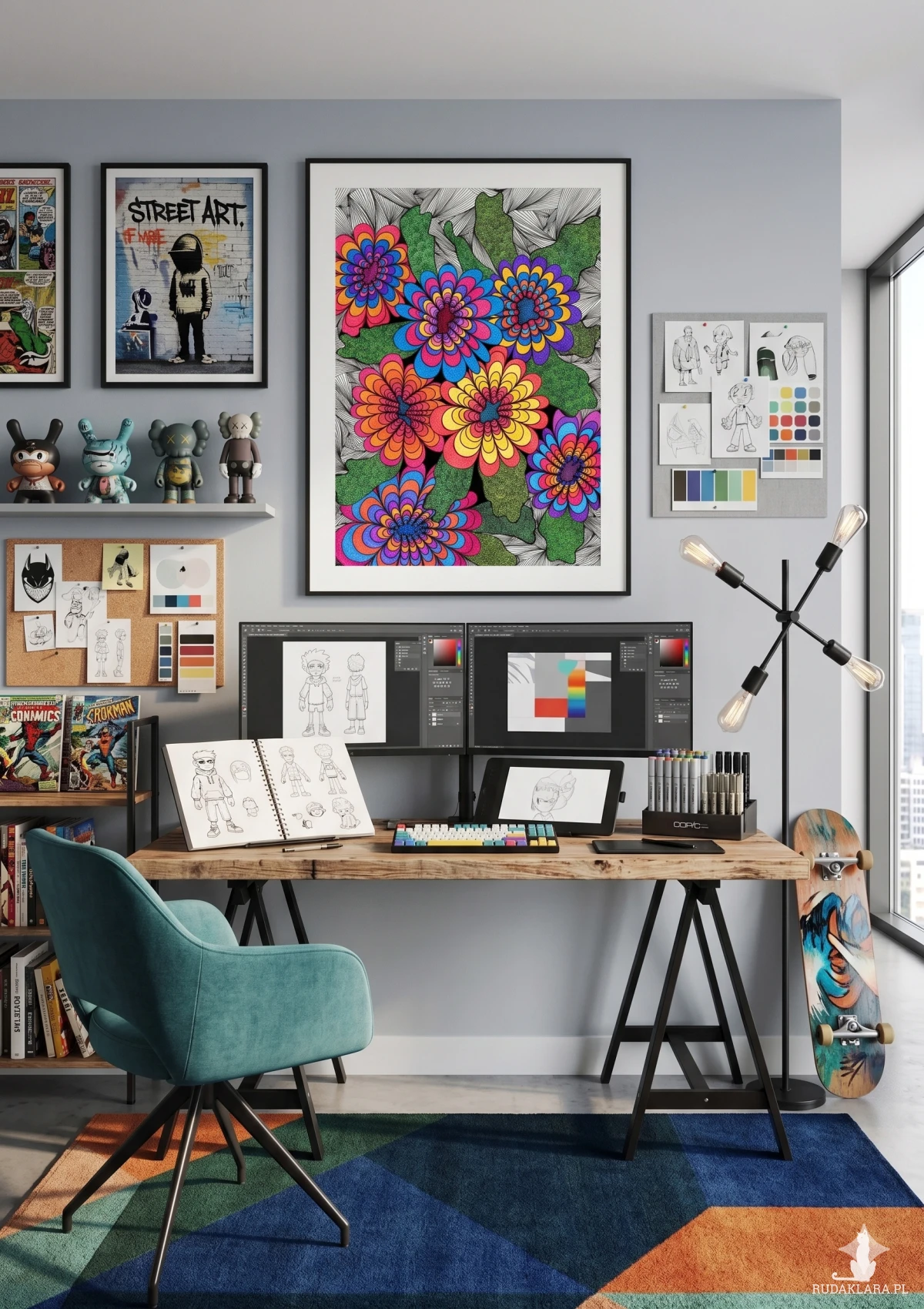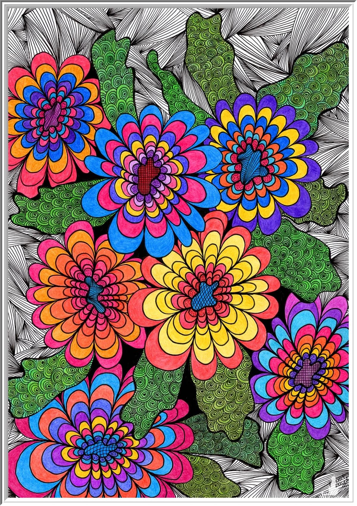 Intensywna, psychodeliczna ilustracja przedstawiająca grupę siedmiu stylizowanych kwiatów, ułożonych ciasno na pierwszym planie. Każdy kwiat charakteryzuje się kontrastowymi, nasyconymi kolorami (błękit, żółć, pomarańcz, purpura, róż), co tworzy efekt wibrującej optycznie feerii barw. Kwiaty otoczone są zielonymi liśćmi wypełnionymi organicznymi spiralnymi wzorami. Całość osadzona jest na gęstym, czarno-białym tle z promieniście rozchodzącymi się liniami, co potęguje wrażenie eksplozji, dynamiki i czystej, nieokiełznanej radości.