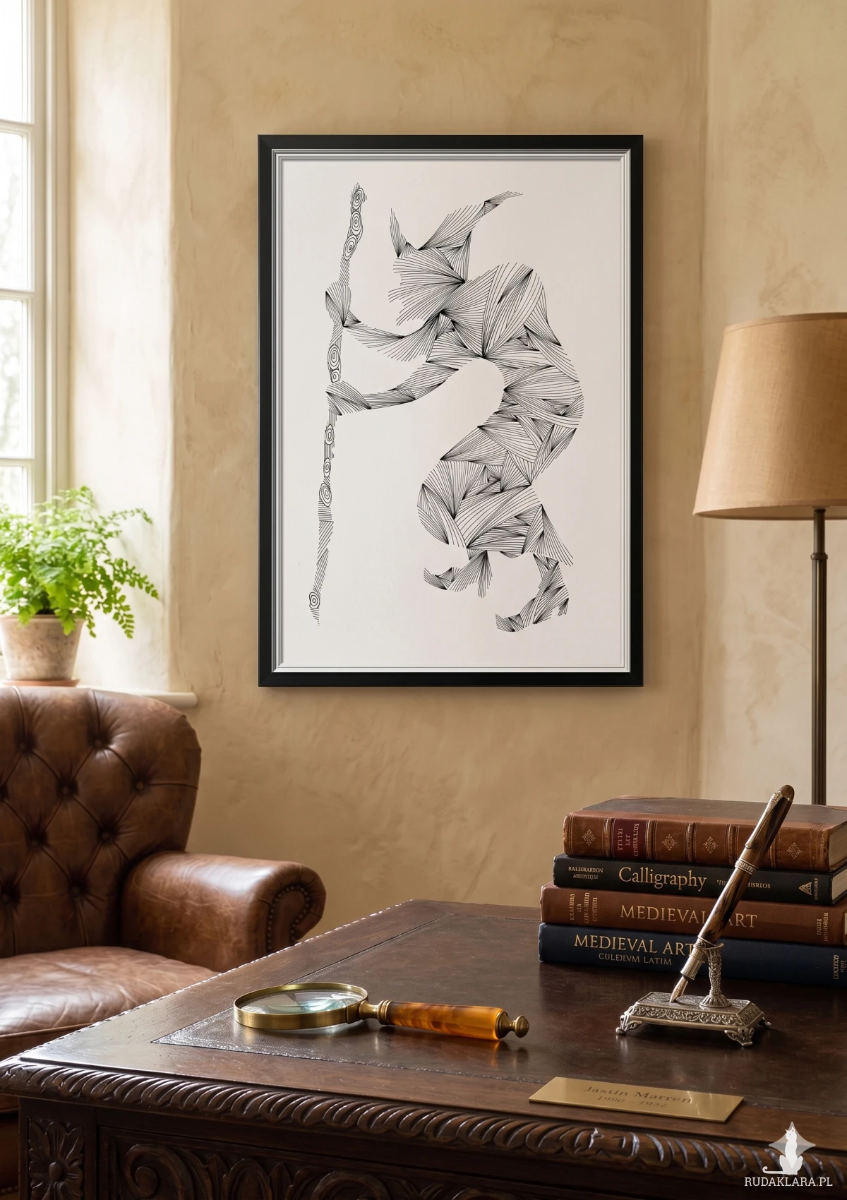 Monochromatyczna, geometryczna ilustracja figuralna przedstawiająca silnie stylizowaną postać wiedźmy. Sylwetka jest zbudowana wyłącznie z ostrych, geometrycznych segmentów i trójkątów, które są wypełnione gęstymi, równoległymi liniami. Laska, również geometryczna, kontrastuje z fragmentacją ciała spiralnymi i koncentrycznymi wzorami. Całość jest osadzona na białym tle, co podkreśla tajemniczość, ruch i analityczną, ukrytą siłę postaci.