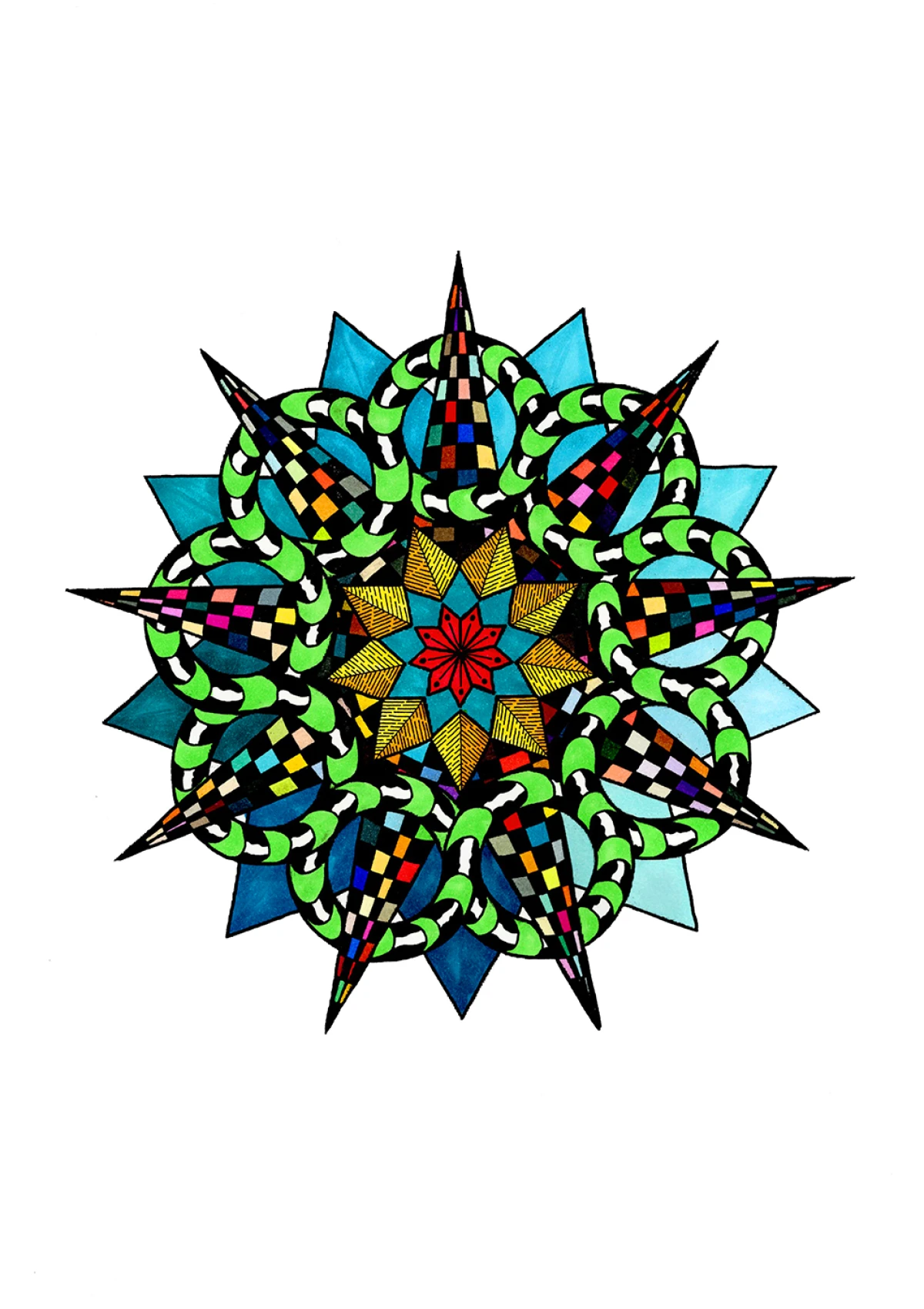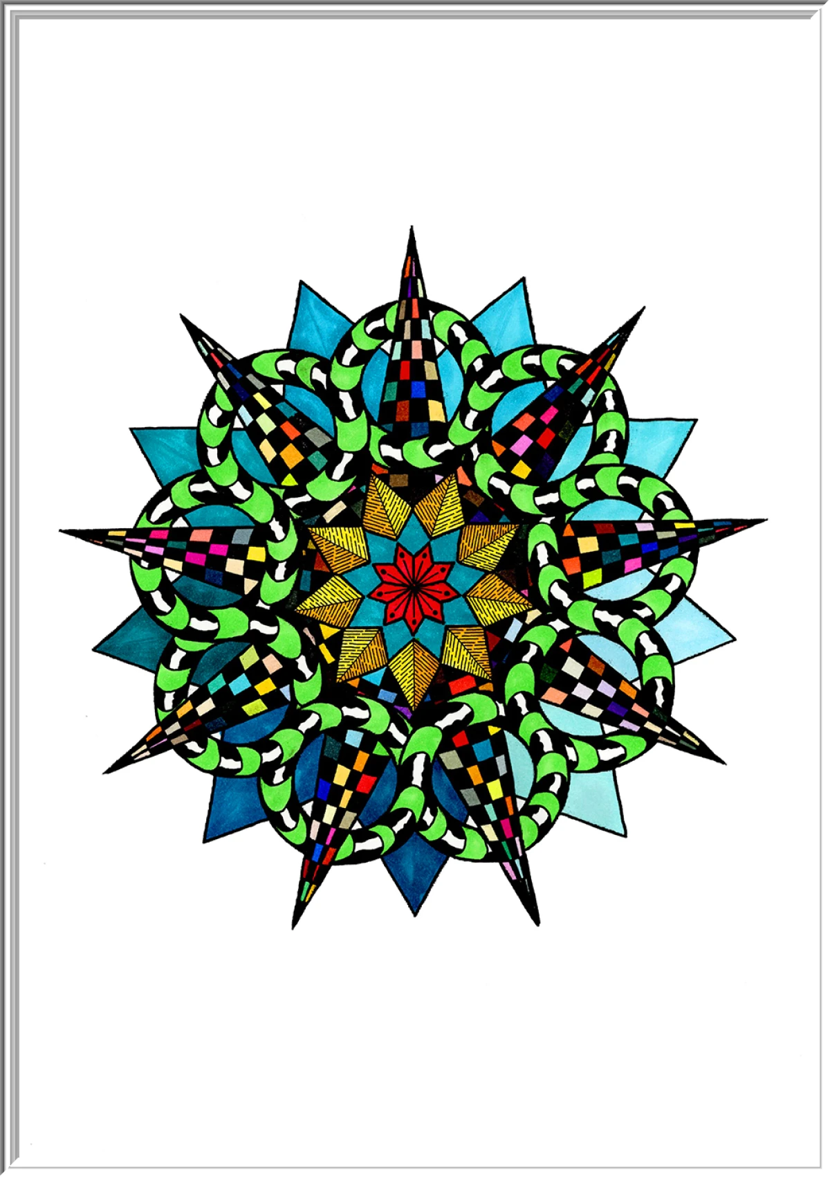 Dynamiczna, geometryczna mandala charakteryzująca się intensywnymi odcieniami szmaragdu, zieleni i turkusu na ostrokątnych, zewnętrznych warstwach. Kompozycja bazuje na symetrycznym układzie stożkowych, strzelistych form z powtarzającym się motywem szachownicy (zielono-czarnej)
