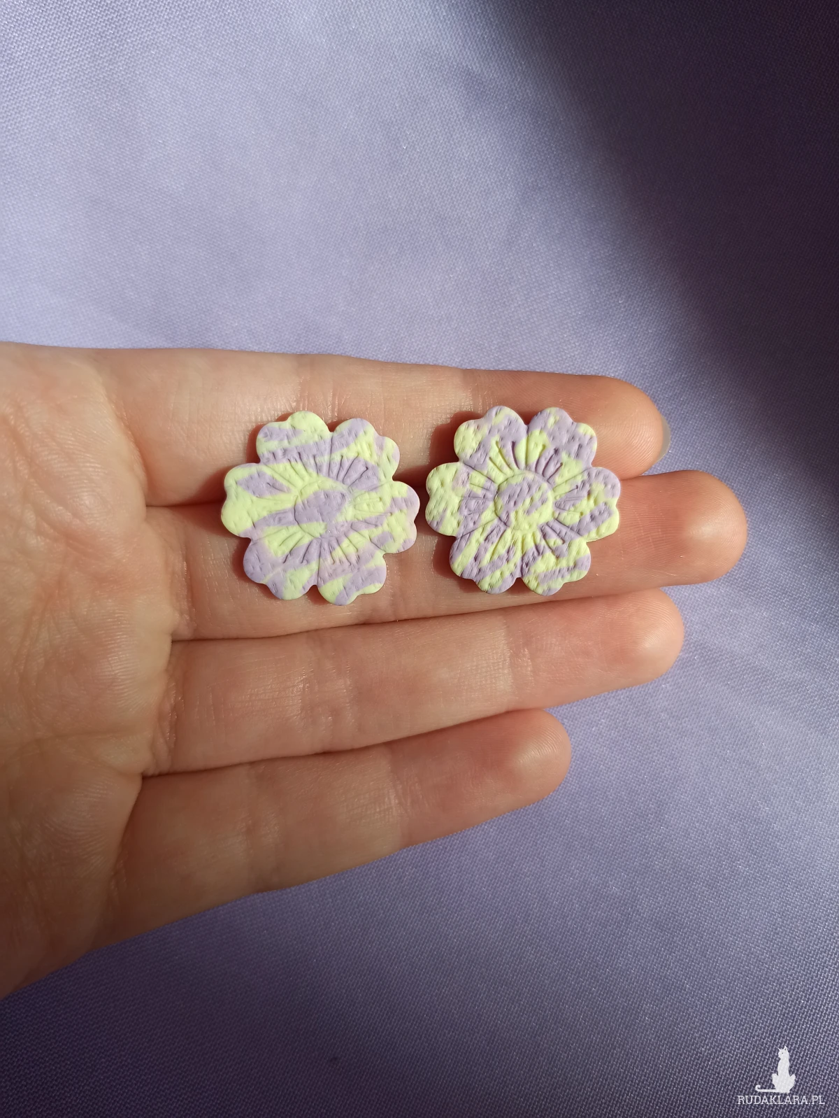 Kolczyki sztyfty w kształcie kwiatów w kolorze pastelowo fioletowym z żółtymi przejściami z widocznymi liniami płatków.
